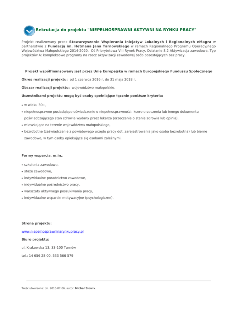 Rekrutacja do projektu "NIEPEŁNOSPRAWNI AKTYWNI NA RYNKU PRACY" Projekt realizowany przez Stowarzyszenie Wspierania Inicjatyw Lokalnych i Regionalnych eMagra w partnerstwie z Fundacją im. Hetmana Jana Tarnowskiego w ramach Regionalnego Programu Operacyjnego Województwa Małopolskiego 2014-2020, Oś Priorytetowa VIII Rynek Pracy, Działanie 8.2 Aktywizacja zawodowa, Typ projektów A: kompleksowe programy na rzecz aktywizacji zawodowej osób pozostających bez pracy. Projekt współfinansowany jest przez Unię Europejską w ramach Europejskiego Funduszu Społecznego Okres realizacji projektu: od 1 czerwca 2016 r. do 31 maja 2018 r. Obszar realizacji projektu: województwo małopolskie. Uczestnikami projektu mogą być osoby spełniające łącznie poniższe kryteria: ● w wieku 30+, ● niepełnosprawne posiadające oświadczenie o niepełnosprawności: ksero orzeczenia lub innego dokumentu poświadczającego stan zdrowia wydany przez lekarza (orzeczenie o stanie zdrowia lub opinia), ● mieszkające na terenie województwa małopolskiego, ● bezrobotne (zaświadczenie z powiatowego urzędu pracy dot. zarejestrowania jako osoba bezrobotna) lub bierne zawodowo, w tym osoby opiekujące się osobami zależnymi. Formy wsparcia, m.in.: ● szkolenia zawodowe, ● staże zawodowe, ● indywidualne poradnictwo zawodowe, ● indywidualne pośrednictwo pracy, ● warsztaty aktywnego poszukiwania pracy, ● indywidualne wsparcie motywacyjne (psychologiczne). Strona projektu: www.niepelnosprawninarynkupracy.pl Biuro projektu: ul. Krakowska 13, 33-100 Tarnów tel.: 14 656 28 00, 533 566 579 Treść utworzona: dn. 2016-07-06, autor: Michał Słowik. Treść zaktualizowano: dn. 2016-07-06, autor: Michał Słowik. Drukuj, Zapisz jako PDF. Wydruk strony: www.uppk.pl/1,glowna/57,aktualnosci/ Data wydruku: 2017-03-08 03:23:22