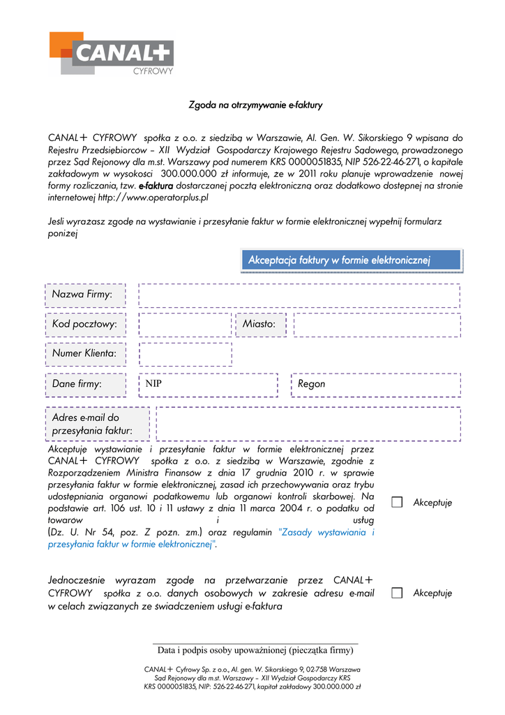 Zgoda na otrzymywanie ee-faktury CANAL+ CYFROWY spółka z o.o. z siedzibą w Warszawie, Al. Gen. W. Sikorskiego 9 wpisana do Rejestru Przedsiębiorców – XII Wydział Gospodarczy Krajowego Rejestru Sądowego, prowadzonego przez Sąd Rejonowy dla m.st. Warszawy pod numerem KRS 0000051835, NIP 526-22-46-271, o kapitale zakładowym w wysokości 300.000.000 zł informuje, że w 2011 roku planuje wprowadzenie nowej formy rozliczania, tzw. e-faktura dostarczanej pocztą elektroniczną oraz dodatkowo dostępnej na stronie internetowej http://www.operatorplus.pl Jeśli wyrażasz zgodę na wystawianie i przesyłanie faktur w formie elektronicznej wypełnij formularz poniżej Akceptacja faktury w formie elektronicznej Nazwa Firmy: Kod pocztowy: Miasto: Numer Klienta: Dane firmy: NIP Regon Adres e-mail do przesyłania faktur: Akceptuję wystawianie i przesyłanie faktur w formie elektronicznej przez CANAL+ CYFROWY spółka z o.o. z siedzibą w Warszawie, zgodnie z Rozporządzeniem Ministra Finansów z dnia 17 grudnia 2010 r. w sprawie przesyłania faktur w formie elektronicznej, zasad ich przechowywania oraz trybu udostępniania organowi podatkowemu lub organowi kontroli skarbowej. Na podstawie art. 106 ust. 10 i 11 ustawy z dnia 11 marca 2004 r. o podatku od towarów i usług (Dz. U. Nr 54, poz. Z późn. zm.) oraz regulamin "Zasady wystawiania i przesyłania faktur w formie elektronicznej". Jednocześnie zgodę na przetwarzanie przez CANAL+ CYFROWY spółka z o.o. danych osobowych w zakresie adresu e-mail w celach związanych ze świadczeniem usługi e-faktura Akceptuję wyrażam ____________________________________________ Data i podpis osoby upowaŜnionej (pieczątka firmy) CANAL+ Cyfrowy Sp. z o.o., Al. gen. W. Sikorskiego 9, 02-758 Warszawa Sąd Rejonowy dla m.st. Warszawy – XII Wydział Gospodarczy KRS KRS 0000051835, NIP: 526-22-46-271, kapitał zakładowy 300.000.000 zł Akceptuję Zasady wystawiania wystawiania i przesyłania faktur w formie elektronicznej 1. Podstawa prawna wystawiania i przesyłania faktur w formie elektronicznej jest rozporządzenie Ministra Finansów z dnia 17 grudnia 2010 r. (Dz. U. Nr 54, poz. Z późn. zm.), zwane dalej rozporządzeniem. 2. CANAL+ CYFROWY spółka z o.o. wystawia i przesyła faktury w formie elektronicznej gwarantując autentyczność ich pochodzenia oraz integralność ich treści. 3. Formatem faktury w formie elektronicznej jest PDF (Portable Document Format). 4. Akceptacja powinna zawierać dane pozwalające zidentyfikować Klienta, akceptacja może być wyrażona w formie pisemnej lub w formie elektronicznej. 5. Klient może przekazać CANAL+ CYFROWY prawidłowo wypełniony formularz akceptacji za pomocą następujących kanałów komunikacji: korespondencyjnie na adres CANAL+ CYFROWY spółka z o.o. al. gen. W. Sikorskiego 9 0202-758 Warszawa lub elektronicznie na adres [email protected] 6. Klient jest uprawniony do wycofania akceptacji zgodnie z § 3 ust. 2 rozporządzenia. W przypadku wycofania akceptacji według wzoru oświadczenia udostępnionego przez CANAL+ CYFROWY spółka z o.o. Klient powinien powiadomić o wycofaniu akceptacji do dnia poprzedzającego rozpoczęcie następnego okresu rozliczeniowego. 7. Wycofanie akceptacji wymaga podania danych identyfikacyjnych Klienta zgodnie ze wzorem „wycofania akceptacji” przygotowanym przez CANAL+ CYFROWY spółka z o.o. 8. Akceptacja nie wyłącza prawa CANAL+ CYFROWY spółka z o.o. do wystawiania i przesyłania faktur w formie papierowej. 9. Klient zobowiązany jest do przechowywania otrzymanych faktur w sposób określony w § 6 rozporządzenia. 10. Faktura w formie elektronicznej będzie dostarczana na wskazany adres poczty elektronicznej, pod warunkiem wyrażenia przez klienta zgody na przetwarzanie przez CANAL+ CYFROWY tego adresu w celu przesyłania faktury. CANAL+ dodatkowo zamieści fakturę na stronie http://www.operatorplus.pl w panelu SYSTEM C+, gdzie po zalogowaniu klient będzie mógł obejrzeć fakturę i ściągnąć. ____________________________________________ Data i podpis osoby upoważnionej (pieczątka firmy) CANAL+ Cyfrowy Sp. z o.o., Al. gen. W. Sikorskiego 9, 02-758 Warszawa Sąd Rejonowy dla m.st. Warszawy – XII Wydział Gospodarczy KRS KRS 0000051835, NIP: 526-22-46-271, kapitał zakładowy 300.000.000 zł