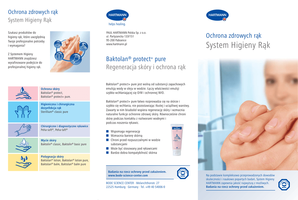 Ochrona zdrowych rąk System Higieny Rąk Szukasz produktów do higieny rąk, które uwzględnią Twoje profesjonalne potrzeby i wymagania? Z Systemem Higieny HARTMANN znajdziesz wyrafinowane podejście do profesjonalnej higieny rąk. Ochrona skóry Baktolan® protect, Baktolan® protect+ pure. Higieniczna i chirurgiczna dezynfekcja rąk Sterillium® classic pure helps healing. PAUL HARTMANN Polska Sp. z o.o. ul. Partyzancka 133/151 95-200 Pabianice www.hartmann.pl Ochrona zdrowych rąk System Higieny Rąk Baktolan® protect+ pure Regeneracja skóry i ochrona rąk Baktolan® protect+ pure jest wolną od substancji zapachowych emulsją wody w oleju w wodzie. Łączy właściwości emulsji szybko wchłaniającej się O/W i ochronnej W/O. Baktolan® protect+ pure łatwo rozprowadza się na skórze i szybko się wchłania, nie pozostawiając tłustej i uciążliwej warstwy. Zawarty w nim bisabolol wspiera regenerację skóry i wzmacnia naturalne funkcje ochronne zdrowej skóry. Równocześnie chroni skórę podczas kontaktu z roztworami wodnymi i podczas noszenia rękawic. Chirurgiczne i diagnostyczne rękawice Peha-soft®, Peha-taft® Mycie skóry Baktolin® classic, Baktolin® basic pure I Wspomaga regenerację I Wzmacnia barierę skórną I Chroni przed rozpuszczalnymi w wodzie substancjami I Może być stosowany pod rękawicami I Bardzo dobra kompatybilność skórna Pielęgnacja skóry Baktolan® lotion, Baktolan® lotion pure, Baktolan® balm, Baktolan® balm pure Badania na rzecz ochrony przed zakażeniem. www.bode-science-center.com BODE SCIENCE CENTER · Melanchthonstr. 27 22525 Hamburg · Germany · Tel. +49 40 54006-0 Na podstawie kompleksowo przeprowadzonych dowodów skuteczności i naukowo popartych badań, System Higieny HARTMANN zapewnia jakość najwyższą z możliwych. Badania na rzecz ochrony przed zakażeniem. Systematyczna higiena rąk Doskonała pielęgnacja rąk Jak korzystać ze szklanego pilnika do paznokci 1. Paznokcie należy piłować wyłącznie, gdy są suche – paznokcie mokre są miękkie i pękają przy piłowaniu. 2. Paznokcie powinno się piłować w obie strony. Szczególną uwagę należy zwrócić na to, aby nadać im okrągły kształt. 3. Należy dokładnie wygładzić wszystkie krawędzie paznokci. Pozwoli to uniknąć zaczepiania bądź nawet niszczenia odzieży. Twoje ręce są najbardziej cennym narzędziem narażonym na codzienny stres w pracy , a także w czasie wolnym. Ręce są także wizytówką, szczególnie w środowisku, gdzie wymagane jest maksimum higieny. Zadbane dłonie to więcej niż kwestia wyglądu – to także kwestia bezpieczeństwa. Tylko zdrową skórę można właściwie zdezynfekować i tylko dobrze obcięte paznokcie nie pozostawiają żadnej przestrzeni dla wzrostu mikroorganizmów. Profesjonalna pielęgnacja dłoni jest ważnym elementem higieny rąk i ochrony pracowników. Szczególną uwagę należy zwrócić także na pielęgnację paznokci: paznokcie powinny być czyste, krótkie, obcięte równo z opuszkami palców. Nie powinny być kruche czy łamliwe - pęknięte paznokcie są idealną kryjówką dla drobnoustrojów. Dzięki szklanemu pilnikowi będziesz mieć ładne i zdrowe paznokcie. 4. Zalecana długość paznokci u pracowników medycznych wynosi 0,5 cm. 5. W celu ochrony pilnika przed brudem i kurzem należy przechowywać go w pokrowcu. Pilnik każdorazowo po użyciu należy dezynfekować preparatem do dezynfekcji powierzchni na bazie alkoholu (np. Bacillol® AF lub Bacillol® Tissues). Zdrowa skóra chroni przed infekcją W profesjonalnym środowisku problemu higieny nie można pozostawić przypadkowi. I Korzystanie z dobrze skomponowanego preparatu do dezynfekcji rąk zawierającego związki zmiękczające skórę, wspiera funkcje ochronne skóry. I Mycie rąk należy przeprowadzać tylko wtedy, gdy ręce są wyraźnie zabrudzone. Częste i wydłużone mycie rąk niszczy ochronny, kwaśny płaszcz skóry i wypłukuje lipidy skórne. I Korzystaj z produktów do pielęgnacji skóry, kiedy tylko jest to możliwe. I Medyczne i diagnostyczne rękawiczki stanowią istotną barierę dla patogenów i zanieczyszczeń. I W przypadku zanieczyszczenia rąk, które wymagałoby mycia, rękawiczki są skuteczną ochroną i pomagają zmniejszyć częstotliwość mycia rąk. I Należy również pamiętać, że dłonie pod rękawiczkami mogą ulec skażeniu, np. w przypadku mikro przekłuć lub podczas zdejmowania rękawiczek – dlatego zawsze po zdjęciu rękawiczek należy natychmiast przeprowadzić dezynfekcję rąk. Akceptacja personelu I ochrona pacjentów. Podrażnienia skóry mogą stanowić ryzyko infekcji, ponieważ nawet najmniejsze pęknięcia lub mikro-urazy stanowią potencjalny rezerwuar patogenów, a uszkodzona skóra nie może zostać skutecznie zdezynfekowana. Korzystanie z produktów do pielęgnacji skóry kilkakrotnie w ciągu dnia pracy może znacznie obniżyć ryzyko wystąpienia podrażnień skóry (1). Ponieważ produkty do ochrony i pielęgnacji skóry dłoni mogą wpływać na skuteczność dezynfekcji (2), tylko produkty z naukowo popartą kompatybilnością stanowią bezpieczną alternatywę. 1 Kampf G, Ennen J. Regular use of a hand cream can attenuate skin dryness and roughness caused by frequent hand washing. BMC Dermatology 2006; 6:1. 2 Schubert R. Zur Kompatibilität von Hautpflege-Cremes mit Hautdesinfektions-Präparaten. Umweltmed; 1982; 3: 56-58 Badania na rzecz ochrony przed zakażeniem.