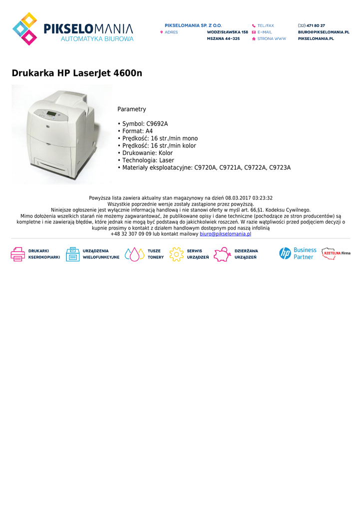 Drukarka HP LaserJet 4600n Parametry • Symbol: C9692A • Format: A4 • Prędkość: 16 str./min mono • Prędkość: 16 str./min kolor • Drukowanie: Kolor • Technologia: Laser • Materiały eksploatacyjne: C9720A, C9721A, C9722A, C9723A Powyższa lista zawiera aktualny stan magazynowy na dzień 08.03.2017 03:23:32 Wszystkie poprzednie wersje zostały zastąpione przez powyższą. Niniejsze ogłoszenie jest wyłącznie informacją handlową i nie stanowi oferty w myśl art. 66,§1. Kodeksu Cywilnego. Mimo dołożenia wszelkich starań nie możemy zagwarantować, że publikowane opisy i dane techniczne (pochodzące ze stron producentów) są kompletne i nie zawierają błędów, które jednak nie mogą być podstawą do jakichkolwiek roszczeń. W razie wątpliwości przed podjęciem decyzji o kupnie prosimy o kontakt z działem handlowym dostępnym pod naszą infolinią +48 32 307 09 09 lub kontakt mailowy [email protected]