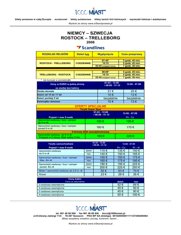 bilety promowe w całej Europie ∙ eurotunnel ∙ bilety autokarowe ∙ bilety tanich linii lotniczych ∙ wycieczki lotnicze i autokarowe Wydruk ze strony www.eSkandynawia.pl NIEMCY – SZWECJA ROSTOCK – TRELLEBORG 2008 ROZKŁAD REJSÓW Dzień tyg. Wypłynięcie Czas przeprawy ROSTOCK - TRELLEBORG CODZIENNIE 07:45* 15:15 5 godz. 45 min. 5 godz. 45 min. 7 godz. 30 min. 22:45 przejazd nocny TRELLEBORG - ROSTOCK CODZIENNIE 08:00* 15:15 5 godz. 45 min. 5 godz. 45 min. 7 godz. 30 min. 22:45 przejazd nocny * nie kursuje w poniedziałki 01.03 - 12.06 i 08.09 - 31.12 Ceny w EURO w jedną stronę 12.06 - 07.09 za osobę bez kabiny 21 € 10 € bezpłatnie 10 € Osoba dorosła Dzieci od 14 do 11 lat Dzieci poniżej 3 lat Zwierzątko domowe 25 € 13 € bezpłatnie 13 € OFERTY SPECJALNE Taryfa Super Spar 01.03 - 12.06 i 08.09 - 31.12 12.06 - 07.09 Pojazd + max 9 osób Samochód osobowy / bus / camper 120 € do 8 m dł. Samochód osobowy / bus / camper 160 € ponad 8 m dł. 5-dniowy bilet oszczędnościowy Samochód osobowy do 6 m dł. 165 € Przejazd w 2 strony. Bilet ważny 5 dni, 01.03 - 12.06 i 08.09 - 31.12 Taryfy samochodowe Pojazd + max 9 osób Samochód osobowy do 6 m dł. Samochód osobowy / bus / camper Max. 8m dł. Samochód osobowy / bus / camper ponad. 8m dł. Motor / samochód osobowy do 2,5 m. dł Rower dzień noc dzień noc dzień noc 110 € 140 € 150 € 165 € 190 € 200 € 55 € 23 € Pn - Cz 130 € 170 € 225 € 12.06 - 07.09 Pn - Cz Pt – N 135 € 150 € 155 € 175 € 195 € 225 € 63 € 26 € 150 € 165 € 175 € 185 € 225 € 250 € 70 € 26 € Ceny kabin Cena za całą kabinę 2-osobowa wewnętrzna 4-osobowa wewnętrzna 2 osobowa zewnętrzna 4-osobowa zewnętrzna dzień noc 42 € 45 € 45 € 50 € 84 € 90 € 90 € 100 € tel. 091 48 88 958 ∙ fax 091 48 88 926 ∙ [email protected] ul.Królowej Jadwigi 11/2 ∙ 70-307 Szczecin ∙ PKO BP SA (Inteligo) 50102055581111127250200064 Bilety wysyłamy emailem, pocztą, kurierem, faxem… Wydruk ze strony www.eSkandynawia.pl
