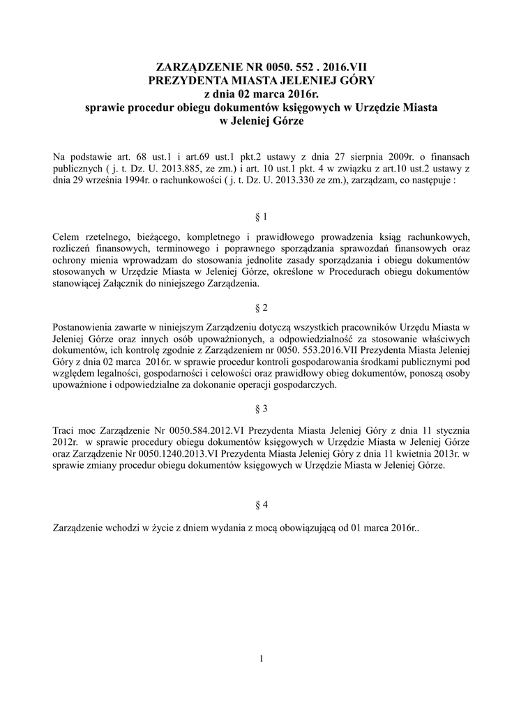 ZARZĄDZENIE NR 0050. 552 . 2016.VII PREZYDENTA MIASTA JELENIEJ GÓRY z dnia 02 marca 2016r. sprawie procedur obiegu dokumentów księgowych w Urzędzie Miasta w Jeleniej Górze Na podstawie art. 68 ust.1 i art.69 ust.1 pkt.2 ustawy z dnia 27 sierpnia 2009r. o finansach publicznych ( j. t. Dz. U. 2013.885, ze zm.) i art. 10 ust.1 pkt. 4 w związku z art.10 ust.2 ustawy z dnia 29 września 1994r. o rachunkowości ( j. t. Dz. U. 2013.330 ze zm.), zarządzam, co następuje : §1 Celem rzetelnego, bieżącego, kompletnego i prawidłowego prowadzenia ksiąg rachunkowych, rozliczeń finansowych, terminowego i poprawnego sporządzania sprawozdań finansowych oraz ochrony mienia wprowadzam do stosowania jednolite zasady sporządzania i obiegu dokumentów stosowanych w Urzędzie Miasta w Jeleniej Górze, określone w Procedurach obiegu dokumentów stanowiącej Załącznik do niniejszego Zarządzenia. §2 Postanowienia zawarte w niniejszym Zarządzeniu dotyczą wszystkich pracowników Urzędu Miasta w Jeleniej Górze oraz innych osób upoważnionych, a odpowiedzialność za stosowanie właściwych dokumentów, ich kontrolę zgodnie z Zarządzeniem nr 0050. 553.2016.VII Prezydenta Miasta Jeleniej Góry z dnia 02 marca 2016r. w sprawie procedur kontroli gospodarowania środkami publicznymi pod względem legalności, gospodarności i celowości oraz prawidłowy obieg dokumentów, ponoszą osoby upoważnione i odpowiedzialne za dokonanie operacji gospodarczych. §3 Traci moc Zarządzenie Nr 0050.584.2012.VI Prezydenta Miasta Jeleniej Góry z dnia 11 stycznia 2012r. w sprawie procedury obiegu dokumentów księgowych w Urzędzie Miasta w Jeleniej Górze oraz Zarządzenie Nr 0050.1240.2013.VI Prezydenta Miasta Jeleniej Góry z dnia 11 kwietnia 2013r. w sprawie zmiany procedur obiegu dokumentów księgowych w Urzędzie Miasta w Jeleniej Górze. §4 Zarządzenie wchodzi w życie z dniem wydania z mocą obowiązującą od 01 marca 2016r.. 1 Załącznik do Zarządzenia Nr 0050.552.2016.VII Prezydenta Miasta Jeleniej Góry z dnia 02 marca 2016r. w sprawie procedur obiegu dokumentów księgowych w Urzędzie Miasta w Jeleniej Górze Procedury obiegu dokumentów księgowych w Urzędzie Miasta w Jeleniej Górze I. Obieg dokumentów 1. Obiegiem dokumentów księgowych jest system przekazywania dokumentów od chwili ich sporządzenia, względnie wpływu do Urzędu z zewnątrz, aż do momentu ich zakwalifikowania i ujęcia w księgach rachunkowych. 2. W celu przestrzegania procedur kontroli dokumentów oraz terminów ich realizacji ustala się następujące zasady obiegu dokumentu: 1) dokumenty zewnętrzne obce przyjmowane w wydziale merytorycznym muszą być opatrzone datą wpływu, 2) wszystkie dokumenty księgowe przed skierowaniem ich do realizacji do Wydziału Finansowego winny być opisane pod względem merytorycznym oraz potwierdzone w zakresie legalności, celowości i gospodarności dokonanego wydatku, a także przez pracownika odpowiedzialnego za stosowanie procedur zamówień publicznych, zgodnie z obowiązującym Zarządzeniem Prezydenta Miasta w sprawie procedur kontroli gospodarowania środkami publicznymi pod względem legalności, gospodarności i celowości, 3) w razie zastrzeżeń, co do poprawności faktury pod względem merytorycznym, formalnorachunkowym oraz zgodności z zawartą umową (zamówieniem lub zleceniem) wydział merytoryczny odmawia akceptacji faktury, o czym informuje w formie pisemnej wykonawcę (dostawcę), podając uzasadnienie odmowy akceptacji i odsyła fakturę, 4) sprawdzone i potwierdzone w zakresie określonym w ppkt.2 dokumenty dotyczące operacji gospodarczych i finansowych należy przekazywać do Wydziału Finansowego na bieżąco i terminowo, 5) w Wydziale Finansowym dokumenty księgowe winny być sprawdzone przez osobę upoważnioną pod względem formalno-rachunkowym i zatwierdzone do wypłaty przez skarbnika Miasta lub osobę upoważnioną oraz Prezydenta Miasta lub osobę upoważnioną, 6) w celu dotrzymania terminu zapłaty, kompletne dokumenty księgowe (tj. m.in. faktury z załączoną umową, zamówieniem, zleceniem, protokołem odbioru) należy przekazywać do Wydziału Finansowego nie później niż trzy dni robocze przed terminem płatności, 7) dokumenty stanowiące podstawę naliczania wynagrodzeń z tytułu umowy o pracę należy przekazywać nie później niż cztery dni robocze przed terminem wypłaty, 8) dokumenty, o których mowa w ppkt. 6 i 7 należy składać do Wydziału Finansowego w oryginale, Wydział Finansowy potwierdza odbiór dokumentów księgowych oraz umieszcza datę wpływu na otrzymanym dokumencie. 2 3. Ustala się następujący tryb działań gospodarczych i administracyjnych powodujących powstanie zobowiązań finansowych: 1) dostawy towarów, usług lub robót budowlanych (w zależności od wartości zamówienia) zamawiane są zgodnie z obowiązującym prawem zamówień publicznych oraz zgodnie z procedurami operacyjnymi o udzielanie zamówień publicznych, przyjętymi w ramach Systemu Zarządzania Jakością w Urzędzie Miasta w Jeleniej Górze, 2) podstawą zawarcia umowy lub dokonania zlecenia (zamówienia) na dostawę towarów, usług lub robót budowlanych są zagwarantowane w planie finansowym środki finansowe na realizację określonego zadania, 3) projekt umowy podlega kontroli przez radcę prawnego, który potwierdza podpisem przeprowadzenie kontroli w zakresie legalności, w tym zgodności z prawem zamówień publicznych oraz powinien być zaparafowany przez naczelnika wydziału merytorycznego lub osobę upoważnioną, 4) każda umowa, zlecenie lub zamówienie rodząca skutki finansowe musi zawierać kontrasygnatę skarbnika Miasta, zastępcy skarbnika Miasta lub głównego księgowego Urzędu , 5) do umów, zleceń lub zamówień na dostawy towarów, usług lub roboty budowlane, które przedkładane są skarbnikowi Miasta, zastępcy skarbnika Miasta lub głównemu księgowemu Urzędu celem kontrasygnaty, należy dołączy