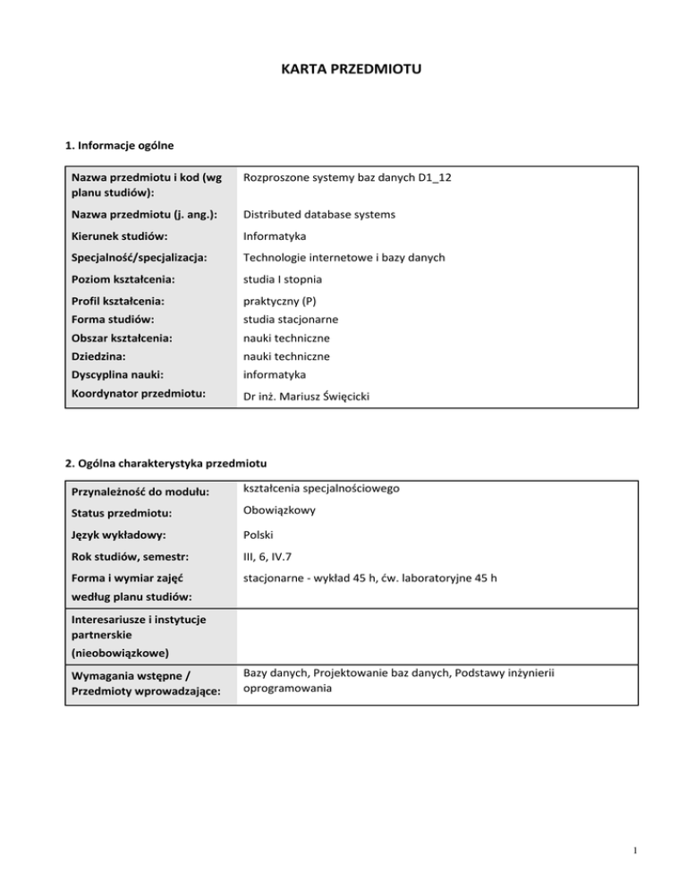 KARTA PRZEDMIOTU 1. Informacje ogólne Nazwa przedmiotu i kod (wg planu studiów): Rozproszone systemy baz danych D1_12 Nazwa przedmiotu (j. ang.): Distributed database systems Kierunek studiów: Informatyka Specjalność/specjalizacja: Technologie internetowe i bazy danych Poziom kształcenia: studia I stopnia Profil kształcenia: praktyczny (P) Forma studiów: studia stacjonarne Obszar kształcenia: nauki techniczne Dziedzina: nauki techniczne Dyscyplina nauki: informatyka Koordynator przedmiotu: Dr inż. Mariusz Święcicki 2. Ogólna charakterystyka przedmiotu Przynależność do modułu: kształcenia specjalnościowego Status przedmiotu: Obowiązkowy Język wykładowy: Polski Rok studiów, semestr: III, 6, IV.7 Forma i wymiar zajęć stacjonarne - wykład 45 h, ćw. laboratoryjne 45 h według planu studiów: Interesariusze i instytucje partnerskie (nieobowiązkowe) Wymagania wstępne / Przedmioty wprowadzające: Bazy danych, Projektowanie baz danych, Podstawy inżynierii oprogramowania 1 3. Bilans punktów ECTS 6 A. Liczba godzin wymagających bezpośredniego udziału nauczyciela (kontaktowych, w czasie rzeczywistym, w tym testy, egzaminy etc) z podziałem na typy zajęć oraz całkowita liczba punktów ECTS osiąganych na tych zajęciach wykład 45 laboratorium 45 egzamin 2 konsultacje 3 W sumie: 100 ECTS 4,5 przygotowanie do kolokwium 5 przygotowanie do laboratorium 5 przygotowanie sprawozdań 0 praca w sieci 0 praca na platformie e-learningowej 5 przygotowanie do egzaminu 10 przygotowanie do konsultacji 2 uzupełnienie/studiowanie notatek 2 studiowanie zalecanej literatury 8 w sumie: 37 ECTS 1,5 laboratorium 45 praca na platformie e-learningowej 5 przygotowanie do kolokwium 10 egzamin 2 ECTS 2,5 B. Poszczególne typy zadań do samokształcenia studenta (niewymagających bezpośredniego udziału nauczyciela) wraz z planowaną średnią liczbą godzin na każde i sumaryczną liczbą ECTS (np. praca w bibliotece, w sieci, na platformie elearningowej, w laboratorium, praca nad projektem końcowym, przygotowanie ogólne; suma poszczególnych godzin powinna zgadzać się z liczbą ogólną) C. Liczba godzin praktycznych/laboratoryjnych w ramach przedmiotu oraz związana z tym liczba punktów ECTS (ta liczba nie musi być powiązana z liczbą godzin kontaktowych, niektóre zajęcia praktyczne/laboratoryjne mogą odbywać się bez udziału nauczyciela): (A+B) stacjonarne Całkowita liczba punktów ECTS (wg planu studiów; 1 punkt =25-30 godzin pracy studenta, w tym praca na zajęciach i poza zajęciami): 4. Opis przedmiotu 2 Cel przedmiotu: Celem przedmiotu jest wykształcenie u studentów umiejętności sprawnego poruszania się w tematyce//kompetencji w zakresie administrowania komputerowymi systemami baz danych, zarówno istniejących jak i projektowanych. Metody dydaktyczne: np. podające (wykład), problemowe (konwersatorium, seminarium), aktywizujące (symulacja, metoda przypadków itp. ), eksponujace (pokaz, film), praktyczne (ćwiczenia, metoda projektów itp) – pełniejszy wykaz poniżej (prosimy wybrać najstosowniejsze - jedną lub więcej, można dodać własne metody) wykład informacyjny, wykład problemowy, pokaz, ćwiczenia laboratoryjne Treści kształcenia (w rozbiciu na formę zajęć (jeśli są różne formy) i najlepiej w punktach): 1. Wprowadzenie do systemów rozproszonych Podstawowe modele obliczeniowe stosowane przy realizacji aplikacji w środowisku rozproszonym. Zarządzanie zasobami w systemie rozproszonym. Zasoby w środowisku rozproszonym, mechanizmy współdzielenia. Zarządca zasobów- architektura klient – serwer, Zarządca zasobów- architektura obiektów rozproszonych, 2. Pojęcia związane z rozproszeniem Metody i narzędzia synchronizacji w rozproszonym środowisku obliczeniowym. Problem synchronizacji czasu, metoda Christina, algorytm Berkley, Pojęcie czasu logicznego, Pojęcie czasu fizycznego, zegar logiczny, Algorytm porządkowania zdarzeń w przestrzeni czasu logicznego, Koordynacja rozproszona, sekcja krytyczna w środowisku rozproszonym, Metody implementacji sekcji krytycznej w środowisku rozproszonym – algorytm centralnego serwera, algorytm rozproszony z wykorzystaniem zegarów logicznych, pierścieniowy algorytm wzajemnego wykluczania, Pojęcie elekcji, algorytm Tyrana, pierścieniowy algorytm elekcji, Pojęcie zwielokrotnia, własności, architektury systemów stosujących zwielokrotnianie 3. Obiektowość w systemach rozproszonych 4. Ochrona danych w systemach rozproszonych. Problem producenta i konsumenta. Problem czytelników i pisarzy. 5. Rozproszona baza danych. Definicja. Przykłady zastosowań. Architektury rozproszonych baz danych. Projektowanie rozproszonych baz danych. Trudności implementacyjne 6. Zapewnienie spójności danych. Replikacja i kopiowanie. Przezroczystość położenia, podziału, replikacji. 7. Transakcje rozproszone. Przetwarzanie transakcji rozproszonych. Zatwierdzanie dwufazowe transakcji rozproszonych (2PC) - schemat, rola koordynatora. Transakcje rozproszone w MS SQL Server. 3 8. Niezgodności schematów i ontologii 9. Federacyjne bazy danych. Osłony i mediatory. Serwery połączone w SQL Server. 10. Dostęp do zdalnych danych w aplikacjach internetowych. Usługi XML Web Services. Definiowanie i przekazywanie złożonych danych. Korzystanie z XML Web Services w aplikacjach typu desktop. Przekazywanie danych w formacie JSON. Definiowanie usług serwera Web. Synchronizacja podręcznej i zdalnej bazy danych. 5. Efekty kształcenia i sposoby weryfikacji Efekty kształcenia (w sumie wymienić ok. od 3 do 9 efektów - podać numery efektów z listy dla danego kierunku/specjalności – opublikowane na stronie uczelni; podać TYLKO te efekty (tam gdzie to możliwe i stosowne w trzech kategoriach, np. kompetencje społeczne mogą nie być realizowane w tym przedmiocie), na których osiągnięcie kładzie się nacisk w ramach przedmiotu, wybrane efekty kierunkowe powinny być bardziej szczegółowo sformułowa