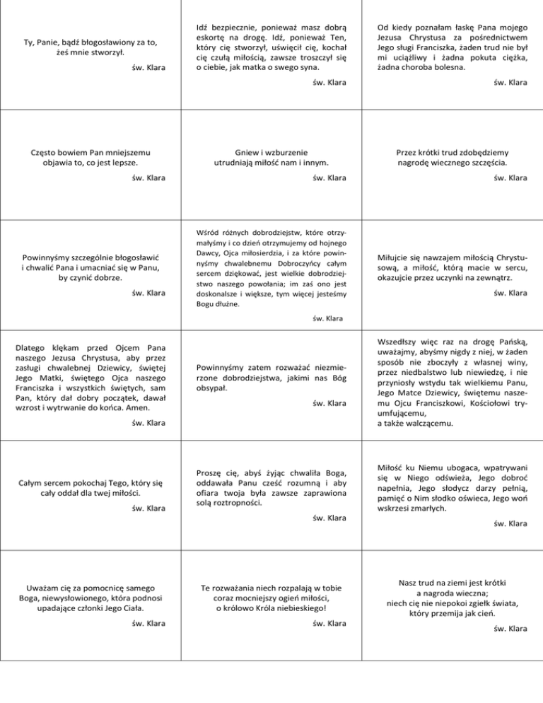 Ty, Panie, bądź błogosławiony za to, żeś mnie stworzył. św. Klara Często bowiem Pan mniejszemu objawia to, co jest lepsze. św. Klara Powinnyśmy szczególnie błogosławić i chwalić Pana i umacniać się w Panu, by czynić dobrze. św. Klara Idź bezpiecznie, ponieważ masz dobrą eskortę na drogę. Idź, ponieważ Ten, który cię stworzył, uświęcił cię, kochał cię czułą miłością, zawsze troszczył się o ciebie, jak matka o swego syna. Od kiedy poznałam łaskę Pana mojego Jezusa Chrystusa za pośrednictwem Jego sługi Franciszka, żaden trud nie był mi uciążliwy i żadna pokuta ciężka, żadna choroba bolesna. św. Klara św. Klara Gniew i wzburzenie utrudniają miłość nam i innym. Przez krótki trud zdobędziemy nagrodę wiecznego szczęścia. św. Klara św. Klara Wśród różnych dobrodziejstw, które otrzymałyśmy i co dzień otrzymujemy od hojnego Dawcy, Ojca miłosierdzia, i za które powinnyśmy chwalebnemu Dobroczyńcy całym sercem dziękować, jest wielkie dobrodziejstwo naszego powołania; im zaś ono jest doskonalsze i większe, tym więcej jesteśmy Bogu dłużne. Miłujcie się nawzajem miłością Chrystusową, a miłość, którą macie w sercu, okazujcie przez uczynki na zewnątrz. św. Klara św. Klara Dlatego klękam przed Ojcem Pana naszego Jezusa Chrystusa, aby przez zasługi chwalebnej Dziewicy, świętej Jego Matki, świętego Ojca naszego Franciszka i wszystkich świętych, sam Pan, który dał dobry początek, dawał wzrost i wytrwanie do końca. Amen. Powinnyśmy zatem rozważać niezmierzone dobrodziejstwa, jakimi nas Bóg obsypał. św. Klara św. Klara Wszedłszy więc raz na drogę Pańską, uważajmy, abyśmy nigdy z niej, w żaden sposób nie zboczyły z własnej winy, przez niedbalstwo lub niewiedzę, i nie przyniosły wstydu tak wielkiemu Panu, Jego Matce Dziewicy, świętemu naszemu Ojcu Franciszkowi, Kościołowi tryumfującemu, a także walczącemu. św. Klara Całym sercem pokochaj Tego, który się cały oddał dla twej miłości. św. Klara Proszę cię, abyś żyjąc chwaliła Boga, oddawała Panu cześć rozumną i aby ofiara twoja była zawsze zaprawiona solą roztropności. św. Klara Uważam cię za pomocnicę samego Boga, niewysłowionego, która podnosi upadające członki Jego Ciała. św. Klara Te rozważania niech rozpalają w tobie coraz mocniejszy ogień miłości, o królowo Króla niebieskiego! św. Klara Miłość ku Niemu ubogaca, wpatrywani się w Niego odświeża, Jego dobroć napełnia, Jego słodycz darzy pełnią, pamięć o Nim słodko oświeca, Jego woń wskrzesi zmarłych. św. Klara Nasz trud na ziemi jest krótki a nagroda wieczna; niech cię nie niepokoi zgiełk świata, który przemija jak cień. św. Klara Z całego serca kochaj Boga i Jezusa, Jego Syna, za nas grzesznych ukrzyżowanego; niech pamięć o Nim nie opuszcza nigdy twoich myśli. św. Klara Módlmy się do Boga za siebie nawzajem; jeśli bowiem każda z nas będzie wzajemnie dźwigać brzemię miłości, łatwo wypełnimy prawo Chrystusowe. Amen. św. Klara Spoglądaj w niebo, które nas zaprasza, weź krzyż i idź za Chrystusem, który nas poprzedza, albowiem przez Niego wejdziemy do Jego chwały po wielu różnych utrapieniach. św. Klara Rozmyślaj ciągle o tajemnicach krzyża i o boleściach Matki stojącej pod krzyżem. Módl się i czuwaj zawsze. św. Klara św. Klara Próżne obrazy zwodniczego świata niech cię nie oszukują, na syk piekła zatkaj uszy i jego zakusy dzielnie odpieraj. św. Klara Błogosławię was za mego życia i po mojej śmierci, jak tylko mogę i więcej niż mogę, wszystkimi błogosławieństwami, jakimi Ojciec miłosierdzia błogosławił i będzie błogosławił swoim synom i córkom duchowym w niebie i na ziemi, i jakimi błogosławił i będzie błogosławić każdy ojciec i każda matka duchowa swoim synom i córkom duchowym. Amen. Przeciwności znoś chętnie, a pomyślność niech cię nie wynosi; ta bowiem domaga się wiary, tamte wiarę usuwają. św. Klara Kochajcie zawsze Boga i swoje dusze i wszystkie swoje siostry, i zachowujcie starannie to, co przyrzekłyście Panu. Pan niech będzie zawsze z wami i obyście wy zawsze z Nim były. Amen. św. Klara św. Klara Ojcze Święty, pod żadnym warunkiem i nigdy na wieki, nie chcę być zwolniona z naśladowania Chrystusa. św. Klara Wpatruj się w Niego (Jezusa), rozmyślaj o Nim, uwielbiaj i staraj się Go naśladować. św. Klara Daję wam zapewnienie, że nie ucierpicie żadnego zła, tylko zawierzcie Chrystusowi Panu! św. Klara Cieszcie się bardzo i radujcie, niech was napełnia ogromne wesele i radość duchowa. św. Klara Dziękuję Bogu, ponieważ zostałam wysłuchana w mojej trosce o ciebie. św. Klara Jeśli będziesz z Nim cierpieć, będziesz z Nim królować; jeśli będziesz dzielić z Nim ból, będziesz dzielić radość; jeśli będziesz umierała z Nim na krzyżu męczeńskim, będziesz mieszkała z Nim w niebie w chwale świętych. św. Klara Jeśli się kocha rzeczy doczesne, traci się owoce miłości. św. Klara Wzrastajcie z dobrego w lepsze, z cnót w cnoty, aby Ten, któremu służycie całym stęsknionym sercem, raczył wam udzielić upragnionej nagrody. św. Klara Cieszymy się z dobra wszystkiego, które Pan sprawia w tobie swą łaską. św. Klara Przestrzegaj, czego przestrzegasz, czyń, co czynisz, i nie ustawaj, lecz krokiem szybkim i lekkim, nie urażając stopy, żeby nie przylgnął do niej nawet pył, podążaj bezpiecznie z radością, ochoczo i ostrożnie ścieżką szczęśliwości. O błogosławione ubóstwo! Ono miłujących je serdecznie obdarza wiecznymi bogactwami. Ciesz się zatem zawsze w Panu i nie pozwól, by cię ogarnęła chmura goryczy św. Klara św. Klara Raduję się tym bardziej w Panu, bo znam ciebie i uważam, że cudownie uzupełniasz braki moje i innych sióstr w naśladowaniu ubogiego i pokornego Jezus Chrystusa. Klara, pokorna i niegodna służka Chrystusa i służebn