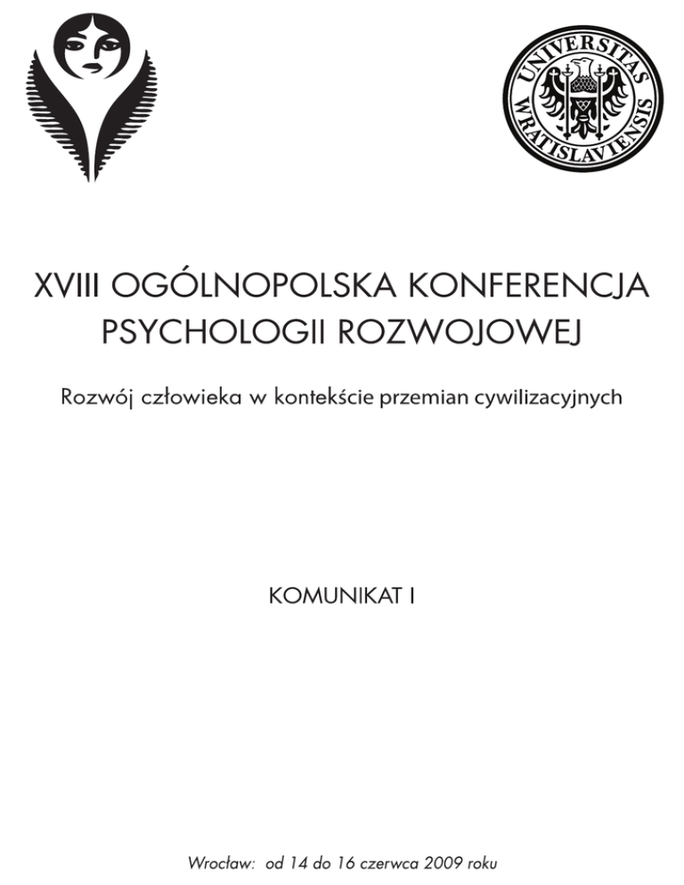 Sekcja Psychologii Rozwojowej PTP i Instytut Psychologii Uniwersytetu Wrocławskiego mają zaszczyt zaprosić Państwa do udziału w XVIII Ogólnopolskiej Konferencji Psychologii Rozwojowej, która odbędzie się we Wrocławiu w dniach: 14-16 czerwca 2009 roku. Proponowany tytuł Konferencji: Rozwój człowieka w kontekście przemian cywilizacyjnych jest zaproszeniem do pierwszego podsumowania wcześniejszych prognoz i nastrojów „milenijnych”. Niektóre z nich okazały się całkowicie chybione, inne zrealizowały się w skali i tempie przekraczającym najśmielsze oczekiwania. Otwierane były granice między państwami, Internet sięgnął najdalszych krańców Ziemi, a zwykli ludzie zaczęli masowo wybierać nowe formy aktywności życiowej. Przemiany cywilizacyjne zasadniczo zmieniły charakter tego, co nazwaliśmy kulturowym kontekstem rozwoju człowieka. Konferencja ma zachęcić uczestników do zaplanowania swych wystąpień w tym właśnie kontekście tematycznym. Żywimy nadzieję, że stworzy ona okazję do interesującej wymiany myśli i poglądów oraz lepszego wzajemnego poznania. Przewidujemy zróżnicowane formy wystąpień. Będą to wykłady plenarne prowadzone przez gości zaproszonych przez Komitet Programowy, sympozja tematyczne, sesje plakatowe i warsztaty zgłoszone przez uczestników konferencji. Wstępnie proponujemy następujące tematy, które mogą stać się początkiem przygotowania sympozjów czy też indywidualnych wystąpień: Wielość kulturowych źródeł rozwoju człowieka Tożsamość i samorealizacja w kontekstach międzykulturowych i podmiotowych Nowe wyznaczniki młodości, dorosłości i starości Adaptacja i zaburzenia w funkcjonowaniu człowieka Rozwój w kontekście nowych form komunikowania się ludzi Realny czy wirtualny rozwój podmiotu w erze „Rewolucji Podmiotów” Praktyczne zastosowania aktualnego stanu wiedzy o ludzkim rozwoju Formularz zgłoszeniowy uczestnictwa w XVIII Ogólnopolskiej Konferencji Psychologii Rozwoju zostanie przesłany wraz z Komunikatem II. Koszty udziału w konferencji: Opłata konferencyjna wpłacona do dnia 31 marca 2009 r. wynosi: 610 PLN Opłata konferencyjna dla członków Sekcji Psychologii Rozwojowej PTP wynosi: 560 PLN Opłata konferencyjna ulgowa dla studentów i doktorantów (opłata nie obejmuje udziału w imprezach towarzyszących, to znaczy: w bankiecie i kolacji) wynosi 420 PLN Uwaga! Wniesienie opłaty po terminie 31 marca 2009 r. podwyższa jej wysokość o 50 PLN Numer konta, na który należy dokonać opłaty wpisowej, podany zostanie w Komunikacie II. W ramach opłaty konferencyjnej przysługują uczestnikom: materiały konferencyjne, kawa/herbata w przerwach obrad, obiady, bankiet w pierwszym dniu Konferencji, kolacja pożegnalna oraz sfinansowanie publikacji w czasopiśmie Psychologia Rozwojowa. W komunikacie II podamy Państwu adresy, telefony oraz stawki hoteli znajdujących się w pobliżu miejsca obrad. Zachęcamy Państwa do odwiedzania naszej internetowej strony konferencyjnej, na której będziemy umieszczać wszystkie bieżące informacje (formularz zgłoszeniowy, opłata i numer konta oraz noclegi): www.okprXVIII.pl lub www.okpr.pl Komitet Programowy: Przewodnicząca: dr hab. Anna Oleszkowicz Członkowie: dr Zbigniew Łoś, sekretarz prof. dr hab. Maria Kielar-Turska prof. UWr, dr hab.Maria Straś-Romanowska prof. UJ, dr hab. Adam Niemczyński prof. dr hab. Janusz Trempała dr Alicja Senejko Adres do korespondencji: Instytut Psychologii U.Wr. 50-527 Wrocław, ul. Dawida 1 tel. (71)367-20-01 w. 143, 144 fax: (71) 367-18-14 e-mail: [email protected] Komitet Organizacyjny: Przewodnicząca: dr hab. Danuta Borecka-Biernat Członkowie: dr Dagmara Łupicka-Szczęśnik, sekretarz dr Joanna Piskorz, sekretarz dr Dorota Chmielewska-Łuczak dr Magdalena Żurko mgr Anna Cieślik mgr Magdalena Narkiewicz Maciej Michalski Darek Niemczuk