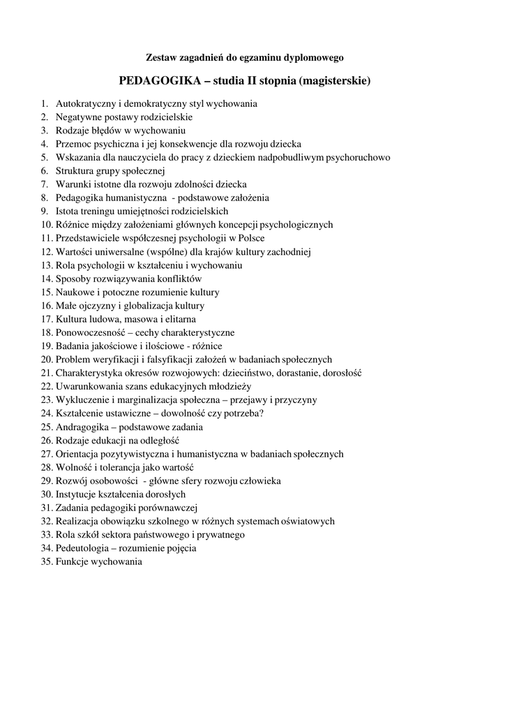 Zestaw zagadnień do egzaminu dyplomowego PEDAGOGIKA – studia II stopnia (magisterskie) 1. Autokratyczny i demokratyczny styl wychowania 2. Negatywne postawy rodzicielskie 3. Rodzaje błędów w wychowaniu 4. Przemoc psychiczna i jej konsekwencje dla rozwoju dziecka 5. Wskazania dla nauczyciela do pracy z dzieckiem nadpobudliwym psychoruchowo 6. Struktura grupy społecznej 7. Warunki istotne dla rozwoju zdolności dziecka 8. Pedagogika humanistyczna - podstawowe założenia 9. Istota treningu umiejętności rodzicielskich 10. Różnice między założeniami głównych koncepcji psychologicznych 11. Przedstawiciele współczesnej psychologii w Polsce 12. Wartości uniwersalne (wspólne) dla krajów kultury zachodniej 13. Rola psychologii w kształceniu i wychowaniu 14. Sposoby rozwiązywania konfliktów 15. Naukowe i potoczne rozumienie kultury 16. Małe ojczyzny i globalizacja kultury 17. Kultura ludowa, masowa i elitarna 18. Ponowoczesność – cechy charakterystyczne 19. Badania jakościowe i ilościowe - różnice 20. Problem weryfikacji i falsyfikacji założeń w badaniach społecznych 21. Charakterystyka okresów rozwojowych: dzieciństwo, dorastanie, dorosłość 22. Uwarunkowania szans edukacyjnych młodzieży 23. Wykluczenie i marginalizacja społeczna – przejawy i przyczyny 24. Kształcenie ustawiczne – dowolność czy potrzeba? 25. Andragogika – podstawowe zadania 26. Rodzaje edukacji na odległość 27. Orientacja pozytywistyczna i humanistyczna w badaniach społecznych 28. Wolność i tolerancja jako wartość 29. Rozwój osobowości - główne sfery rozwoju człowieka 30. Instytucje kształcenia dorosłych 31. Zadania pedagogiki porównawczej 32. Realizacja obowiązku szkolnego w różnych systemach oświatowych 33. Rola szkół sektora państwowego i prywatnego 34. Pedeutologia – rozumienie pojęcia 35. Funkcje wychowania Specjalność - Pedagogika resocjalizacyjna 1. Przydatność nauczania i szkolenia zawodowego w procesie resocjalizacji jednostek nieprzystosowanych społecznie 2. Funkcje kształcenia osób nieprzystosowanych społecznie 3. Pojęcie normy i patologii w zachowaniach ludzkich 4. Pojęcie oraz istota przemocy 5. Przestępczość nieletnich – przyczyny i charakterystyka 6. Znaczenie diagnozy resocjalizacyjnej 7. Procedury, zasady i metody wychowania resocjalizacyjnego 8. Ustawa o postępowaniu w sprawach nieletnich a kodeks karny 9. Scharakteryzuj pożądane w procesie resocjalizacyjnym cechy wychowawcy 10. Mechanizmy socjalizacji i przystosowania społecznego 11. Model kurateli sądowej w Polsce Specjalność - Edukacja wczesnoszkolna 1. Rola nauczyciela w teorii Piageta i w teorii Wygotskiego 2. Tendencje w wychowaniu przedszkolnym w Polsce na tle tendencji w krajach Unii Europejskiej 3. Stosowane obecnie metody nauki czytania 4. Co odróżnia metodę projektów od metod tradycyjnych 5. Stadium przedoperacyjne w rozwoju dziecka 6. Kierunki w rozwoju zabawy dziecka 7. Najczęściej występujące zaburzenia mowy u dzieci 8. Nauczanie zintegrowane - założenia i ich realizacja 9. Zależność pomiędzy zaburzeniami mowy a trudnościami szkolnymi dziecka 10. Rola nauczyciela we wspomaganiu rozwoju dziecka ze specyficznymi trudnościami w uczeniu się Specjalność - Edukacja dla rynku pracy – zarządzanie kadrami 1. 2. 3. 4. 5. 6. 7. Istota, cele i zadania kształcenia ustawicznego dorosłych Rozumienie pojęcia adaptacja społeczno – zawodowa Cele, zadania i etapy orientacji zawodowej Poradnictwo indywidualne i poradnictwo grupowe Istota systemu orientacji i poradnictwa w resorcie edukacji Zadania pedagoga pracy w publicznych służbach zatrudnienia np. urzędzie pracy Podstawowe pojęcia (kategorie) pedagogiki pracy: kwalifikacje zawodowe, kompetencje zawodowe , umiejętności zawodowe i czynności 8. Istota, cele, zadania, rodzaje i metody analizy pracy w procesie przystosowania zawodowego 9. Istota, cele i zadania „opisu profilu kwalifikacyjnego” oraz obszary jego wykorzystania 10. Rozumienie pojęcia „humanizacja pracy” 11. Istota, cele, zadania, metody i rodzaje procesu rekrutacji 12. Istota, cele, zadania, metody i rodzaje procesu selekcji Specjalność – Komunikacja społeczna 1. Wymień i scharakteryzuj znane Ci bariery komunikacyjne, zaburzające proces komunikacji interpersonalnej. 2. Czy Twoim zdaniem media odzwierciedlają różnorodność kultur, czy jedynie ukazują ideologię grupy dominującej w obrębie społeczeństwa? 3. Scharakteryzuj teorię determinizm technologiczny Marshalla McLuhana. 4. Jak definiuje się pojęcie systemu? Wyjaśnij czym są trzy wymiary systemu: informacja, energia, substancja? Jakie są na gruncie takiej koncepcji warunki skutecznego działania i jakie jest miejsce mediów w tak rozumianym systemie? 5. Jak były finansowane media publiczne w czasach PRL, jak są finansowane obecnie oraz jak finansowane są media prywatne? Jak sposób finansowania wpływa na program nadawany w tych mediach? 6. Jakie trzy układy kultury wyodrębnia Antonina Kłoskowska? Podaj przykłady zachowań komunikacyjnych charakterystycznych dla każdego z układów kultury? Czy internet można przyporządkować do któregoś z układów kultury? 7. Czym różni się tradycyjne i współczesne ujęcie tożsamości? Na czym polega tymczasowość, alternatywność, relatywność i procesualność we współczesnym ujęciu tożsamości? W czym przejawia się dyskursywność w prezentowaniu tożsamości? 8. Koneksje, wiedza fachowa, tożsamość – jak wypływają one na nasze losy zawodowe? Jakie są elementy składowe tożsamości? W jaki sposób demonstrowana jest tożsamość religijna? 9. Omów proces konsolidacji prasy lokalnej i regionalnej po 1990 roku. 10. Scharakteryzuj wybrany segment prasy środowiskowej: pedagogiczne pisma naukowe, pisma skierowane do nauczycieli-praktyków 11. Wymień kluczowe elementy niezbędne do powstania gazety lokalnej. 12. Rola kapitału zagranicznego w mediach regionalnych. Specja