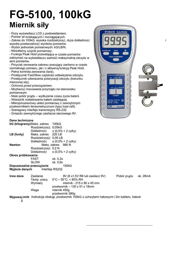 Miernik si y - Pomiar si a dok adno - Pe na kontrola zerowania (tara). - Prze - Prze mierzonej si y). du – wyd u nik roz adowania baterii zasilaj - Mikroprocesorowy uk ad pomiarowy z zewn Dok adno Dok adno Dok adno Instrukcja obs ugi, przetwornik 100kG z uchwytami hakowymi i 2m kablem, futera