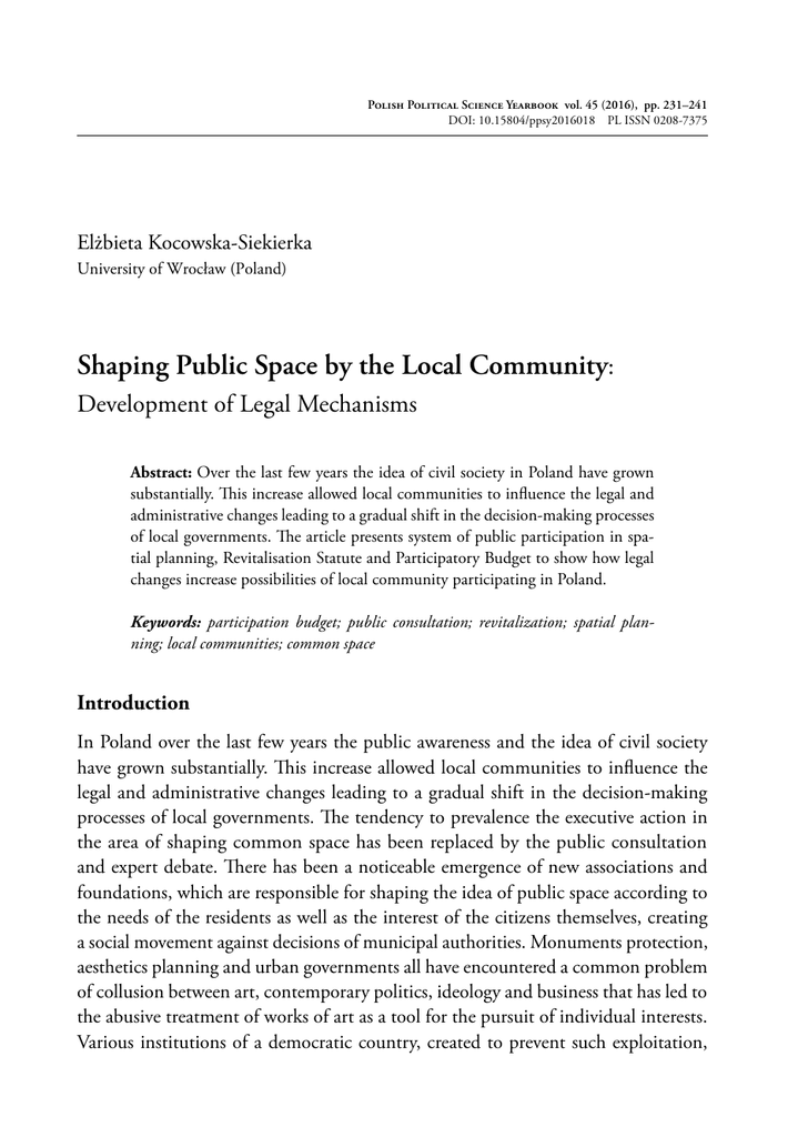 Polish Political Science Yearbook vol. 45 (2016), pp. 231–241 DOI: 10.15804/ppsy2016018 PL ISSN 0208-7375 Elżbieta Kocowska-Siekierka University of Wrocław (Poland) Shaping Public Space by the Local Community: Development of Legal Mechanisms Abstract: Over the last few years the idea of civil society in Poland have grown substantially. This increase allowed local communities to influence the legal and administrative changes leading to a gradual shift in the decision-making processes of local governments. The article presents system of public participation in spatial planning, Revitalisation Statute and Participatory Budget to show how legal changes increase possibilities of local community participating in Poland. Keywords: participation budget; public consultation; revitalization; spatial planning; local communities; common space Introduction In Poland over the last few years the public awareness and the idea of civil society have grown substantially. This increase allowed local communities to influence the legal and administrative changes leading to a gradual shift in the decision-making processes of local governments. The tendency to prevalence the executive action in the area of shaping common space has been replaced by the public consultation and expert debate. There has been a noticeable emergence of new associations and foundations, which are responsible for shaping the idea of public space according to the needs of the residents as well as the interest of the citizens themselves, creating a social movement against decisions of municipal authorities. Monuments protection, aesthetics planning and urban governments all have encountered a common problem of collusion between art, contemporary politics, ideology and business that has led to the abusive treatment of works of art as a tool for the pursuit of individual interests. Various institutions of a democratic country, created to prevent such exploitation, 232 Elżbieta Kocowska-Siekierka have allowed nevertheless a wide subjectivity to the decision-making bodies, leading to an authority – citizen conflict. As counteractive measures there has been a greater pressure for legal and administrative changes, granting local communities a valid opinion. These changes, however new to the Polish society, have been received wit widespread approval as evidenced by the growing popularity of the civil budget and public consultation carried out under the spatial planning processes and Revitalisation Statute. The aim of this paper is to take a closer look at the functioning of these mechanisms. Citizen participation in spatial planning processes Citizen participation is a process of public members contributing to shaping and implementation of regional and trans-regional projects by local administration. The extent of this participation, in its most basic form, involves providing information and knowledge. At a more advanced level, it includes consultations and even decisionmaking. This process is administered through the subsidiarity procedures within legal and political framework (Its applicable to refer to the law of democratic country, social dialogue rule and free economy). These procedures, being some of the main rules constitutionalising the European Union (Art. 5 of the Treaty on European Union), have been also adopted by the 1997 Constitution of Poland1. Due to being mention only in the preamble without defining its content in the main articles, there are difficulties in adopting their legal definition2 and executive guidelines. Poland ratified on April 26, 1993 the European Charter of Local Self-Government, however is bound to follow the subsidiarity directions determined by this act (Krasnowolski, 2012, p.9). According to its articles, in a situation where a member state does not need to intervene, it should allow local community to make decisions and consult all relevant matters with them, maximising their autonomy (Parszewski, 2006). As a supplement, the regional legal regulations determine procedures for social consultation within any regional unit (Ostaszewski, 2013). Regulations increasing the elements of public participation3 in urban planning appeared in the spatial planning statute from July, 7 1 References to social participation can be found in other articles of constitution: art. 20 about social dialogue; art.61 about the information rights; art.63 about authority verification; art. 125 and 170 about referendum. 2 Most common idea for supportiveness rule is the one created by Ewa Popławska, where the relationship between individual-country-society refers to these concepts: as much freedom as possible, as much society as necessary and possible, as much country as necessary (Popławska, 1996, p. 139). 3 On the genesis of social participations in spatial planning, see: Siemiński, 2007, pp. 37 – 59. Shaping Public Space by the Local Community 1994. Following the democratic processes for allocating local territories for particular investments, the local authorities gained the freedom to make such decisions. Since public participation in spatial planning is an integral part of democratic governance, it enhanced the local decision-making involvement of the society. It also guaranteed partaking in pre-ratification procedures of those projects through the means of: information (from the municipal governments) about creating the plans and for these projects; presenting the projects for public insight; accepting suggestions for corrective measures; and considering objections (art. 18(2)) (Leoński et al., 2002, p. 48 – 49). In the spatial planning statute 2003 the public participation has been modified. The planning processes have been granted to the professional bodies, with an idea of territorial and developmental balance. In addition to information and planning insight into the local investment projects, it introduced the possibility of public discussions (art. 11(10), art. 17(10)). The scientific community’s and non-go