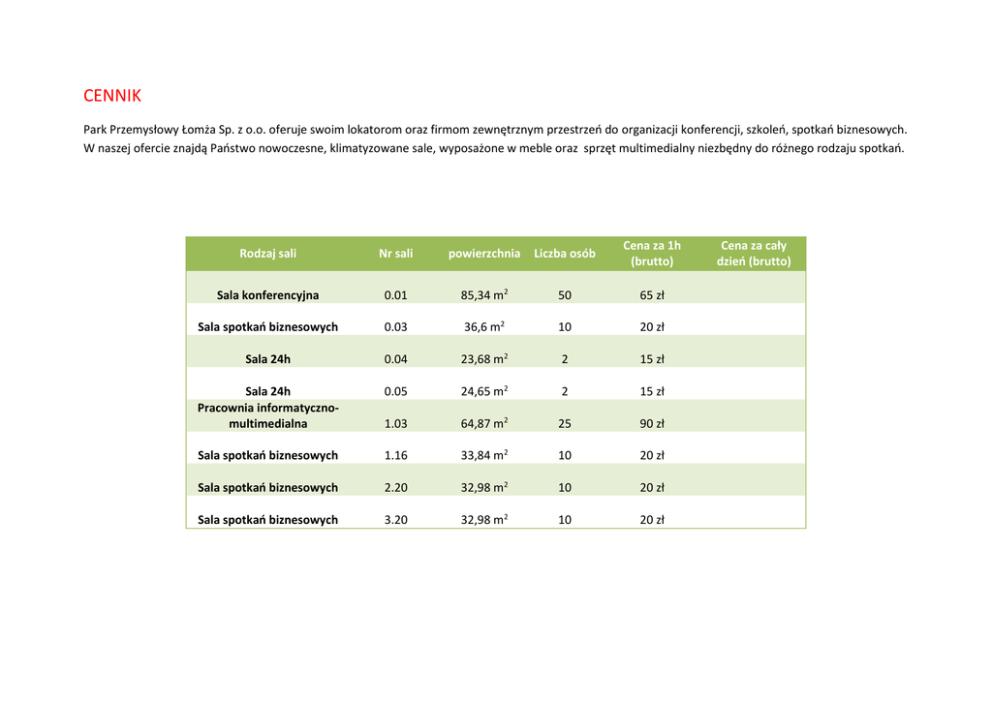 CENNIK Park Przemysłowy Łomża Sp. z o.o. oferuje swoim lokatorom oraz firmom zewnętrznym przestrzeń do organizacji konferencji, szkoleń, spotkań biznesowych. W naszej ofercie znajdą Państwo nowoczesne, klimatyzowane sale, wyposażone w meble oraz sprzęt multimedialny niezbędny do różnego rodzaju spotkań. Rodzaj sali Nr sali powierzchnia Liczba osób Cena za 1h (brutto) Sala konferencyjna 0.01 85,34 m2 50 65 zł Sala spotkań biznesowych 0.03 36,6 m2 10 20 zł Sala 24h 0.04 23,68 m2 2 15 zł Sala 24h Pracownia informatycznomultimedialna 0.05 24,65 m2 2 15 zł 1.03 64,87 m2 25 90 zł Sala spotkań biznesowych 1.16 33,84 m2 10 20 zł Sala spotkań biznesowych 2.20 32,98 m2 10 20 zł Sala spotkań biznesowych 3.20 32,98 m2 10 20 zł Cena za cały dzień (brutto)