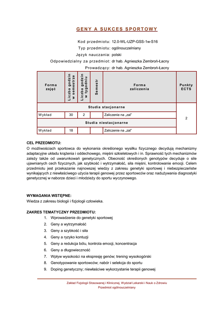 Kod przedm i ot u: 12.0-WL-UZP-GSS-1w-S16 T yp przedm i ot u: ogólnouczelniany Język naucza ni a: polski O dpo wi edzi al ny za przedm i ot : dr hab. Agnieszka Zembroń-Łacny Se m e s t r Li c z ba godz i n w t y godni u Form a za j ę ć Li c z ba godz i n w s em e s t r z e Pro wadz ący: dr hab. Agnieszka Zembroń-Łacny Form a za l i c ze ni a Punk t y ECTS St udi a s t a cj ona r ne W yk ła d 30 2 Zaliczenie na „zal” 2 St udi a ni e st a c j ona r ne W yk ła d 18 Zaliczenie na „zal” CEL PRZEDMIOTU: O możliwościach sportowca do wykonania określonego wysiłku fizycznego decydują mechanizmy adaptacyjne układu krążenia i oddechowego, mięśni szkieletowych i in. Sprawność tych mechanizmów zależy także od uwarunkowań genetycznych. Obecność określonych genotypów decyduje o sile ujawnianych cech fizycznych, jak szybkość i wytrzymałość, siła mięśni, kontrolowanie emocji. Celem przedmiotu jest przekazanie najnowszej wiedzy z zakresu genetyki sportowej i niebezpieczeństw wynikających z niewłaściwego użycia terapii genowej przez sportowców oraz nadużywania diagnostyki genetycznej w naborze dzieci i młodzieży do sportu wyczynowego. WYMAGANIA WSTĘPNE: Wiedza z zakresu biologii i fizjologii człowieka. ZAKRES TEMATYCZNY PRZEDMIOTU: 1. Wprowadzenie do genetyki sportowej 2. Geny a wytrzymałość 3. Geny a szybkość i siła 4. Geny a ryzyko kontuzji 5. Geny a redukcja bólu, kontrola emocji, koncentracja 6. Geny a długowieczność 7. Wpływ wysokości na ekspresję genów; trening wysokogórski 8. Genotypowanie sportowców; nabór i selekcja do sportu 9. Doping genetyczny; niewłaściwe wykorzystanie terapii genowej Zakład Fizjologii Stosowanej i Klinicznej, Wydział Lekarski i Nauk o Zdrowiu Przedmiot ogólnouczelniany 10. Doping genetyczny poprzez zastosowanie regulatorów ekspresji genów; exercise pills 11. Nutrigenetyka i nutrigenomika w żywieniu sportowców METODY KSZTAŁCENIA: Wykład konwencjonalny, wykład konwersatoryjny, dyskusja. EFEKTY KSZTAŁCENIA I METODY WERYFIKACJI OSIĄGANIA EFEKTÓW KSZTAŁCENIA: OPIS EFEKTU METODY WERYFIKACJI posiada wiedzę w zakresie fizykochemicznych i biologicznych podstaw nauk o zdrowiu oraz nauk o kulturze fizycznej uzyskanie zaliczenia z przedmiotu na podstawie oceny aktywności podczas zajęć posiada ogólną znajomość budowy i funkcji organizmu człowieka jw. zna podstawowe pojęcia i mechanizmy psychospołeczne związane ze zdrowiem i jego ochroną jw. zna zasady promocji zdrowia i zdrowego trybu życia jw. zna prawne, organizacyjne i etyczne uwarunkowania wykonywania działalności zawodowej jw. potrafi formułować opinie dotyczące pacjentów, klientów, grup społecznych w kontekście związanym z wykonywaniem zawodu jw. WARUNKI ZALICZENIA: Minimum 80% frekwencja na zajęciach oraz aktywne w nich uczestnictwo. Aktywne uczestnictwo w dyskusji podsumowującej cykl wykładów. OBCIĄŻENIE PRACĄ STUDENTA: Studia stacjonarne Studia niestacjonarne Godziny kontaktowe (udział w zajęciach, konsultacjach): 40 godz. 28 godz. Samodzielna praca studenta (przygotowanie się do zajęć): 10 godz. 22 godz. Zajęcia z bezpośrednim udziałem nauczyciela akademickiego: 1,5 ECTS 1 ECTS Zajęcia bez udziału nauczyciela akademickiego: 0,5 ECTS 1 ECTS Łącznie 50 godz. – 2 ECTS Zakład Fizjologii Stosowanej i Klinicznej, Wydział Lekarski i Nauk o Zdrowiu Przedmiot ogólnouczelniany LITERATURA PODSTAWOWA: 1. Zembroń-Łacny A. Geny aktywności fizycznej. Sport Wyczynowy 4: 2011; 87-96. 2. Bal J. Biologia molekularna w medycynie. Wyd. Naukowe PWN W-wa 2011. LITERATURA UZUPEŁNIAJĄCA: Podolska K. Podstawy terapii genowej. www.biotechnolog.pl Henderson M. 50 teorii genetyki. Wyd. naukowe PWN 2010. Józków P, Mędraś M. Hormon wzrostu i IGF-1 jako substancje dopingujące w sporcie wyczynowym. Endokrynol Pol 2009; 60: 389–394. www.doping-prevention.de Komisja do zwalczania dopingu w sporcie www.antydoping.pl Światowa Agencja Antydopingowa www.wada-ama.org PROGRAM OPRACOWAŁA: dr hab. Agnieszka Zembroń-Łacny Zakład Fizjologii Stosowanej i Klinicznej, Wydział Lekarski i Nauk o Zdrowiu Przedmiot ogólnouczelniany