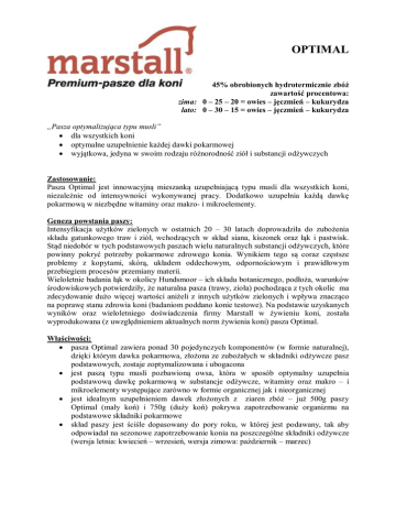 OPTIMAL 45% obrobionych hydrotermicznie zbóż zawartość procentowa: zima: 0 – 25 – 20 = owies – jęczmień – kukurydza lato: 0 – 30 – 15 = owies – jęczmień – kukurydza „Pasza optymalizująca typu musli” dla wszystkich koni optymalne uzupełnienie każdej dawki pokarmowej wyjątkowa, jedyna w swoim rodzaju różnorodność ziół i substancji odżywczych Zastosowanie: Pasza Optimal jest innowacyjną mieszanką uzupełniającą typu musli dla wszystkich koni, niezależnie od intensywności wykonywanej pracy. Dodatkowo uzupełnia każdą dawkę pokarmową w niezbędne witaminy oraz makro- i mikroelementy. Geneza powstania paszy: Intensyfikacja użytków zielonych w ostatnich 20 – 30 latach doprowadziła do zubożenia składu gatunkowego traw i ziół, wchodzących w skład siana, kiszonek oraz łąk i pastwisk. Stąd niedobór w tych podstawowych paszach wielu naturalnych substancji odżywczych, które powinny pokryć potrzeby pokarmowe zdrowego konia. Wynikiem tego są coraz częstsze problemy z kopytami, skórą, układem oddechowym, odpornościowym i prawidłowym przebiegiem procesów przemiany materii. Wieloletnie badania łąk w okolicy Hundsmoor – ich składu botanicznego, podłoża, warunków środowiskowych potwierdziły, że naturalna pasza (trawy, zioła) pochodząca z tych okolic ma zdecydowanie dużo więcej wartości aniżeli z innych użytków zielonych i wpływa znacząco na poprawę stanu zdrowia koni (badaniom poddano konie testowe). Na podstawie uzyskanych wyników oraz wieloletniego doświadczenia firmy Marstall w żywieniu koni, została wyprodukowana (z uwzględnieniem aktualnych norm żywienia koni) pasza Optimal. Właściwości: pasza Optimal zawiera ponad 30 pojedynczych komponentów (w formie naturalnej), dzięki którym dawka pokarmowa, złożona ze zubożałych w składniki odżywcze pasz podstawowych, zostaje zoptymalizowana i ubogacona jest paszą typu musli pozbawioną owsa, która w sposób optymalny uzupełnia podstawową dawkę pokarmową w substancje odżywcze, witaminy oraz makro – i mikroelementy występujące zarówno w formie organicznej jak i nieorganicznej jest idealnym uzupełnieniem dawek złożonych z ziaren zbóż – już 500g paszy Optimal (mały koń) i 750g (duży koń) pokrywa zapotrzebowanie organizmu na podstawowe składniki pokarmowe skład paszy jest ściśle dopasowany do pory roku, w której jest podawany, tak aby odpowiadał na sezonowe zapotrzebowanie konia na poszczególne składniki odżywcze (wersja letnia: kwiecień – wrzesień, wersja zimowa: październik – marzec) Dawkowanie: Dawkowanie paszy na każde 100kg masy ciała: dla wszystkich koni pasza podstawowa siano pasza uzupełniająca Optimal (jako dodatek dawki podst.) Przykład dawki dziennej: optymalizcja dziennej dawki pokarm.: dla wszystkich koni 1,0 – 1,3 kg ok. 150 g do mały koń 500g paszy Optimal duży koń 750g paszy Optimal w przypadku pracy lekkiej – dodatkowo do paszy Optimal należy podać inną paszę uzupełniającą np. Haferfrei w ilości: ok. 0,75 kg (mały koń) ok. 1,25 kg (duży koń) Wersja zimowa Wersja letnia Analiza odżywcza: białko surowe 10,5 % białko og.str. 7,2 % tłuszcz surowy 4,0 % włókno surowe 7,0 % popiół surowy 9,0 % wapń 0,90 % fosfor 0,50 % sód 0,80 % magnez 0,50 % chlor 0,90 % lizyna 0,41 % metionina 0,14 % cystyna 0,13 % treonina 0,40 % Analiza odżywcza: białko surowe 10,0 % białko og.str. 7,0 % tłuszcz surowy 3,8 % włókno surowe 7,0 % popiół surowy 10,0 % wapń 1,2 % fosfor 0,4 % sód 0,8 % magnez 0,6 % chlor 0,8 % lizyna 0,37 % metionina 0,12 % cystyna 0,12 % treonina 0,40 % zawartość energetyczna 12,00 MJ energii str. Zawartość w 1 kg: witamina A 45 000 witamina D3 2 100 witamina E 720 witamina C 160,0 witamina B1 40,0 witamina B2 18,0 witamina B6 22,0 witamina B12 80,0 witamina K3 10,0 biotyna 670,0 kwas foliowy 13,0 chlorek choliny 550,0 pantotenian wapnia 32,0 kwas nikotynowy 59,0 kwas pantotenowy 29,0 żelazo 400,0 miedź 64,0 cynk 320,0 mangan 295,0 kobalt 1,0 jod 5,3 selen 0,9 j.m. j.m. mg mg mg mg mg mcg mg mcg mg mg mg mg mg mg mg mg mg mg mg mg 12,00 MJ energii str. Zawartość w 1 kg: witamina A 30 000 j.m. witamina D3 1 800 j.m. witamina E 700 mg witamina C 150,0 mg witamina B1 30,0 mg witamina B2 17,0 mg witamina B6 20,5 mg witamina B12 78,0 mg witamina K3 9,5 mg biotyna 600,0 mcg kwas foliowy 13,0 mg chlorek choliny 530,0 mg pantotenian wapnia 31,0 mg kwas nikotynowy 57,0 mg kwas pantotenowy 26,0 mg żelazo 390,0 mg miedź 65,0 mg cynk 330,0 mg mangan 295,0 mg kobalt 1,2 mg jod 5,0 mg selen 0,8 mg