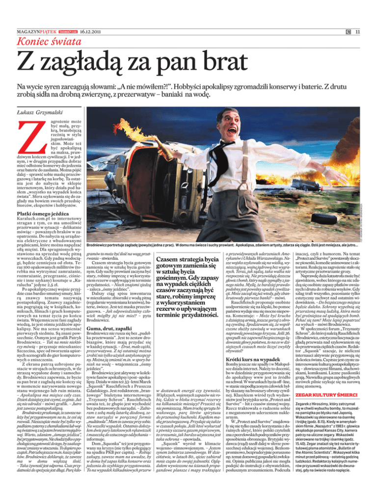 16.12.2011 C 11 Koniec świata Z zagładą za pan brat Na wycie syren zareagują słowami: „A nie mówiłem?!”. Hobbyści apokalipsy zgromadzili konserwy i baterie. Z drutu zrobią sidła na drobną zwierzynę, z prezerwatyw – baniaki na wodę. Łukasz Grzymalski Z FOT. ARCHIWUM PATRYKA BRODNIEWICZA agrożenie może być małą, przykrą, bratobójczą rzeźnią w stylu jugosłowiańskim. Może też być apokalipsą na maksa, prawdziwym końcem cywilizacji. I w jednym, i w drugim przypadku dobrze mieć odłożone konserwy do jedzenia oraz baterie do zasilania. Można pójść dalej – sprawić sobie maskę przeciwgazową i latarkę na korbę. Ta ostatnia jest do nabycia w sklepie internetowym, który działa pod hasłem „wszystko na wypadek końca świata”. Sfera szykowania się do zagłady ma bowiem swoich przedsiębiorców, ekspertów i hobbystów. Płatki ósmego jeźdźca Karaluch.com.pl to internetowy stragan z tym, co ma umożliwić przetrwanie w sytuacji – delikatnie mówiąc – poważnych braków w zaopatrzeniu. Do nabycia są urządzenia elektryczne z wbudowanymi prądnicami, które można napędzać siłą mięśni. Dla spragnionych wystawiono na sprzedaż wodę pitną w woreczkach. Gdy padną wodociągi, będzie cenniejsza od złota. Teraz 100 opakowanych mililitrów (torebka ma wytrzymać zamrażanie, rozmrażanie, przegrzanie, ciśnienie i inne szykany) kosztuje u „Karalucha” jedyne 2,5 zł. Po apokaliptycznej wojnie przyjdzie czas bardzo smutnej smuty, którą znawcy tematu nazywają postapokalipsą. Znawcy zagadnienia pogrążają się w książkach, komiksach, filmach i grach komputerowych na temat życia po końcu świata. Wtajemniczeni fani zagłady wiedzą, że jest ośmiu jeźdźców apokalipsy. Nie ma sensu wymieniać pierwszych siedmiu. Są znani powszechnie. Ósmym jest grafik Patryk Brodniewicz. – Tak na mnie niektórzy mówią – przyznaje mieszkaniec Szczecina, spec od tworzenia upiornych scenografii do gier komputerowych o zniszczeniu. Z ekranu patrzą uzbrojone postacie w strojach ochronnych, w tle straszą wypalone domy i samochody. Brodniewicz zapewnia, że bycie za pan brat z zagładą nie kończy się w momencie narysowania nowego stanu wojennego lub ruin miasta. – Apokalipsa ma miejsce cały czas. Dzień dzisiejszy jest czymś, co ginie. Już się nie odrodzi – mówi grafik. – Jutro jest zawsze postapokalipsą. Brodniewiczprzekonuje,żezawszenależy być przygotowanym na to, że coś się rozwali. Nieszczęście może być tylko wypadkiemcysternyzchemikaliamilubwojnąświatowązużyciembronitermojądrowej. Warto, zdaniem „ósmego jeźdźca”, byćprzygotowanym.Niechodzitylkoopsychologicznągotowośćdotego,byzaakceptowaćzmianywotoczeniu.Todopieropoczątek.Potrzebajeszczem.in.kaszyipłatków. Brodniewicz deklaruje, że zawsze ma w domu większą ilość. – Taka żywność jest odporna. Czas przydatności do spożycia jest długi. Parę kilo- Brodniewicz portretuje zagładę (powyżej jedna z prac). W domu ma świece i suchy prowiant. Apokalipsa, zdaniem artysty, zdarza się ciągle. Dziś jest mniejsza, ale jutro... gramów to może być ilość na wagę przetrwania – stwierdza. Czasem strategia bycia gotowym zamienia się w sztukę bycia gościnnym. Gdy suchy prowiant zaczyna być stary, robimy imprezę z wykorzystaniem rezerw o upływającym terminie przydatności. – Niech znajomi zjedzą – zaleca „ósmy jeździec”. Dalszy ciąg spisu inwentarza w mieszkaniu: zbiorniki z wodą pitną (regularnie wymieniana kranówa), baterie, świece. Jest też maska przeciwgazowa. – Jak odpowiedzialny człowiek mógłby jej nie mieć? – pyta Brodniewicz. Czasem strategia bycia gotowym zamienia się w sztukę bycia gościnnym. Gdy zapasy na wypadek ciężkich czasów zaczynają być stare, robimy imprezę z wykorzystaniem rezerw o upływającym terminie przydatności. Guma, drut, zapałki Brodniewicz nie rusza się bez „pudełka przetrwania”. Jest to zestaw drobiazgów, które mają przydać się w każdej sytuacji. – Drut, małe cążki, prezerwatywa. Z tej ostatniej można zrobić nie tylko użytek antykoncepcyjny. Można ją zmienić m.in. w spory baniak na wodę – wtajemnicza „ósmy jeździec”. Brodniewicz jest aktywny w kolektywie fanów apokalipsy i post–apokalipsy. Działa w nim też 33–letni Marek „Squonk” Rauchfleisch z Pruszcza Gdańskiego. Jest redaktorem „branżowego” biuletynu internetowego „Trzynasty Schron”. Rauchfleisch uważa też, że głupio jest wychodzić bez podstawowych narzędzi. – Zabieram z sobą małą latarkę diodową, zestaw narzędzi w poręcznej formie „multitoola”. Mam to zawsze przy sobie. Na wszelki wypadek. Ostatnio dołożyłem dwie pary lateksowych rękawiczek i maseczkę do sztucznego oddychania – informuje. Dom „Squonka” też jest przygotowany na kryzys (nie tylko polegający na spadku PKB per capita). – Robiąc zakupy, zawsze mam na uwadze, by w domu był zapas kilku konserw oraz jedzenia do szybkiego przygotowania. To na wypadek kilkudniowych przerw o przewidywanych uderzeniach Amerykanów i Układu Warszawskiego. Nasze wojsko szykowało się na wielką, wyniszczającą, wojnę jądrową bez wygranych. Teraz, jak sądzę, taka walka nie rozpocznie się. Nie przewiduję deszczu głowic i bomb, który nagle sypnąłby z jasnego nieba. Myślę, że bardziej prawdopodobny jest powolny upadek cywilizacji. Może zaczął się już wtedy, gdy zbankrutowały pierwsze banki? – mówi. Rauchfleisch proponuje osobiste uodpornienie się na klęski, bo pomoc państwa wydaje mu się mocno niepewna. Komentuje: – Może być krucho z dzisiejszą armią, jeszcze gorzej z obroną cywilną. Spodziewam się, że współczesne służby zawiodą w warunkach naprawdę poważnego kryzysu. Jeśli 36. specpułk nie zapewnił bezpiecznego lądowania głowy państwa, to na co w dzisiejszych czasach może liczyć zwykły obywatel? Krótki kurs na wypadek w dostawach en