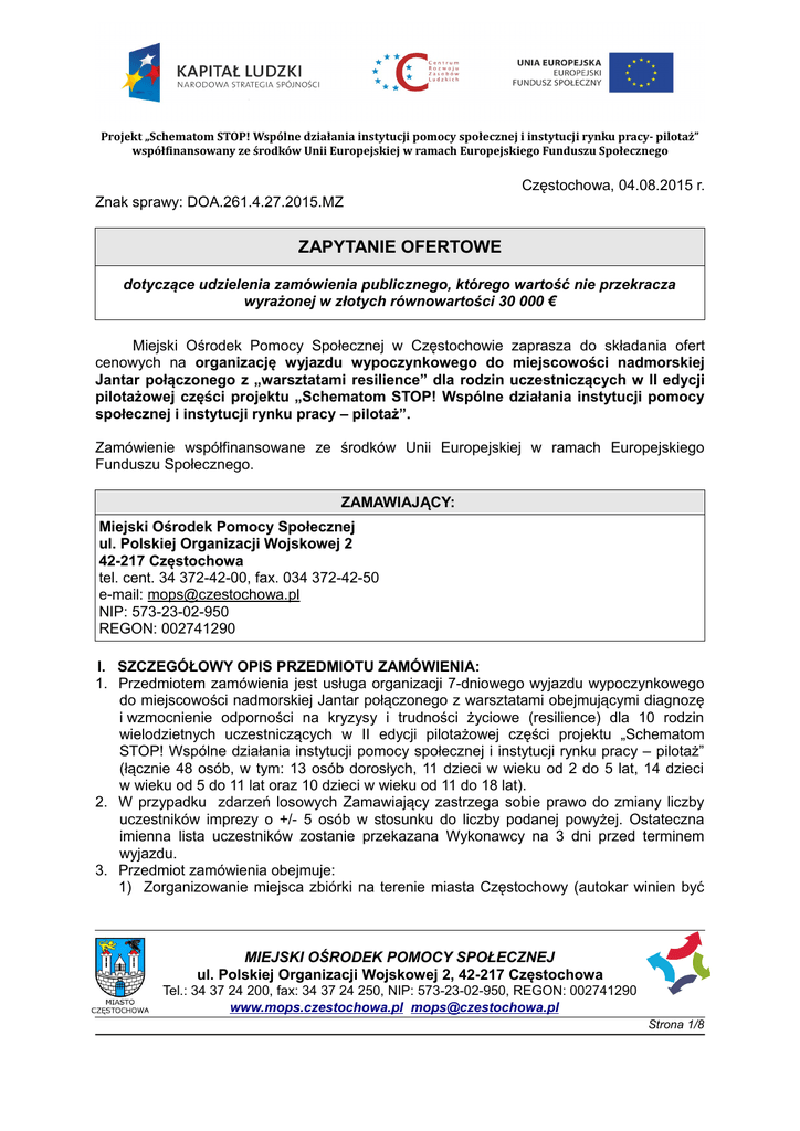 Projekt „Schematom STOP! Wspólne działania instytucji pomocy społecznej i instytucji rynku pracy- pilotaż” współfinansowany ze środków Unii Europejskiej w ramach Europejskiego Funduszu Społecznego Częstochowa, 04.08.2015 r. Znak sprawy: DOA.261.4.27.2015.MZ ZAPYTANIE OFERTOWE dotyczące udzielenia zamówienia publicznego, którego wartość nie przekracza wyrażonej w złotych równowartości 30 000 € Miejski Ośrodek Pomocy Społecznej w Częstochowie cenowych na organizację wyjazdu wypoczynkowego do Jantar połączonego z „warsztatami resilience” dla rodzin pilotażowej części projektu „Schematom STOP! Wspólne społecznej i instytucji rynku pracy – pilotaż”. zaprasza do składania ofert miejscowości nadmorskiej uczestniczących w II edycji działania instytucji pomocy Zamówienie współfinansowane ze środków Unii Europejskiej w ramach Europejskiego Funduszu Społecznego. ZAMAWIAJĄCY: Miejski Ośrodek Pomocy Społecznej ul. Polskiej Organizacji Wojskowej 2 42-217 Częstochowa tel. cent. 34 372-42-00, fax. 034 372-42-50 e-mail: [email protected] NIP: 573-23-02-950 REGON: 002741290 I. SZCZEGÓŁOWY OPIS PRZEDMIOTU ZAMÓWIENIA: 1. Przedmiotem zamówienia jest usługa organizacji 7-dniowego wyjazdu wypoczynkowego do miejscowości nadmorskiej Jantar połączonego z warsztatami obejmującymi diagnozę i wzmocnienie odporności na kryzysy i trudności życiowe (resilience) dla 10 rodzin wielodzietnych uczestniczących w II edycji pilotażowej części projektu „Schematom STOP! Wspólne działania instytucji pomocy społecznej i instytucji rynku pracy – pilotaż” (łącznie 48 osób, w tym: 13 osób dorosłych, 11 dzieci w wieku od 2 do 5 lat, 14 dzieci w wieku od 5 do 11 lat oraz 10 dzieci w wieku od 11 do 18 lat). 2. W przypadku zdarzeń losowych Zamawiający zastrzega sobie prawo do zmiany liczby uczestników imprezy o +/- 5 osób w stosunku do liczby podanej powyżej. Ostateczna imienna lista uczestników zostanie przekazana Wykonawcy na 3 dni przed terminem wyjazdu. 3. Przedmiot zamówienia obejmuje: 1) Zorganizowanie miejsca zbiórki na terenie miasta Częstochowy (autokar winien być MIEJSKI OŚRODEK POMOCY SPOŁECZNEJ ul. Polskiej Organizacji Wojskowej 2, 42-217 Częstochowa Tel.: 34 37 24 200, fax: 34 37 24 250, NIP: 573-23-02-950, REGON: 002741290 www.mops.czestochowa.pl [email protected] Strona 1/8 Projekt „Schematom STOP! Wspólne działania instytucji pomocy społecznej i instytucji rynku pracy- pilotaż” współfinansowany ze środków Unii Europejskiej w ramach Europejskiego Funduszu Społecznego podstawiony minimum 30 min. przed planowaną godziną wyjazdu); 2) Zapewnienie przejazdu autokarem tam i z powrotem; 3) Zapewnienie autokaru na potrzeby organizowanych przez Wykonawcę wycieczek oraz innych planowanych działań w trakcie trwania imprezy; (Do grupy podczas transportu nie może być dołączona inna grupa). 4) Autokar wyposażony w sprawną klimatyzację, o co najmniej standardach autokaru wycieczkowego (nie starszy niż 10 lat), posiadający w dniu wyjazdu wszystkie aktualne dokumenty wymagane do przewozu pasażerów (m. in. aktualne badania techniczne, aktualną licencję na wykonywanie krajowego transportu przewozu osób – dla przewoźnika. Wykonawca zobowiązany jest zapewnić odpowiednią ilość kierowców (zgodnie z obowiązującymi przepisami), posiadających wymagane kwalifikacje zawodowe. W przypadku awarii autokaru lub w razie wykazania przez organy kontroli niesprawności autokaru, Wykonawca w ciągu 1 godziny podstawi sprawny pojazd zastępczy; 5) Zakwaterowanie wszystkich uczestników (7 noclegów) na terenie jednego ośrodka w pokojach: • 1 pokój pięcioosobowy; • 4 pokoje czteroosobowe; • 3 pokoje trzyosobowe; • 9 pokoi dwuosobowych z pełnym węzłem sanitarnym (tj. WC, łazienka z prysznicem lub wanną, umywalką) oraz czajnikiem elektrycznym bezprzewodowym. Liczba pokoi może ulec zmianie w zależności od ostatecznej liczby zgłoszonych uczestników (+/- osób). 6) Ośrodek spełniający wymogi dotyczące bezpieczeństwa, ochrony p. poż, oraz warunków higieniczno-sanitarnych określonych przepisami o ochronie przeciwpożarowej i Państwowej Inspekcji Sanitarnej; 7) Wyżywienie: • całodzienne wyżywienie składające się z 3 posiłków (śniadanie; obiad z deserem, np. ciasto, owoce lub deser lodowy; kolacja), z wyjątkiem pierwszego dnia, w którym Wykonawca zapewni obiad + deser oraz kolację i ostatniego dnia, w którym Wykonawca zapewni śniadanie, obiad + deser; • catering podczas warsztatów (kawa, herbata, napoje, ciastka); • obiad podczas wycieczki; • suchy prowiant w czasie podróży powrotnej, tj. bułkę z żółtym serem, dwie bułki słodkie, owoc (np. jabłko, banan), woda mineralna lub napój niegazowany (1 l) dla każdego uczestnika. Na terenie ośrodka wypoczynkowego musi być usytuowana jadalnia z możliwością jednoczesnego spożywania posiłku przez wszystkich uczestników turnusu. 8) Zapewnienie kadry dydaktycznej, w tym: • kierownik wypoczynku nadzorujący prawidłowy przebieg wyjazdu od dnia jego rozpoczęcia do dnia zakończenia; • trzech trenerów posiadających wykształcenie odpowiednie dla tematyki MIEJSKI OŚRODEK POMOCY SPOŁECZNEJ ul. Polskiej Organizacji Wojskowej 2, 42-217 Częstochowa Tel.: 34 37 24 200, fax: 34 37 24 250, NIP: 573-23-02-950, REGON: 002741290 www.mops.czestochowa.pl [email protected] Strona 2/8 Projekt „Schematom STOP! Wspólne działania instytucji pomocy społecznej i instytucji rynku pracy- pilotaż” współfinansowany ze środków Unii Europejskiej w ramach Europejskiego Funduszu Społecznego warsztatów, tj. przeszkolonych z zakresu pracy z rodziną opartej na koncepcji resilience; • dwóch opiekunów do dzieci. Zamawiający nie dopuszcza łączenia funkcji kierownika wypoczynku z funkcją trenera lub opiekuna do dzieci. Wynagrodzenie kierownika oraz kadry dydaktycznej należy do obowiązków Wykonawcy i winno być wlic