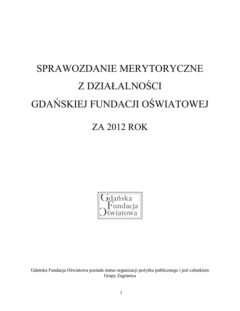 SPRAWOZDANIE MERYTORYCZNE Z DZIAŁALNOŚCI GDAŃSKIEJ FUNDACJI OŚWIATOWEJ ZA 2012 ROK Gdańska Fundacja Oświatowa posiada status organizacji pożytku publicznego i jest członkiem Grupy Zagranica 1 Spis treści: 1. Prowadzenie szkół 3 2. Prowadzenie International Preschool of Gdansk/Międzynarodowe Przedszkole w Gdańsku 4 3. Prowadzenie Poradni Psychologiczno-Pedagogicznej „Osiek” 4 4. Podnoszenie kwalifikacji kadry kierowniczej i nauczycieli 5 5. Projekty międzynarodowe 6 6. Konkursy przedmiotowe dla szkół 8 7. Projekty finansowane przez Unię Europejską 9 8. Inne projekty 9 9. Działania na forum publicznym 10 10. Rozbudowa szkół Fundacji 10 11. Użytkowanie nowych obiektów 10 2 1. Prowadzenie szkół Fundacja w 2012 r. prowadziła dziewięć następujących szkół: a) Gdańskie Liceum Autonomiczne – rok założenia 1989, b) Gdańskie Autonomiczne Gimnazjum – rok założenia 1999, c) Gdańska Autonomiczna Szkoła Podstawowa – rok założenia 2000, d) Sopockie Autonomiczne Liceum – rok założenia 2002, e) Sopockie Autonomiczne Gimnazjum – rok założenia 1999, f) Sopocka Autonomiczna Szkoła Podstawowa – rok założenia 1995. g) Elementary International School of Gdansk/Międzynarodowa Szkoła Podstawowa w Gdańsku – rok założenia 2010 oddział amerykański – edukacja w języku angielskim; h) Middle International School of Gdansk/Międzynarodowe Gimnazjum w Gdańsku – rok założenia 2010 i) oddział amerykański – edukacja w języku angielskim, oddział białoruski – edukacja w języku białoruskim; High International School of Gdansk/Międzynarodowe Liceum Ogólnokształcące w Gdańsku – rok założenia 2010 oddział amerykański – edukacja w języku angielskim, oddział białoruski – edukacja w języku białoruskim. . W Elementary International School of Gdansk od 2011 r. funkcjonuje edukacja domowa. Prowadzona jest ona obecnie w: języku polskim (szkoła podstawowa), języku białoruskim (gimnazjum, liceum). Program nauczania w oddziałach amerykańskich International School of Gdansk opracowano w oparciu o standardy edukacyjne amerykańskiego stanu Minnesota i polskiej podstawy programowej. Program realizowany jest przy wykorzystaniu podręczników amerykańskiego wydawnictwa Pearson. Program nauczania w oddziałach białoruskich International School of Gdansk opracowano w oparciu o standardy edukacyjne Republikańskiego Stowarzyszenia Społecznego „Towarzystwo Szkoły Białoruskiej” oraz polskiej podstawy programowej. 3 Monitorowanie jakości oraz ewaluacja przyjętej koncepcji edukacyjnej następowały poprzez system organizowanych przez Fundację, odbywających się rokrocznie tzw. Akcji Sprawdzających (analiza wyników nauczania z wybranych dziedzin) oraz Wielkich Ankiet (badanie opinii o pracy szkół wśród uczniów, rodziców i nauczycieli). Ponadto Fundacja prowadziła nadzór finansowy, prawny i organizacyjny w Szkołach i Poradni, w których zatrudniano ok. 180 nauczycieli (GSA, SSA, ISG, PPP ”Osiek”). Przy Gdańskim Liceum Autonomicznym od 2003 r. funkcjonuje Centrum Egzaminacyjne SAT. SAT (Scholastic Aptitude Test) – standardowy egzamin wstępny na większość wyższych uczelni USA jest przygotowywany i przeprowadzany przez Educational Testing Service na zlecenie i pod nadzorem College Board – niekomercyjnej organizacji zrzeszającej szkoły średnie oraz szkoły wyższe w Stanach Zjednoczonych. W 2012 r. Gdańskie Liceum Autonomiczne przeprowadziło 5 sesji egzaminacyjnych dla uczniów z terenu całej północnej Polski. Upoważnieni pracownicy Liceum starali się również udzielać wszechstronnej informacji i pomocy związanej z wymogami, procedurą oraz pożytkami płynącymi ze zdawania egzaminu SAT. Przy Gdańskim Liceum Autonomicznym od 2006 r. funkcjonuje centrum egzaminacyjne TOEFL (Test of English as a Foreign Language). Egzamin TOEFL sprawdza umiejętność rozumienia i posługiwania się językiem angielskim. Wyniki egzaminu są ważne przez dwa lata. Po upływie tego czasu są one usuwane z oficjalnej bazy danych. TOEFL jest testem stosowanym na całym świecie i jest zastrzeżonym znakiem towarowym Educational Testing Service (ETS), największej organizacji na świecie zajmującej się tworzeniem i przeprowadzaniem egzaminów sprawdzających umiejętności językowe oraz badaniami w dziedzinie edukacji. W 2012 r. odbyło się 25 sesji egzaminacyjnych przeprowadzonych przez Gdańskie Liceum Autonomiczne. 2. Prowadzenie International Preschool of Gdansk/Międzynarodowego Przedszkola w Gdańsku Fundacja od 2010 r. prowadzi przedszkole. Do września 2012 r. przedszkole funkcjonowało pod nazwą Gdańskie Autonomiczne Przedszkole i organizacyjnie było częścią Gdańskich Szkół Autonomicznych. We wrześniu 2012 r. nastąpiło przeniesienie przedszkola do międzynarodowego zespołu szkół International School of Gdansk i zmiana jego nazwy na International Preschool of Gdansk/Międzynarodowe Przedszkole w Gdańsku. 3. Prowadzenie Poradni Psychologiczno-Pedagogicznej „Osiek” Od września 2003 r. Fundacja prowadzi Poradnię Psychologiczno-Pedagogiczną „Osiek”. Celem Poradni jest podnoszenie standardu opieki psychologiczno-pedagogicznej w szkołach prowadzonych przez Gdańską Fundację Oświatową, a także wspieranie, w sposób adekwatny do potrzeb uczniów i ich rodziców oraz nauczycieli ze szkół województwa pomorskiego. 4 Poradnia w 2012 r. zajmowała się następującymi obszarami działania: a) prowadzonymi na rzecz Szkół Fundacji: badania diagnostyczne: psychologiczne, pedagogiczne, logopedyczne, dotyczące specyficznych trudności w uczeniu się, ukierunkowane na podnoszenie efektywności uczenia się; terapia: pedagogiczna, logopedyczna; warsztaty i szkolenia: dla uczniów, dla rodziców, dla nauczycieli (m.in. na temat profilaktyki uzależnień, rozwiązywania konfliktów, wspierania dziecka w sytuacjach trudnych itp.); indywidualne konsultacje; akcje charytatywne; praca z 