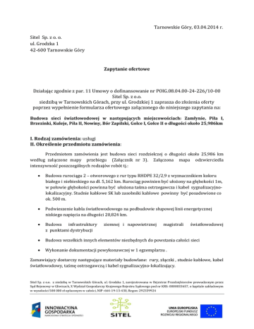 Tarnowskie Góry, 03.04.2014 r. Sitel Sp. z o. o. ul. Grodzka 1 42-600 Tarnowskie Góry Zapytanie ofertowe Działając zgodnie z par. 11 Umowy o dofinansowanie nr POIG.08.04.00-24-226/10-00 Sitel Sp. z o.o. siedzibą w Tarnowskich Górach, przy ul. Grodzkiej 1 zaprasza do złożenia oferty poprzez wypełnienie formularza ofertowego załączonego do niniejszego zapytania na: Budowa sieci światłowodowej w następujących miejscowościach: Zamłynie, Piła I, Brzezinki, Kuleje, Piła II, Nowiny, Bór Zapilski, Golce I, Golce II o długości około 25,986km I. Rodzaj zamówienia: usługi II. Określenie przedmiotu zamówienia: Przedmiotem zamówienia jest budowa sieci rozdzielczej o długości około 25,986 km według załączone mapy przebiegu (Załącznik nr 3). Załączona mapa odzwierciedla intensywność poszczególnych rodzajów robót tj.: Budowa rurociągu 2 – otworowego z rur typu RHDPE 32/2,9 z wyznacznikiem koloru białego i niebieskiego na dł. 5,162 km. Rurociąg powinien być ułożony na głębokości 1m, w połowie głębokości powinna być ułożona taśma ostrzegawcza i kabel sygnalizacyjnolokalizacyjny. Studnie kablowe SK lub zasobniki kablowe powinny być posadowione co ok. 500 m. Podwieszenie kabla światłowodowego na podbudowie słupowej linii energetycznej niskiego napięcia na długości 20,824 km. Budowa infrastruktury z punktami dystrybucji Budowa wszelkich innych elementów niezbędnych do powstania całości sieci Wykonanie dokumentacji powykonawczej w 1 egzemplarzu . ziemnej i napowietrznej magistrali światłowodowej Zamawiający dostarczy następujące materiały budowlane: rury, złączki , studnie kablowe, kabel światłowodowy, taśmę ostrzegawczą i kabel sygnalizacyjno-lokalizujący. Sitel Sp. z o.o. z siedzibą w Tarnowskich Górach, ul. Grodzka 1, zarejestrowana w Rejestrze Przedsiębiorców prowadzonym przez Sąd Rejonowy w Gliwicach, X Wydział Gospodarczy Krajowego Rejestru Sądowego pod nr KRS: 0000033657, o kapitale zakładowym w wysokości 500 000 zł opłaconym w całości, NIP: 664-19-13-430, Regon: 292339924 Zakres prac obejmuje: Lp. Rodzaj prac Ilość 1 Budowa rurociągu kablowego 2xRHDPE 32mm wykopem otwartym 4898 m 2 Budowa przewiertów sterowanych rurą RHDPEp 110/6,3 z zaciąganiem rurociągów 120 m 3 Budowa przecisków rurą RHDPEp 110/6,3 z zaciąganiem rurociągów 144 m 4 Budowa rur ochronnych dwudzielnych 110 wykopie otwartym na istn. kablach enn 0m 5 Budowa studni kablowych SKR-1 3 kpl 6 Budowa studni kablowych SK-1 10 kpl 7 Budowa zasobnika zapasu kabla 3 kpl 8 Ułożenie kabla sygnalizacyjnego XzTKMXpw 1x2x0,6 w gotowym wykopie 4898 m 9 Zaciągnięcie kabla sygnalizacyjnego XzTKMXpw 1x2x0,6 do rur ochronnych 264 m 10 Zaciągnięcie kabla światłowodowego Z-XOTKtsdD 72J do rurociągu 5162 m 11 Podwieszenie kabla światłowodowego na podbudowie słupowej linii energetycznej niskiego napięcia Z-XOTKtsdD 72J 20824 m 12 Montaż złączy na kablu 72 włóknowym w mufie kablowej 12 kpl 13 Montaż stelażu zapasu kabla 36 kpl 14 Pomiary na kablu sygnalizacyjnym 16 szt. 15 Próba ciśnieniowa rurociągu 32 szt. 16 Demontaż i budowa chodnika z kostki brukowej 0 m2 Dokumentację budowlaną dostarczy zamawiający. Oferent powinien ująć wszystkie niezbędne koszty związane z wykonaniem w/w zakresu prac w tym zajęcie pasa drogowego, rozebranie i odtworzenie nawierzchni, nadzory Sitel Sp. z o.o. z siedzibą w Tarnowskich Górach, ul. Grodzka 1, zarejestrowana w Rejestrze Przedsiębiorców prowadzonym przez Sąd Rejonowy w Gliwicach, X Wydział Gospodarczy Krajowego Rejestru Sądowego pod nr KRS: 0000033657, o kapitale zakładowym w wysokości 500 000 zł opłaconym w całości, NIP: 664-19-13-430, Regon: 292339924 branżowe, inwentaryzacja geodezyjna powykonawcza. Niniejsze zapytanie dotyczy całości prac związanych z budową kanalizacji teletechnicznej w ramach realizowanego projektu. 2.Warunki udziału w postępowaniu: O zamówienie publiczne mogą ubiegać się Wykonawcy, którzy: a) dysponują co najmniej jedną osobą zdolną do wykonania zamówienia, posiadającą uprawnienia do kierowania robotami budowlanymi w specjalności telekomunikacyjnej . b) udokumentują wykonanie, tj. zakończenie w okresie ostatnich pięciu lat przed dniem wszczęcia postępowania o udzielenie zamówienia, a jeżeli okres prowadzenia działalności jest krótszy – w tym okresie, co najmniej jednej roboty budowlanej, polegającej na wykonaniu budowy w zakresie telekomunikacyjnym o wartości brutto min. 200 000 zł. Warunki zostaną uznane za spełnione, jeżeli Wykonawca złoży dokumenty, o których mowa w punkcie 3. niniejszej specyfikacji. 3.Oświadczenia lub dokumenty, jakie muszą dostarczyć Wykonawcy: a) Aktualny odpis z właściwego rejestru albo aktualne zaświadczenie o wpisie do ewidencji działalności gospodarczej, jeżeli odrębne przepisy wymagają wpisu do rejestru lub zgłoszenia do ewidencji działalności gospodarczej - wystawione nie wcześniej niż 6 miesięcy przed upływem terminu składania ofert; b) Aktualne zaświadczenia właściwego naczelnika Urzędu Skarbowego oraz właściwego oddziału Zakładu Ubezpieczeń Społecznych lub Kasy Rolniczego Ubezpieczenia Społecznego potwierdzające odpowiednio, że Wykonawca nie zalega z opłacaniem podatków, opłat oraz składek na ubezpieczenie zdrowotne i społeczne, lub zaświadczenia, że uzyskał przewidziane prawem zwolnienie, odroczenie lub rozłożenie na raty zaległych płatności lub wstrzymanie w całości wykonania decyzji właściwego organu – wystawione nie wcześniej niż 3 miesiące przed upływem terminu składania ofert; UWAGA: W przypadku spółek cywilnych do oferty należy dołączyć zaświadczenie z Urzędu Skarbowego oraz z Zakładu Ubezpieczeń Społecznych zarówno na spółkę, jak i na każdego ze wspólników. 3.1. Dokumentami potwierdzającymi spełnianie warunku, o którym mowa w punkcie 2.a) niniejszej specyfikacji muszą być: a) Wykaz, zawier