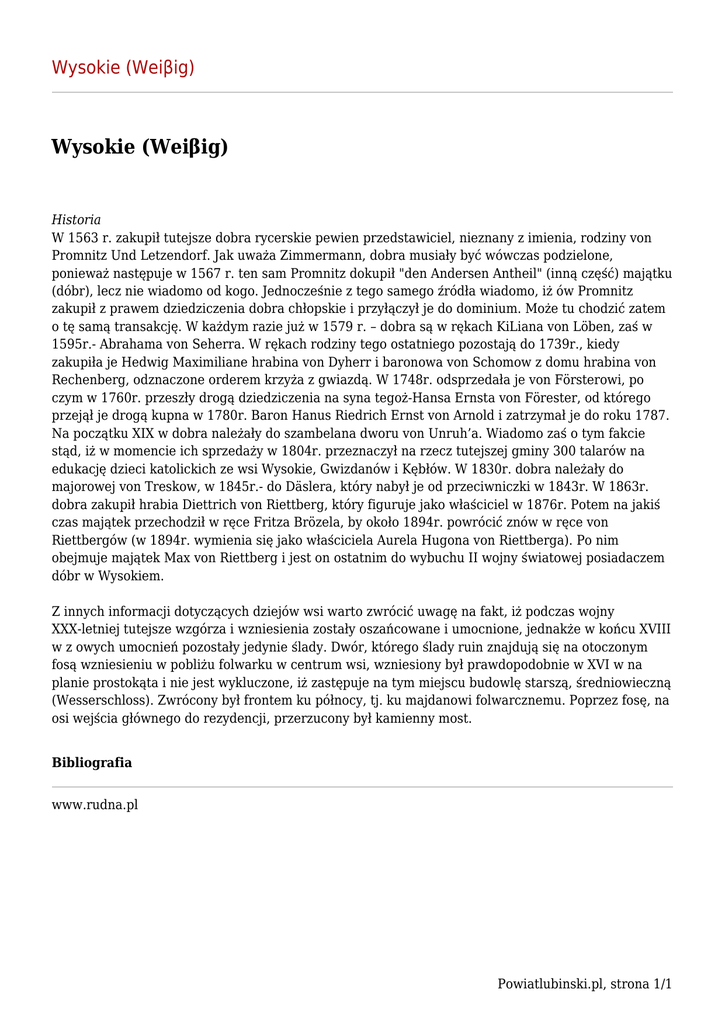 Wysokie (Weiβig) Wysokie (Weiβig) Historia W 1563 r. zakupił tutejsze dobra rycerskie pewien przedstawiciel, nieznany z imienia, rodziny von Promnitz Und Letzendorf. Jak uważa Zimmermann, dobra musiały być wówczas podzielone, ponieważ następuje w 1567 r. ten sam Promnitz dokupił "den Andersen Antheil" (inną część) majątku (dóbr), lecz nie wiadomo od kogo. Jednocześnie z tego samego źródła wiadomo, iż ów Promnitz zakupił z prawem dziedziczenia dobra chłopskie i przyłączył je do dominium. Może tu chodzić zatem o tę samą transakcję. W każdym razie już w 1579 r. – dobra są w rękach KiLiana von Löben, zaś w 1595r.- Abrahama von Seherra. W rękach rodziny tego ostatniego pozostają do 1739r., kiedy zakupiła je Hedwig Maximiliane hrabina von Dyherr i baronowa von Schomow z domu hrabina von Rechenberg, odznaczone orderem krzyża z gwiazdą. W 1748r. odsprzedała je von Försterowi, po czym w 1760r. przeszły drogą dziedziczenia na syna tegoż-Hansa Ernsta von Förester, od którego przejął je drogą kupna w 1780r. Baron Hanus Riedrich Ernst von Arnold i zatrzymał je do roku 1787. Na początku XIX w dobra należały do szambelana dworu von Unruh’a. Wiadomo zaś o tym fakcie stąd, iż w momencie ich sprzedaży w 1804r. przeznaczył na rzecz tutejszej gminy 300 talarów na edukację dzieci katolickich ze wsi Wysokie, Gwizdanów i Kębłów. W 1830r. dobra należały do majorowej von Treskow, w 1845r.- do Däslera, który nabył je od przeciwniczki w 1843r. W 1863r. dobra zakupił hrabia Diettrich von Riettberg, który figuruje jako właściciel w 1876r. Potem na jakiś czas majątek przechodził w ręce Fritza Brözela, by około 1894r. powrócić znów w ręce von Riettbergów (w 1894r. wymienia się jako właściciela Aurela Hugona von Riettberga). Po nim obejmuje majątek Max von Riettberg i jest on ostatnim do wybuchu II wojny światowej posiadaczem dóbr w Wysokiem. Z innych informacji dotyczących dziejów wsi warto zwrócić uwagę na fakt, iż podczas wojny XXX-letniej tutejsze wzgórza i wzniesienia zostały oszańcowane i umocnione, jednakże w końcu XVIII w z owych umocnień pozostały jedynie ślady. Dwór, którego ślady ruin znajdują się na otoczonym fosą wzniesieniu w pobliżu folwarku w centrum wsi, wzniesiony był prawdopodobnie w XVI w na planie prostokąta i nie jest wykluczone, iż zastępuje na tym miejscu budowlę starszą, średniowieczną (Wesserschloss). Zwrócony był frontem ku północy, tj. ku majdanowi folwarcznemu. Poprzez fosę, na osi wejścia głównego do rezydencji, przerzucony był kamienny most. Bibliografia www.rudna.pl Powiatlubinski.pl, strona 1/1