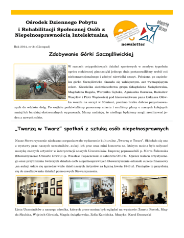 Ośrodek Dziennego Pobytu i Rehabilitacji Społecznej Osób z Niepełnosprawnością Intelektualną newsletter Rok 2014, nr 34 (Listopad) Zdobywanie Górki Szczęśliwickiej W ramach cotygodniowych działań sportowych w zeszłym tygodniu oprócz codziennej gimnastyki jednego dnia postanowiliśmy zrobić coś niekonwencjonalnego i zdobyć niewielki szczyt. Położona po sąsiedzku górka Szczęśliwicka okazała się wdzięcznym, acz wymagającym celem. Niewielka siedmioosobowa grupa (Magdalena Świątkowska, Magdalena Rogala, Weronika Gębska, Agnieszka Borucka, Radosław Wasylów i Piotr Wąsiewicz) pod kierownictwem pana Łukasza Ołówka weszła na szczyt w 30minut, pomimo braku dobrze przystosowanych do wózków dróg. Po wejściu podziwialiśmy panoramę miasta i snuliśmy plany o naszych kolejnych mniej lub bardziej ekstremalnych wyprawach. Mamy nadzieję, że niedługo będziemy mogli zrealizować jeden z nowych celów. „Twarzą w Twarz” spotkań z sztuką osób niepełnosprawnych Nasze Stowarzyszenie niedawno zorganizowało wydarzenie kulturalne „Twarzą w Twarz”. Składało się ono z wystawy prac naszych uczestników, aukcji ich prac oraz mini koncertu na, którym można było usłyszeć muzykę znanych artystów w interpretacji naszych Uczestników. Imprezę poprowadzili p. Marta Żukowska (Stowarzyszenie Otwarte Drzwi) i p. Wiesław Tupaczewski z kabaretu OT.TO. Oprócz waloru artystycznego oraz przybliżenia twórczych działań osób niepełnosprawnych Stowarzyszenie odniosło sukces finansowy ,na aukcji udało się sprzedać wiele dzieł naszych Artystów za łączną kwotę 1843 zł. Pieniądze te przysłużą się do zrealizowania działań pomocowych Stowarzyszenia. Lista Uczestników z naszego ośrodka, których prace można było oglądać na wystawie: Żaneta Rostek, Magda Skulska, Wojciech Górniak, Magda świątkowska, Zofia Kamińska. Muzyka: Karol Danowski Akcja „PoMoc” Nasi Uczestnicy kolejny raz udowadniają, że cięższa sytuacja społeczna nie oznacza, że jest się zwolnionym z pomocy ludziom w równie lub trudniej życiowej sytuacji. Tym razem ochoczo zgłosili się do akcji propagującej wolontariat na rzecz bezdomnych „PoMoc”. Akcja stworzona przez Stowarzyszenie Otwarte Drzwi ma na celu zachęcenie jak największej rzeszy ludzi do działań w dziedzinie streetworkingu z osobami bezdomnymi. Należy pamiętać, że okres zimowy jest najtrudniejszy dla bezdomnych. Mamy nadzieje, że mała cegiełka jaką było rozdawanie ulotek i informowanie o akcji również przyniesie rezultat. Wybraliśmy nową przewodniczącą Rady Społeczności!!! Ostatnio w mediach mówi się wiele o wyborach i o ich wynikach, nasz Ośrodek nie może pozostawać w tyle. Dorzucamy więc do politycznego szumu informacyjnego ważną wiadomość. W ośrodku przy Białobrzeskiej 11 dnia 17.11.14 odbyły się wybory na Przewodniczącego i Zastępcę Przewodniczącego Rady społeczności. Od samego rana w Ośrodku dało się odczuć, jak ważne zadanie czeka każdego z Uczestników. Głosowanie odbyło się bez incydentów. Karty po głosowaniu trafiły na komisyjne liczenie do pokoju pani Kierownik. Po dwukrotnym zliczeniu i sprawdzeniu głosów mogliśmy ogłosić wyniki. Od 17.11.14 Przewodniczącą Rady została pani Żaneta Rostek, zaś jej zastępcą pan Wojciech Górniak. Uczestnicy po odczytaniu złożyli gratulacje nowym władzom i wyrazili nadzieję, że obietnice z kampanii wyborczej uda się szybko wcielić w życie. Kadra zaś życzyła owocnej współpracy i wielkiego hartu ducha, jakim muszą wykazać się osoby na podobnym stanowisku. Jeszcze raz wielkie gratulacje. Tel.: 22 823 65 61 Ul. Białobrzeska 11, 02-379 Warszawa E-mail: [email protected] www.bialobrzeska.otwartedrzwi.pl Ośrodek finansowany przez: Dyżur pani Kierownik: Nasz Ośrodek 00 Wtorek 14 -16 00 Czwartek 1400-1600 tel.: (22) 823-65-61 e-mail: [email protected] kom.: 503-124-497 Marta Skrobacka - kierownik Agata Sobczak - psycholog Marta Chrzanowska - instruktor pracowni gospodarstwa domowego Milena Jaworska - instruktor pracowni plastycznej Sylwia Szostak-Błaszczak - instruktor pracowni rękodzielniczej Łukasz Ołówek - instruktor pracowni komputerowej Jakub Grotowski - asystent osoby niepełnosprawnej Pamiętajmy o wsparciu Organizacji Pożytku Publicznego! Każda przekazana kwota przyczyni się do aktywnego działania na rzecz osób wykluczonych. Bank Pekao SA 77 1240 6074 1111 0010 3072 2313