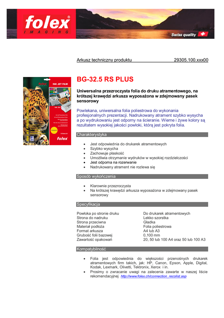 Arkusz techniczny produktu 29305.100.xxx00 BG-32.5 RS PLUS Uniwersalna przezroczysta folia do druku atramentowego, na krótszej kraw dzi arkusza wyposa ona w zdejmowany pasek sensorowy Powlekana, uniwersalna folia poliestrowa do wykonania profesjonalnych prezentacji. Nadrukowany atrament szybko wysycha a po wydrukowaniu jest odporny na cieranie. Wierne i ywe kolory s rezultatem wysokiej jako ci pow oki, któr jest pokryta folia. Charakterystyka Jest odpowiednia do drukarek atramentowych Szybko wysycha Zachowuje p asko Umo liwia otrzymanie wydruków w wysokiej rozdzielczo ci Jest odporna na rozerwanie Nadrukowany atrament nie rozlewa si Sposób wyko czenia Klarownie przezroczysta Na krótszej kraw dzi arkusza wyposa ona w zdejmowany pasek sensorowy Specyfikacja Pow oka po stronie druku Strona do nadruku Strona przeciwna Materia pod a Format arkusza Grubo folii bazowej Zawarto opakowa Do drukarek atramentowych Lekko szorstka adka Folia poliestrowa A4 lub A3 0,100 mm 20, 50 lub 100 A4 oraz 50 lub 100 A3 Kompatybilno Folia jest odpowiednia do wi kszo ci przeno nych drukarek atramentowych firm takich, jak: HP, Canon, Epson, Apple, Digital, Kodak, Lexmark, Olivetti, Tektronix, Xerox i in. Prosimy o zwracanie uwagi na zalecenia zawarte w naszej li cie rekomendacyjnej http://www.folex.ch/connection_recolist.asp Arkusz techniczny produktu d.c. 29305.100.xxx00 Drukowanie W celu w ciwego wprowadzenia folii do drukarki, nale y uwzgl dnia instrukcj urz dzenia oraz instrukcj umieszczon w opakowaniu folii. Produkt nale y chroni przed wilgoci i pozostawianiem odcisków palców. Sk adowanie Otworzone opakowania nale y przechowywa w temperaturze 15-250C i wilgotno ci wzgl dnej 30-60%. Sk adowanie w pomieszczeniach ch odnych i suchych. W zamkni tych opakowaniach nie nale y przechowywa folii d ej, ni przez 1 rok. Opakowania Formaty Art.-Nr 29305.100.52000 29305.100.44100 29305.100.44000 29305.100.43100 29305.100.43000 Grubo w mm 0,100 0,100 0,100 0,100 0,100 Format Ark./opak. A4 A4 A4 A3 A3 20 50 100 50 100 02.2010