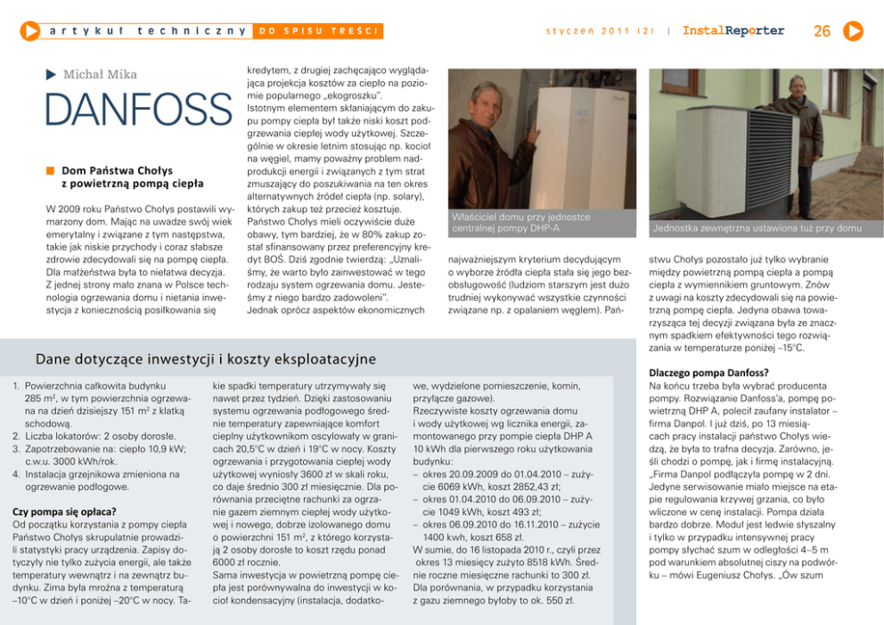 a r t y k u ł t e c h n i c z n y Michał Mika DANFOSS Dom Państwa Chołys z powietrzną pompą ciepła W 2009 roku Państwo Chołys postawili wymarzony dom. Mając na uwadze swój wiek emerytalny i związane z tym następstwa, takie jak niskie przychody i coraz słabsze zdrowie zdecydowali się na pompę ciepła. Dla małżeństwa była to niełatwa decyzja. Z jednej strony mało znana w Polsce technologia ogrzewania domu i nietania inwestycja z koniecznością posiłkowania się D O S P I S U styczeń T R E Ś C I kredytem, z drugiej zachęcająco wyglądająca projekcja kosztów za ciepło na poziomie popularnego „ekogroszku”. Istotnym elementem skłaniającym do zakupu pompy ciepła był także niski koszt podgrzewania ciepłej wody użytkowej. Szczególnie w okresie letnim stosując np. kocioł na węgiel, mamy poważny problem nadprodukcji energii i związanych z tym strat zmuszający do poszukiwania na ten okres alternatywnych źródeł ciepła (np. solary), których zakup też przecież kosztuje. Państwo Chołys mieli oczywiście duże obawy, tym bardziej, że w 80% zakup został sfinansowany przez preferencyjny kredyt BOŚ. Dziś zgodnie twierdzą: „Uznaliśmy, że warto było zainwestować w tego rodzaju system ogrzewania domu. Jesteśmy z niego bardzo zadowoleni”. Jednak oprócz aspektów ekonomicznych Właściciel domu przy jednostce centralnej pompy DHP-A najważniejszym kryterium decydującym o wyborze źródła ciepła stała się jego bezobsługowość (ludziom starszym jest dużo trudniej wykonywać wszystkie czynności związane np. z opalaniem węglem). Pań- Dane dotyczące inwestycji i koszty eksploatacyjne 1. Powierzchnia całkowita budynku 285 m2, w tym powierzchnia ogrzewana na dzień dzisiejszy 151 m2 z klatką schodową. 2. Liczba lokatorów: 2 osoby dorosłe. 3. Zapotrzebowanie na: ciepło 10,9 kW; c.w.u. 3000 kWh/ rok. 4. Instalacja grzejnikowa zmieniona na ogrzewanie podłogowe. Czy pompa się opłaca? Od początku korzystania z pompy ciepła Państwo Chołys skrupulatnie prowadzili statystyki pracy urządzenia. Zapisy dotyczyły nie tylko zużycia energii, ale także temperatury wewnątrz i na zewnątrz budynku. Zima była mroźna z temperaturą –10°C w dzień i poniżej –20°C w nocy. Ta- kie spadki temperatury utrzymywały się nawet przez tydzień. Dzięki zastosowaniu systemu ogrzewania podłogowego średnie temperatury zapewniające komfort cieplny użytkownikom oscylowały w granicach 20,5°C w dzień i 19°C w nocy. Koszty ogrzewania i przygotowania ciepłej wody użytkowej wyniosły 3600 zł w skali roku, co daje średnio 300 zł miesięcznie. Dla porównania przeciętne rachunki za ogrzanie gazem ziemnym ciepłej wody użytkowej i nowego, dobrze izolowanego domu o powierzchni 151 m2, z którego korzystają 2 osoby dorosłe to koszt rzędu ponad 6000 zł rocznie. Sama inwestycja w powietrzną pompę ciepła jest porównywalna do inwestycji w kocioł kondensacyjny (instalacja, dodatko- 2011 we, wydzielone pomieszczenie, komin, przyłącze gazowe). Rzeczywiste koszty ogrzewania domu i wody użytkowej wg licznika energii, zamontowanego przy pompie ciepła DHP A 10 kWh dla pierwszego roku użytkowania budynku: – okres 20.09.2009 do 01.04.2010 – zużycie 6069 kWh, koszt 2852,43 zł; – okres 01.04.2010 do 06.09.2010 – zużycie 1049 kWh, koszt 493 zł; – okres 06.09.2010 do 16.11.2010 – zużycie 1400 kwh, koszt 658 zł. W sumie, do 16 listopada 2010 r., czyli przez okres 13 miesięcy zużyto 8518 kWh. Średnie roczne miesięczne rachunki to 300 zł. Dla porównania, w przypadku korzystania z gazu ziemnego byłoby to ok. 550 zł. (2) 26 Jednostka zewnętrzna ustawiona tuż przy domu stwu Chołys pozostało już tylko wybranie między powietrzną pompą ciepła a pompą ciepła z wymiennikiem gruntowym. Znów z uwagi na koszty zdecydowali się na powietrzną pompę ciepła. Jedyna obawa towarzysząca tej decyzji związana była ze znacznym spadkiem efektywności tego rozwiązania w temperaturze poniżej –15°C. Dlaczego pompa Danfoss? Na końcu trzeba była wybrać producenta pompy. Rozwiązanie Danfoss’a, pompę powietrzną DHP A, polecił zaufany instalator – firma Danpol. I już dziś, po 13 miesiącach pracy instalacji państwo Chołys wiedzą, że była to trafna decyzja. Zarówno, jeśli chodzi o pompę, jak i firmę instalacyjną. „Firma Danpol podłączyła pompę w 2 dni. Jedyne serwisowanie miało miejsce na etapie regulowania krzywej grzania, co było wliczone w cenę instalacji. Pompa działa bardzo dobrze. Moduł jest ledwie słyszalny i tylko w przypadku intensywnej pracy pompy słychać szum w odległości 4–5 m pod warunkiem absolutnej ciszy na podwórku – mówi Eugeniusz Chołys. „Ów szum a r t y k u ł t e c h n i c z n y związany jest z pracą wentylatora na najwyższych obrotach”. – komentuje instalator z firmy Danpol. Dwufunkcyjna pompa ciepła Danfoss w wersji DHP-A jest innowacyjnym rozwiązaniem wykorzystujących darmowe ciepło zawarte w powietrzu zewnętrznym. Składa się z dwóch elementów – jednostki centralnej i modułu zewnętrznego. Umieszczenie jednostki centralnej wewnątrz budynku chroni ją przed wpływem warunków atmosferycznych, co zwiększa jej trwałość i niezawodność, eliminuje straty energii do otoczenia i ułatwia obsługę panelu sterowania. Umiejscowienie modułu zewnętrznego poza budynkiem gwarantuje zachowanie stałego przepływu powietrza podczas normalnej czy wzmożonej pracy jednostki centralnej. Taka lokalizacja jest rozwiązaniem optymalnym, bowiem unikamy wprowadzania do budynku zimnego powietrza, a co za tym idzie strat ciepła. W celu utrzymania wysokiej sprawności modułu zewnętrznego Danfoss zaprojektował automatyczny system odszraniania, co dodatkowo minimalizuje zużycie energii elektrycznej, a także pozwala na skuteczną pracę nawet do –20°C. Pompa ciepła DHP-A jest całkowicie bezobsługowa. Cały rok w zależności od potrzeb dostarc