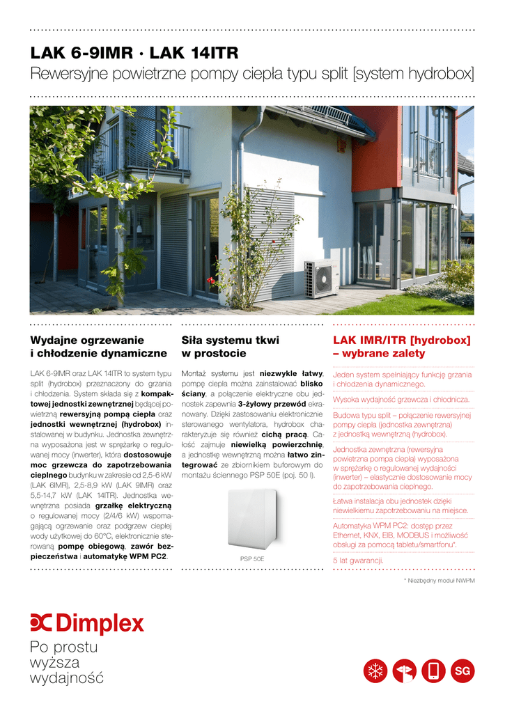 LAK 6-9IMR · LAK 14ITR Rewersyjne powietrzne pompy ciepła typu split [system hydrobox] Wydajne ogrzewanie i chłodzenie dynamiczne Siła systemu tkwi w prostocie LAK IMR/ITR [hydrobox] – wybrane zalety LAK 6-9IMR oraz LAK 14ITR to system typu split (hydrobox) przeznaczony do grzania i chłodzenia. System składa się z kompaktowej jednostki zewnętrznej będącej powietrzną rewersyjną pompą ciepła oraz jednostki wewnętrznej (hydrobox) instalowanej w budynku. Jednostka zewnętrzna wyposażona jest w sprężarkę o regulowanej mocy (inwerter), która dostosowuje moc grzewcza do zapotrzebowania cieplnego budynku w zakresie od 2,5-6 kW (LAK 6IMR), 2,5-8,9 kW (LAK 9IMR) oraz 5,5-14,7 kW (LAK 14ITR). Jednostka wewnętrzna posiada grzałkę elektryczną o regulowanej mocy (2/4/6 kW) wspomagającą ogrzewanie oraz podgrzew ciepłej wody użytkowej do 60°C, elektronicznie sterowaną pompę obiegową, zawór bezpieczeństwa i automatykę WPM PC2. Montaż systemu jest niezwykle łatwy, pompę ciepła można zainstalować blisko ściany, a połączenie elektryczne obu jednostek zapewnia 3-żyłowy przewód ekranowany. Dzięki zastosowaniu elektronicznie sterowanego wentylatora, hydrobox charakteryzuje się również cichą pracą. Całość zajmuje niewielką powierzchnię, a jednostkę wewnętrzną można łatwo zintegrować ze zbiornikiem buforowym do montażu ściennego PSP 50E (poj. 50 l). Jeden system spełniający funkcję grzania i chłodzenia dynamicznego. Wysoka wydajność grzewcza i chłodnicza. Budowa typu split – połączenie rewersyjnej pompy ciepła (jednostka zewnętrzna) z jednostką wewnętrzną (hydrobox). Jednostka zewnętrzna (rewersyjna powietrzna pompa ciepła) wyposażona w sprężarkę o regulowanej wydajności (inwerter) – elastycznie dostosowanie mocy do zapotrzebowania cieplnego. Łatwa instalacja obu jednostek dzięki niewielkiemu zapotrzebowaniu na miejsce. Automatyka WPM PC2: dostęp przez Ethernet, KNX, EIB, MODBUS i możliwość obsługi za pomocą tabletu/smartfonu*. PSP 50E 5 lat gwarancji. * Niezbędny moduł NWPM Po prostu wyższa wydajność SG LAK 6-9IMR · LAK 14ITR – dane techniczne Made in Germany Simply More Quality COP 3,6 wydajność do1) COP 3,6 wydajność do1) LAK 14ITR LAK 6-9IMR Model LAK 6IMR LAK 9IMR LAK 14ITR Efektywność / klasa efektywności energetycznej (temp. zasil. 35°C) 150% 165% 153% Efektywność / klasa efektywności energetycznej (temp. zasil. 55°C) 110% 112% 110% Kolor obudowy biały biały biały Maks. temperatura zasilania 55°C 55°C 55°C Dolna / górna granica zastosowania źródła ciepła (ogrzewanie) – 20 / + 30 °C – 20 / + 30 °C – 20 / + 30 °C Dolna / górna granica zastosowania źródła ciepła (chłodzenie) +10 / +43°C Moc grzewcza / COP przy A-7/W35 4,2 kW/2,8 · 4,2 kW/2,8 2) +10 / +43°C 3) 6,7 kW/2,8 · 6,7 kW/2,8 2) +10 / +43°C 3) 13,9 kW/2,9 2) · 13,9 kW/2,9 3) Moc grzewcza / COP przy A2/W35 1) 4,8 kW/3,4 2) · 4,8 kW/3,4 3) 5,3 kW/3,6 2) · 6,2 kW/3,2 3) 10,5 kW/3,6 2) · 11,0 kW/3,2 3) Moc grzewcza / COP przy A7/W35 1) 5,6 kW/4,8 2) · 5,6 kW/4,8 3) 5,6 kW/4,8 2) · 9,0 kW/4,3 3) 10,6 kW/4,1 2) · 14,7 kW/4,3 3) Moc chłodzenia / EER przy A27/W7 1) 6,5 kW/3,3 3) 6,5 kW/3,3 3) 12,9 kW/3,0 3) Poziom mocy akustycznej wg EN 12102 część zewn. / wewn. 63 / 42 dB (A) 63 / 42 dB (A) 67 / 42 dB (A) Poziom ciśnienia akustycznego w odl. 1 m część zewn. / wewn. 51 / 35 dB (A) 51 / 35 dB (A) 54 / 35 dB (A) Oznaczenie / masa czynnika chłodniczego R410A / 1,9 kg R410A / 1,9 kg R410A / 2,98 kg Maks. przepływ nośnika ciepła źródła górnego / opory hydrauliczne 1,6 m³/h / 20000 Pa 1,6 m³/h / 20000 Pa 2,4 m³/h / 30400 Pa Wymiary jednostki zewnętrznej (szer. x wys. x gł.) Wymiary jednostki wewnętrznej (szer. x wys. x gł.) 4) 950 x 834 x 330 mm 450 x 670 x 240 mm 950 x 834 x 330 mm 450 x 670 x 240 mm 950 x 1380 x 330 mm 450 x 670 x 240 mm Masa urządzenia: jednostka zewnętrzna / wewnętrzna 69 / 24 kg 69 / 24 kg 116 / 25 kg Napięcie zasilania 1/N/PE ~230 V, 50 Hz 3/N/PE ~400 V, 50 Hz 1/N/PE ~230 V, 50 Hz 3/N/PE ~400 V, 50 Hz 3/N/PE ~400 V, 50 Hz Sposób odszraniania Odwrócenie obiegu Odwrócenie obiegu Odwrócenie obiegu Króćce przyłączeniowe górnego źródła ciepła GZ 1" GZ 1" GZ 1" 4) EN 14511 Wartości dla optymalnej pracy 3) Wartości przy maksymalnej mocy grzewczej/chłodniczej 4) Należy uwzględnić dodatkowe miejsce do przyłączenia rur, obsługi i konserwacji Ze względu na wymagane kwalifikacje w zakresie chłodnictwa, uruchomienie musi być bezwzględnie przeprowadzone przez autoryzowany serwis (IN 03 WPS) 1) 2) Po prostu odwiedź naszą stronę internetową: www.dimplex.pl Glen Dimplex Polska Sp. z o.o. ul. Strzeszyńska 33, 60-479 Poznań · tel. 61 842 58 05 · fax: 61 842 58 06 [email protected] · www.dimplex.pl Projekt nr 041/01. Zastrzegamy sobie prawo do zmian i odstępstw w kolorach. 1)