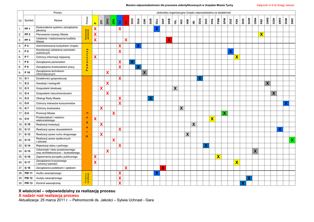 Macierz odpowiedzialności dla procesów zidentyfikowanych w Urzędzie Miasta Tychy Działalności gospodarczej 11. G 2 Geodezji i kartografii 12. G 3 Gospodarki lokalowej 13. G 4 Gospodarki nieruchomościami 14. G 5 Obsługi Rady Miasta 15. G 6 Ochrony interesów konsumentów 16. G 7 Ochrony środowiska 17. G 8 Promocji Miasta 18. G 9 Przekształceń i nadzoru właścicielskiego 19. G 10 Realizacji inwestycji 20. G 11 Realizacji spraw obywatelskich 21. G 12 Realizacji spraw ruchu drogowego 22. G 13 Realizacji spraw społecznych i zdrowia 23. G 14 Rejestracji stanu cywilnego 24. G 15 Urbanistyki i ładu przestrzennego oraz architektoniczno – budowlanego 25. G 16 Zapewnienia porządku publicznego 26. G 17 Zarządzania kryzysowego i ochrony ludności 27. G 18 Zarządzania podatkami i opłatami 28. PW 11 Auditu wewnętrznego 29. PW 12 Audytu wewnętrznego 30. PW 13 Kontroli wewnętrznej X SWZ DUM X X X X X X X X X X X X X X X X X X X X X X X w SWO X X X X ó GGN X X X X ł X X X G GWG X X X X X X X X X X X X X weryfikacja X Pomocniczy PRF GWA DUW DUK X X 10. G 1 PZK Zarządzania technikami informatycznymi DUZ P 10 SPW 9. PSM Zarządzania środowiskiem pracy PPN P9 DUC 8. DUG Zarządzania personelem IRI P8 IKM 7. IKO Ochrony informacji niejawnej IGL P7 DKB 6. X DKP Koordynacji udzielania zamówień publicznych DUR P5 GWI 5. DUA Administrowania budynkiem Urzędu DUO P4 DK 4. X X X DU PP 3 ZPS 3. Ustalania i nadzorowania budżetu Miasta ZPG Planowania rozwoju Miasta ZPI PP 2 P 2. Rodzaj Doskonalenia systemu zarządzania jakością Pomocniczy planowanie PP 1 Pomocniczy 1. y Nazwa n Symbol DUJ Jednostka organizacyjna Urzędu odpowiedzialna za działalność Proces Lp Załącznik nr 6 do Księgi Jakości X X X X właściciel – odpowiedzialny za realizację procesu X nadzór nad realizacją procesu Aktualizacja: 25 marca 2011 r. – Pełnomocnik ds. Jakości – Sylwia Uchnast - Gara X X X X