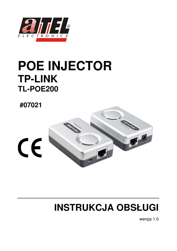 POE INJECTOR TP-LINK TL-POE200 #07021 INSTRUKCJA OBSŁUGI wersja 1.0 TL-POE200 SPIS TREŚCI Wstęp ................................................................................................. 3 Bezpieczeństwo uŜytkowania ........................................................ 3 1. Zawartość opakowania............................................................. 3 2. Zasady bezpieczeństwa ........................................................... 3 3. Budowa urządzenia .................................................................. 4 4. Instalacja urządzenia ................................................................ 4 5. Składowanie zuŜytego sprzętu ............................................... 6 6. Parametry techniczne ............................................................... 6 2 TL-POE200 Wstęp Injector słuŜy do zasilania urządzeń z opcją PoE przy uŜyciu okablowania sieciowego UTP. Dzięki PoE moŜliwe jest zasilanie urządzeń w miejscach, gdzie problematyczne jest poprowadzenie standardowego okablowania zasilającego. Bezpieczeństwo uŜytkowania Urządzenie zostało zaprojektowane i wyprodukowane z najwyŜszą starannością o bezpieczeństwo osób instalujących i uŜytkujących. Dla zapewnienia bezpieczeństwa pracy, naleŜy stosować się do wszelkich wskazań zawartych w tej instrukcji jak i instrukcjach obsługi urządzeń towarzyszących. Przed przystąpieniem do instalacji urządzenia naleŜy dokładnie przeczytać całość tej instrukcji, w szczególności zaś punkty poświęcone bezpieczeństwu. NaleŜy zapewnić bezpieczne warunki pracy urządzenia. Dokonanie przez uŜytkownika jakichkolwiek własnych zmian w urządzeniu moŜe spowodować utratę moŜliwości jego legalnego uŜytkowania. Urządzenie zostało poddane obowiązkowej ocenie zgodności i spełnienia zasadnicze wymagania zawarte w europejskich Dyrektywach Nowego Podejścia. Produkt jest oznakowany znakiem CE. 1. Zawartość opakowania injector PoE, zasilacz, kabel zasilający, kabel sieciowy (cat. 5 UTP), instrukcja obsługi w języku angielskim, niniejsza instrukcja obsługi. Podczas dostawy naleŜy upewnić się, Ŝe opakowanie nie jest uszkodzone. W przypadku stwierdzonych uszkodzeń naleŜy niezwłocznie skontaktować się z dostawcą. Prosimy równieŜ o sprawdzenie zgodności zawartości opakowania z powyŜej zamieszczoną listą. 2. Zasady bezpieczeństwa Urządzenie jest zgodne z przepisami w zakresie bezpieczeństwa uŜytkowania urządzeń elektrycznych. NaleŜy przestrzegać następujących zaleceń: - gniazdo sieciowe musi być uziemione zgodnie z obowiązującymi przepisami, - przed przeniesieniem lub wykonywaniem innych operacji technicznych urządzenie naleŜy odłączyć od zasilania, - nie stosować uszkodzonych lub zuŜytych przewodów zasilania, gdyŜ powodują one znaczne zagroŜenie dla bezpieczeństwa uŜytkownika, - prace instalacyjne muszą być wykonywane przez odpowiednio przeszkolony personel techniczny, - nie stosować urządzenia w miejscach występowania substancji łatwopalnych, - zabezpieczyć urządzenie przed dostępem dzieci lub osób niepowołanych, - upewnić się, Ŝe urządzenie zostało odpowiednio zamocowane, - urządzenie traktowane jest jako wyłączone dopiero po odłączeniu przewodów zasilania oraz przewodów łączących je z innymi urządzeniami, - jeśli urządzenie zostanie przeniesione z miejsca chłodnego do ciepłego, w jego wnętrzu moŜe skroplić się para wodna uniemoŜliwiając prawidłowe funkcjonowanie. NaleŜy wówczas odczekać, aŜ wilgoć odparuje. 3 TL-POE200 Uwaga: Nie naleŜy dotykać styków gniazd znajdujących się na obudowie urządzenia. Wyładowanie elektrostatyczne moŜe spowodować trwałe uszkodzenie urządzenia. 3. Budowa urządzenia Przełącznik zmiany poziomów zasilania (12; 9; 5 V) Złącze RJ-45 (zasilanie + transmisja danych) Port LAN (cat.5) (do podłączenia routera/przełącznika) Gniazdo zasilania 48V (do podłączenia zasilacza) Dioda zasilania (włączona dioda oznacza prawidłowe działanie) 4. Instalacja urządzenia Aby poprawnie podłączyć urządzenia naleŜy: − − − − − uŜyć kabla UTP cat.5 do podłączenia portu Ethernet urządzenia sieciowego (np. routera, przełącznika) do portu LAN IN urządzenia, Ustawić poziom napięcia zasilania za pomocą przełącznika. podłączyć zasilacz do gniazdka zasilania przy uŜyciu kabla zasilającego, podłączyć zasilacz do gniazdka DC 48V urządzenia, podłączyć kablem UTP cat.5 urządzenie PoE do gniazdka POWER + DATA OUT. Istnieją swa sposoby podłączenia urządzeń: 1) Podłączenie injectora do urządzenia PoE (na przykład kamery internetowej PoE). 4 TL-POE200 2) Podłączenie injectora do urządzenia nie wspierającego technologii PoE. W tym przypadku naleŜy podłączyć do injectora splitter TL-POE200B. Do splittera naleŜy następnie podłączyć urządzenie sieciowe (przy pomocy kabla zasilającego i kabla UTP cat.5). 5 TL-POE200 5. Składowanie zuŜytego sprzętu Informacja dla uŜytkowników o pozbywaniu się urządzeń elektrycznych i elektronicznych (dotyczy gospodarstw domowych). Przedstawiony symbol umieszczony na produktach lub dołączonej do nich dokumentacji informuje, Ŝe niesprawnych urządzeń elektrycznych lub elektronicznych nie moŜna wyrzucać razem z odpadami gospodarczymi. Prawidłowe postępowanie w razie konieczności utylizacji, powtórnego uŜycia lub odzysku podzespołów polega na przekazaniu urządzenia do wyspecjalizowanego punktu zbiórki, gdzie będzie przyjęte bezpłatnie. W niektórych krajach produkt moŜna oddać lokalnemu dystrybutorowi podczas zakupu innego urządzenia. Prawidłowa utylizacja urządzenia umoŜliwia zachowanie cennych zasobów i uniknięcie negatywnego wpływu na zdrowie i środowisko, które moŜe być zagroŜone przez nieodpowiednie postępowanie z odpadami. Szczegółowe informacje o najbliŜszym punkcie zbiórki moŜna uzyskać u władz lokalnych. Niepraw
