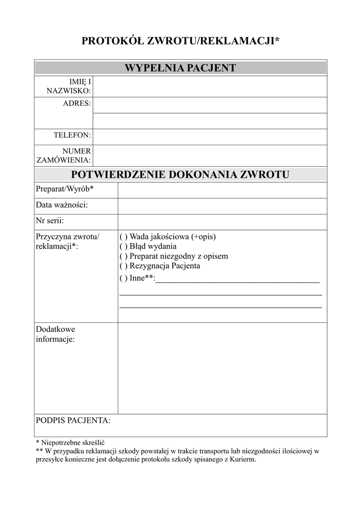 PROTOKÓŁ ZWROTU/REKLAMACJI* WYPEŁNIA PACJENT IMIĘ I NAZWISKO: ADRES: TELEFON: NUMER ZAMÓWIENIA: POTWIERDZENIE DOKONANIA ZWROTU Preparat/Wyrób* Data ważności: Nr serii: Przyczyna zwrotu/ reklamacji*: ( ) Wada jakościowa (+opis) ( ) Błąd wydania ( ) Preparat niezgodny z opisem ( ) Rezygnacja Pacjenta ( ) Inne**:______________________________ _____________________________________ _____________________________________ Dodatkowe informacje: PODPIS PACJENTA: * Niepotrzebne skreślić ** W przypadku reklamacji szkody powstałej w trakcie transportu lub niezgodności ilościowej w przesyłce konieczne jest dołączenie protokołu szkody spisanego z Kurierm. WYPEŁNIA APTEKA Zwrot przyjęto dnia: STATUS : SPOSÓB ROZPATRZENIA APTEKA GEMINI _______________________ Podpis Pracownika Apteki Trzy Lipy 3 80-172 Gdańsk