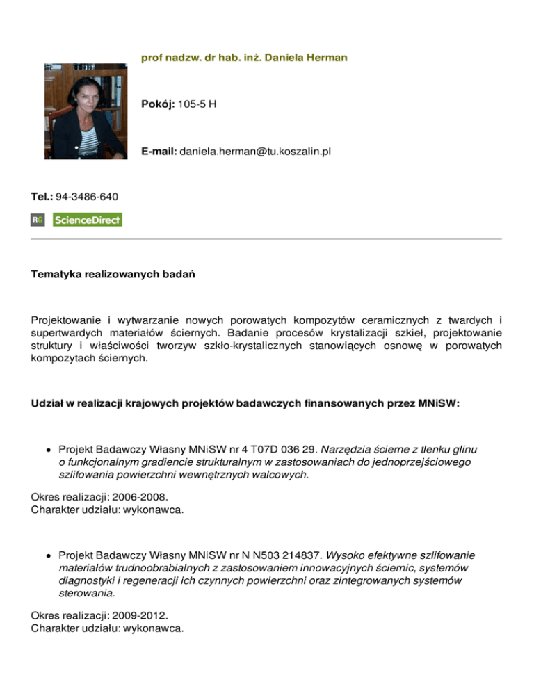 prof nadzw. dr hab. inż. Daniela Herman Pokój: 105-5 H E