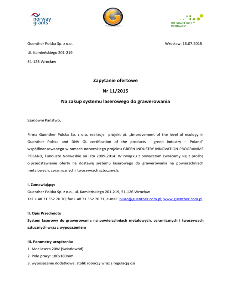 Guenther Polska Sp. z o.o. Wrocław, 15.07.2015 Ul. Kamieńskiego 201-219 51-126 Wrocław Zapytanie ofertowe Nr 11/2015 Na zakup systemu laserowego do grawerowania Szanowni Państwo, Firma Guenther Polska Sp. z o.o. realizuje projekt pt. „Improvement of the level of ecology in Guenther Polska and DNV GL certification of the products - green industry – Poland” współfinansowanego w ramach norweskiego projektu GREEN INDUSTRY INNOVATION PROGRAMME POLAND, Fundusze Norweskie na lata 2009-2014. W związku z powyższym zwracamy się z prośbą o przedstawienie oferty na dostawę systemu laserowego do grawerowania na powierzchniach metalowych, ceramicznych i tworzywach sztucznych. I. Zamawiający: Guenther Polska Sp. z o.o., ul. Kamieńskiego 201-219, 51-126 Wrocław Tel. + 48 71 352 70 70; fax + 48 71 352 70 71, e-mail: [email protected]; www.guenther.com.pl II. Opis Przedmiotu System laserowy do grawerowania na powierzchniach metalowych, ceramicznych i tworzywach sztucznych wraz z wyposażeniem III. Parametry urządzenia: 1. Moc lasera 20W (światłowód) 2. Pole pracy: 180x180mm 3. wyposażenie dodatkowe: stolik roboczy wraz z regulacją osi 4. okulary ochronne 5. starter noży IV. Wskazania dodatkowe: 1. Oprogramowanie w j. polskim wraz z komputerem PC i monitorem 2. Szkolenie po dostawie urządzenia w siedzibie odbiorcy 3. Transport V. Kryteria zgodnie, z którymi zostanie wyłoniona najkorzystniejsza oferta: 1. Dane techniczne ( zgodne z opisem i parametrami produktu) 2. Cena 3. Termin Realizacji 4. Obsługa serwisowa 5. Obsługa gwarancyjna VI. Termin nadsyłania ofert: 1. Oferta powinna zostać przesłana w ciągu 5 dni roboczych od dnia wysłania oferty 2. Oferta powinna zostać przesłana drogą elektroniczną na adres e-mail: [email protected] Zapytanie ofertowe zostało wysłane do 3 wybranych dostawców z branży, którzy specjalizują się w produkcji, sprzedaży bądź dystrybucji produktu, który jest przedmiotem zapytania. Planowany termin rozstrzygnięcia postępowania ofertowego i wywołanie oferenta nastąpi nie później niż do 5 dni roboczych od momentu otrzymania ostatniej oferty. Miejsce dostawy: Guenther Polska Sp. z o.o., Ul. Wrocławska 24b, 55-090 Długołęka Osoby kontaktowe: Krystian Korgiel Wojciech Kuta