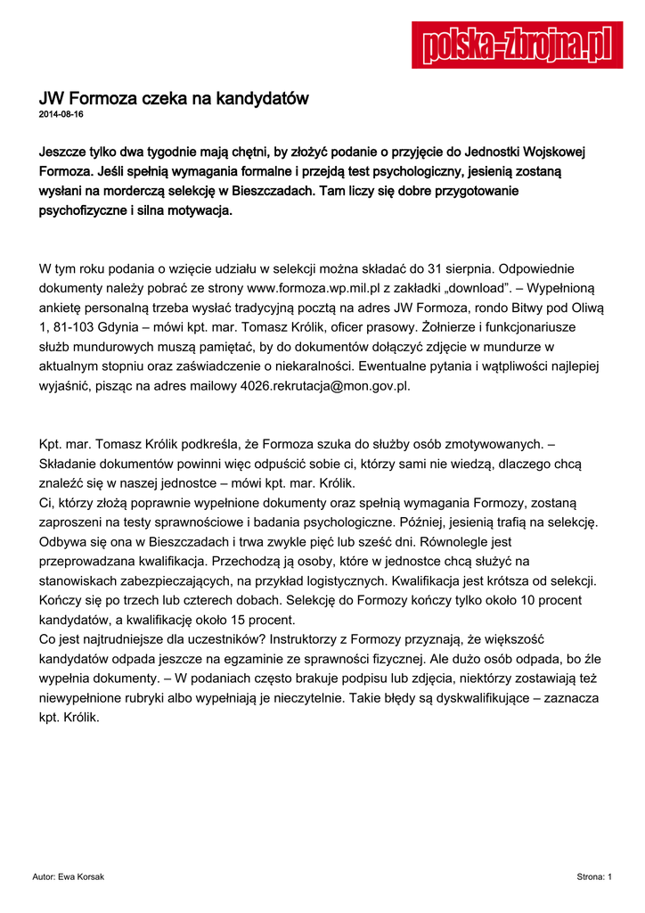 JW Formoza czeka na kandydatów 2014-08-16 Jeszcze tylko dwa tygodnie mają chętni, by złożyć podanie o przyjęcie do Jednostki Wojskowej Formoza. Jeśli spełnią wymagania formalne i przejdą test psychologiczny, jesienią zostaną wysłani na morderczą selekcję w Bieszczadach. Tam liczy się dobre przygotowanie psychofizyczne i silna motywacja. W tym roku podania o wzięcie udziału w selekcji można składać do 31 sierpnia. Odpowiednie dokumenty należy pobrać ze strony www.formoza.wp.mil.pl z zakładki „download”. – Wypełnioną ankietę personalną trzeba wysłać tradycyjną pocztą na adres JW Formoza, rondo Bitwy pod Oliwą 1, 81-103 Gdynia – mówi kpt. mar. Tomasz Królik, oficer prasowy. Żołnierze i funkcjonariusze służb mundurowych muszą pamiętać, by do dokumentów dołączyć zdjęcie w mundurze w aktualnym stopniu oraz zaświadczenie o niekaralności. Ewentualne pytania i wątpliwości najlepiej wyjaśnić, pisząc na adres mailowy [email protected]. Kpt. mar. Tomasz Królik podkreśla, że Formoza szuka do służby osób zmotywowanych. – Składanie dokumentów powinni więc odpuścić sobie ci, którzy sami nie wiedzą, dlaczego chcą znaleźć się w naszej jednostce – mówi kpt. mar. Królik. Ci, którzy złożą poprawnie wypełnione dokumenty oraz spełnią wymagania Formozy, zostaną zaproszeni na testy sprawnościowe i badania psychologiczne. Później, jesienią trafią na selekcję. Odbywa się ona w Bieszczadach i trwa zwykle pięć lub sześć dni. Równolegle jest przeprowadzana kwalifikacja. Przechodzą ją osoby, które w jednostce chcą służyć na stanowiskach zabezpieczających, na przykład logistycznych. Kwalifikacja jest krótsza od selekcji. Kończy się po trzech lub czterech dobach. Selekcję do Formozy kończy tylko około 10 procent kandydatów, a kwalifikację około 15 procent. Co jest najtrudniejsze dla uczestników? Instruktorzy z Formozy przyznają, że większość kandydatów odpada jeszcze na egzaminie ze sprawności fizycznej. Ale dużo osób odpada, bo źle wypełnia dokumenty. – W podaniach często brakuje podpisu lub zdjęcia, niektórzy zostawiają też niewypełnione rubryki albo wypełniają je nieczytelnie. Takie błędy są dyskwalifikujące – zaznacza kpt. Królik. Autor: Ewa Korsak Strona: 1