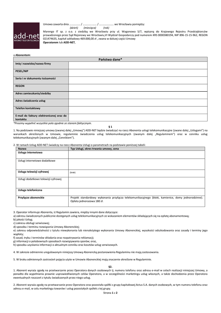 Umowa zawarta dnia ……….…… / …………..…… / …..……………. we Wrocławiu pomiędzy: (dzień) (miesiąca) (rok) Marengo IT sp. z o.o. z siedzibą we Wrocławiu przy ul. Wagonowa 5/7, wpisaną do Krajowego Rejestru Przedsiębiorców prowadzonego przez Sąd Rejonowy we Wrocławiu,VI Wydział Gospodarczy pod numerem KRS 0000380194, NIP 896-15-15-962, REGON 021474635, kapitał zakładowy 469.000,00 zł , zwana w dalszej części Umowy Operatorem lub ADD-NET, a Abonentem: Państwa dane* Imię i nazwisko/nazwa firmy PESEL/NIP Seria i nr dokumentu tożsamości REGON Adres zamieszkania/siedziby Adres świadczenia usług Telefon kontaktowy E-mail do faktury elektronicznej oraz do kontaktu *Prosimy wypełnić wszystkie pola zgodnie ze stanem faktycznym. §1 1. Na podstawie niniejszej umowy (zwanej dalej „Umową”) ADD-NET będzie świadczyć na rzecz Abonenta usługi telekomunikacyjne (zwane dalej „Usługami”) na warunkach określonych w Umowie, regulaminie świadczenia usług telekomunikacyjnych (zwanym dalej „Regulaminem”) oraz w cenniku usług telekomunikacyjnych (zwanym dalej „Cennikiem”). 2. W ramach Usług ADD-NET świadczy na rzecz Abonenta Usługi o parametrach na podstawie poniższej tabeli: Nazwa Typ Usługi, okres trwania umowy, cena Usługa internetowa Usługi internetowe dodatkowe Usługa telewizji cyfrowej (brak) Usługi dodatkowe telewizji cyfrowej Usługa telefoniczna Przyłącze abonenckie Projekt standardowy wykonania przyłącza telekomunikacyjnego (bloki, kamienice, domy jednorodzinne). Opłata jednorazowa 180 zł. 3. Operator informuje Abonenta, iż Regulamin zawiera, między innymi dane dotyczące: a) zakresu świadczonych publicznie dostępnych usług telekomunikacyjnych ze wskazaniem elementów składających się na opłatę abonamentową; b) jakości Usług; c) zakresu obsługi serwisowej; d) sposobu i terminu rozwiązania Umowy Abonenckiej; e) zakresu odpowiedzialności z tytułu niewykonania lub nienależytego wykonania Umowy Abonenckiej, wysokości odszkodowania oraz zasady i terminy jego wypłaty; f) zasad, trybu i terminów składania oraz rozpatrywania reklamacji; g) informacji o polubownych sposobach rozwiązywania sporów; oraz, h) sposobu uzyskania informacji o aktualnym cenniku oraz kosztów usług serwisowych. 4. W zakresie odmiennie uregulowanym niniejszą Umową Abonencką postanowienia Regulaminu nie mają zastosowania. 5. W braku odmiennych zastrzeżeń pojęcia użyte w Umowie Abonenckiej mają znaczenie określone w Regulaminie. §2. 1. Abonent wyraża zgodę na przetwarzanie przez Operatora danych osobowych tj. numeru telefonu oraz adresu e-mail w celach realizacji niniejszej Umowy, a ponadto dla wypełniania prawnie usprawiedliwionych celów Operatora, a w szczególności marketingu usług własnych, a także dochodzenia przez Operatora ewentualnych roszczeń z tytułu świadczonych przez niego usług. 2. Abonent wyraża zgodę na przetwarzanie przez Operatora oraz pozostała spółki z grupy kapitałowej Actus S.A. danych osobowych, w tym numeru telefonu oraz adresu e-mail, w celu marketingu towarów i usług pozostałych spółek z tej grupy. Strona 1 z 2 3. Abonent wyraża zgodę na wysyłanie i przesyłanie w formie elektronicznej faktur lub rachunków za usługi świadczone przez Operatora na podstawie niniejszej Umowy. Informacje o wystawieniu faktury elektronicznej lub elektronicznego rachunku będą każdorazowo przesyłane przez Operatora na adres e-mail wskazany w niniejszej Umowie przez Abonenta. 4. Abonent oświadcza, że zapoznał się z Cennikiem oraz Regulaminem i akceptuje postanowienia obu dokumentów będących jednolitą częścią niniejszej Umowy. 5. Abonent oświadcza, że przystępuje do niniejszej Umowy na zasadach określonych w niej, w Cenniku i w Regulaminie. §3. 1. Okresem Rozliczeniowym jest okres jednego miesiąca, za który dokonywane są rozliczenia należności Abonenta wobec Operatora z tytułu świadczonych Usług, rozpoczynający i kończący się w dniach wskazanych przez Operatora na Rachunku. §4. 1. Operator umożliwia Abonentowi zmianę warunków Umowy Abonenckiej za pomocą środków porozumiewania się na odległość, za pośrednictwem poczty elektronicznej przy wykorzystaniu skrzynki pocztowej Operatora pod adresem e-mail [email protected]. Zmiana, o której mowa w niniejszym ustępie może dotyczyć następujących postanowień Umowy Abonenckiej: a) rodzaju świadczonych Usług; b) okresu na jaki została zawarta umowa; c) Pakietu Taryfowego, jeżeli na świadczone Usługi obowiązywały różne Pakiety Taryfowe; d) sposobów składania zamówień na Pakiet Taryfowy lub usługi dodatkowe; e) zakresu świadczonych usług telekomunikacyjnych ze wskazaniem elementów składających się na opłatę abonamentową. §5. 1. Jeżeli Abonent nie zalega z żadnymi opłatami na rzecz Operatora, Operator umożliwia Abonentowi zmianę Pakietu Taryfowego świadczonego Abonentowi w ramach Usługi na inny Pakiet Taryfowy dostępny na danym terenie. 2. Do zmiany Umowy zawartej na czas określony postanowienia ust. 1 niniejszego paragrafu stosuje się odpowiednio, z zastrzeżeniem, że tak zmieniona Umowa jest uważana za zawartą na czas określony wskazany w Umowie, liczony od dnia faktycznego rozpoczęcia świadczenia nowego zakresu Usług. §6. 1. Jeżeli ze zmianą Umowy nie wiąże się Instalacja, zmiana Umowy Abonenckiej nastąpi w terminie do 7 dni roboczych od dnia wysłania zamówienia. W uzasadnionych wypadkach Operator zastrzega sobie możliwość kontaktu telefonicznego z Abonentem w celu potwierdzenia złożonego zamówienia. 2. Jeżeli ze zmianą Umowy Abonenckiej zgodnie z ust. 1 wiąże się Instalacja, Operator skontaktuje się z Abonentem w terminie do 7 dni od dnia wysłania zamówienia w celu potwierdzenia zmiany Umowy oraz określenia terminu Instalacji. Z chwilą dokonania Instalacji przez Operatora, potwierdzonej podpisanym przez Abonenta protokołem, następuje
