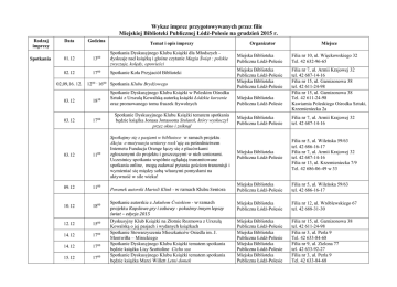 Wykaz imprez przygotowywanych przez filie Miejskiej Biblioteki Publicznej Łódź-Polesie na grudzień 2015 r. Rodzaj imprezy Data Godzina Spotkania 01.12 1300 Spotkania Dyskusyjnego Klubu Książki dla Młodszych dyskusje nad książką i głośne czytanie Magia Świąt : polskie zwyczaje, kolędy, opowieści 02.12 1700 Spotkanie Koła Przyjaciół Biblioteki 02,09,16. 12. Temat i opis imprezy 1200 – 1600 Spotkania Klubu Brydżowego Spotkanie Dyskusyjnego Klubu Książki w Poleskim Ośrodku Sztuki z Urszulą Kowalską autorką książki Łódzkie korzenie oraz promowanego tomu fraszek frywolnych 03.12 1830 03.12 1700 Spotkanie Dyskusyjnego Klubu Książki tematem spotkania będzie książka Jonasa Jonassona Stulatek, który wyskoczył przez okno i zniknął 03.12 Organizator Miejsce Miejska Biblioteka Publiczna Łódź-Polesie Filia nr 10, ul. Więckowskiego 32 Tel. 42 632-96-65 Miejska Biblioteka Publiczna Łódź-Polesie Miejska Biblioteka Publiczna Łódź-Polesie Filia nr 7, ul. Armii Krajowej 32 tel. 42 687-14-16 Filia nr 15, ul. Garnizonowa 38 tel. 42 611-24-98 Filia nr 15, ul. Garnizonowa 38 Tel. 42 611-24-98 Kawiarnia Poleskiego Ośrodka Sztuki, Krzemieniecka 2a Miejska Biblioteka Publiczna Łódź-Polesie Miejska Biblioteka Publiczna Łódź-Polesie Filia nr 7, ul. Armii Krajowej 32 tel. 42 687-14-16 1100 Spotkajmy się z pasjami w bibliotece w ramach projektu Akcja: e-motywacja seniorzy rock’ują za pośrednictwem Internetu Fundacja Orange łączy się z placówkami zgłoszonymi do projektu i goszczącymi w nich seniorami. Uczestnicy spotkania wspólnie oglądają transmitowane spotkania online, mogą zadawać pytania gościom transmisji i wymieniać się między sobą własnymi pomysłami na aktywność w sile wieku! Miejska Biblioteka Publiczna Łódź-Polesie Filia nr 5, ul. Wileńska 59/63 tel. 42 686-16-17 Filia nr 7, ul. Armii Krajowej 32 tel. 42 687-14-16 Filia nr 13, ul. Krzemieniecka 7/9 Tel. 42 686-06-49 w 33 09.12 1100 Poranek autorski Marioli Klink - w ramach Klubu Seniora Miejska Biblioteka Publiczna Łódź-Polesie Filia nr 5, ul. Wileńska 59/63 tel. 42 686-16-17 10.12 1800 Miejska Biblioteka Publiczna Łódź-Polesie Filia nr 12, ul. Wróblewskiego 67 tel. 42 688-31-30 12.12 1500 14.12 1700 14.12 1700 15.12 1700 Miejska Biblioteka Publiczna Łódź-Polesie Miejska Biblioteka Publiczna Łódź-Polesie Miejska Biblioteka Publiczna Łódź-Polesie Miejska Biblioteka Publiczna Łódź-Polesie Filia nr 15, ul. Garnizonowa 38 tel. 42 611-24-98 Filia nr 3, ul. Perla 9 Tel. 42 633-84-68 Filia nr 9, ul. Zielona 77 tel. 42 633-92-27 Filia nr 3, ul. Perla 9 Tel. 42 633-84-68 Spotkanie autorskie z Jakubem Ćwiekiem - w ramach projektu Kapslowe gry i zabawy - pokażmy innym lepszy świat – edycja 2015 Dyskusyjny Klub Książki na Złotnie Rozmowa z Urszulą Kowalską o jej pasjach i wydanych książkach Spotkanie Stowarzyszenia Mieszkańców Osiedla im. J. Montwiłła – Mireckiego Spotkanie Dyskusyjnego Klubu Książki tematem spotkania będzie książka Lisy Scottoline Cicho sza Spotkanie Dyskusyjnego Klubu Książki tematem spotkania będzie książka Marci Willett Letni domek Wystawy 15.12 1800 18.12 1700 23.12. 1700 grudzień W godzinach pracy biblioteki W godzinach pracy biblioteki W godzinach pracy biblioteki W godzinach pracy biblioteki W godzinach pracy biblioteki W godzinach pracy biblioteki W godzinach pracy biblioteki W godzinach pracy biblioteki W godzinach pracy biblioteki W godzinach pracy biblioteki W godzinach pracy biblioteki W godzinach pracy biblioteki W godzinach pracy biblioteki W godzinach pracy Katamaran Literacki: Spotkanie przedświąteczne łódzkiego środowiska literackiego. Miejska Biblioteka Publiczna Łódź-Polesie Naukowo-Fantastyczny Zespół powraca - spotkania miłośników fantastyki Spotkanie Dyskusyjnego Klubu Książki tematem spotkania będzie książka Mitcha Alboma Zaklinacz czasu Miłość ojczyzny przewyższa zwykle wszelką inną miłość wystawa Kronikarskim piórem – wystawa z ok. 600. rocznicy urodzin polskiego kronikarza i ustanowienia Roku 2015 Rokiem Jana Długosza Po gwieździstym, pięknym niebie, kiedy dzieci smacznie śpią, mknie Mikołaj wprost do ciebie i prezentów wiezie sto – wystawa z okazji Mikołajek Pana Reymonta droga do Nobla- wystawa z okazji 90. rocznicy śmierci pisarza, laureata literackiej Nagrody Nobla Z wizytą w rodzinie Fisiów – wystawa z okazji 60. rocznicy urodzin Joanny Olech, grafika, pisarki, ilustratorki, autorki książek dla dzieci Już słychać kolędy. Już pachnie świętami. Syn Boży się rodzi, by zamieszkać z nami- wystawa z okazji Świąt Bożego Narodzenia Zdobić, interpretować, dokumentować, czyli ilustracja książkowa i jej twórcy – wystawa dotycząca ilustracji książkowej, prezentacja książek, kopii ilustracji i innych materiałów. Wystawa książek pt.: Reymont - życie i twórczość - 90. rocznica śmierci Władysława Reymonta Wystawa książek pt. 90 rocznica śmierci noblisty Władysława Reymonta Boże Narodzenie – wystawka z cyklu polskie zwyczaje świąteczne Wystawa obrazów Anny Adamus i Adama Durczoka kontynuacja Miejska Biblioteka Publiczna Łódź-Polesie Miejska Biblioteka Publiczna Łódź-Polesie Miejska Biblioteka Publiczna Łódź-Polesie Filia nr 15, ul. Garnizonowa 38 Tel. 42 611-24-98 Akademicki Ośrodek Inicjatyw Artystycznych, Łódź, ul. Zachodnia 54/56 Filia nr 18, ul. Al. Politechniki 3a tel. 42 631- 21 -79 Filia nr 9, ul. Zielona 77 tel. 42 633-92-27 Dział Udostępniania, ul. Długosza 7/9, tel. 42 651-43-94 Miejska Biblioteka Publiczna Łódź-Polesie Filia nr 1, ul. Tomaszewicza 2, tel. 42 687-06-89 Miejska Biblioteka Publiczna Łódź-Polesie Filia nr 1, ul. Tomaszewicza 2, tel. 42 687-06-89 Miejska Biblioteka Publiczna Łódź-Polesie Filia nr 1, ul. Tomaszewicza 2, tel. 42 687-06-89 Miejska Biblioteka Publiczna Łódź-Polesie Filia nr 1, ul. Tomaszewicza 2, tel. 42 687-06-89 Miejska Biblioteka Publiczna Łódź-