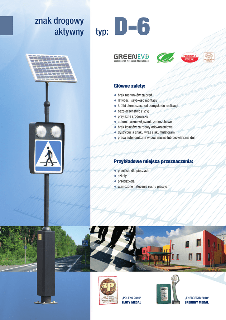 znak drogowy aktywny typ: D-6 Główne zalety: • brak rachunków za prąd • łatwość i szybkość montażu • krótki okres czasu od pomysłu do realizacji • bezpieczeństwo (12 V) • przyjazne środowisku • automatyczne włączanie zmierzchowe • brak kosztów za roboty odtworzeniowe • dystrybucja znaku wraz z akumulatorami • praca autonomiczna w pochmurne lub bezwietrzne dni Przykładowe miejsca przeznaczenia: • przejścia dla pieszych • szkoły • przedszkola • wzmożone natężenie ruchu pieszych „POLEKO 2010“ „ENERGETAB 2010“ ZŁOTY MEDAL SREBRNY MEDAL 840 mm D-6 840 mm sygnalizator Ø 200 mm znak D-6 600 x 600 mm 1200 mm 2500 mm 4400 mm typ: 550 mm znak drogowy aktywny 1000 mm komora akumulatorowa fundament Parametry techniczne: 300 mm wysokość masztu 4,4 m sygnalizatory migające naprzemiennie LED bursztynowe (pomarańczowe) 2 x 200 mm znak D-6 – kaseton podświetlany biały LED 600 x 600 mm kaseton włączany czujnikiem zmierzchowym tak trwałość źródeł światła 10 000 h napięcie zasilania 12 V pojemność akumulatorów 75 ÷ 100 Ah włączanie sygnalizatorów czujnikiem ruchu tak warunki pracy temperatura –20ºC ÷ 45ºC wilgotność 10% ÷ 95% moc modułu fotowoltanicznego 90 W mikroprocesorowy regulator pracy lampy tak stopień ochrony IP 67 czas ładowania akumulatorów lato zima 6h 12 h okres autonomii systemu przy naładowanych akumulatorach 4-5 dni kolor podstawowy czarny możliwość innego koloru (zgodnie z RAL) tak fundament prefabrykowany F100 Macek & Wichary 41-807 Zabrze-Mikulczyce, ul. Handlowa 2b tel. +48 32 273 82 70, fax +48 32 273 82 65 e-mail: [email protected] www.macekwichary.pl www.solarnelampy.com