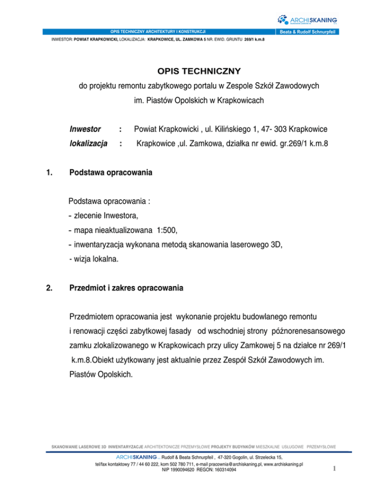 OPIS TECHNICZNY ARCHITEKTURY I KONSTRUKCJI INWESTOR: POWIAT KRAPKOWICKI, LOKALIZACJA: KRAPKOWICE, UL. ZAMKOWA 5 NR. EWID. GRUNTU 269/1 k.m.8 OPIS TECHNICZNY do projektu remontu zabytkowego portalu w Zespole Szkół Zawodowych im. Piastów Opolskich w Krapkowicach 1. Inwestor : Powiat Krapkowicki , ul. Kilińskiego 1, 47- 303 Krapkowice lokalizacja : Krapkowice ,ul. Zamkowa, działka nr ewid. gr.269/1 k.m.8 Podstawa opracowania Podstawa opracowania : - zlecenie Inwestora, - mapa nieaktualizowana 1:500, - inwentaryzacja wykonana metodą skanowania laserowego 3D, - wizja lokalna. 2. Przedmiot i zakres opracowania Przedmiotem opracowania jest wykonanie projektu budowlanego remontu i renowacji części zabytkowej fasady od wschodniej strony późnorenesansowego zamku zlokalizowanego w Krapkowicach przy ulicy Zamkowej 5 na działce nr 269/1 k.m.8.Obiekt użytkowany jest aktualnie przez Zespół Szkół Zawodowych im. Piastów Opolskich. SKANOWANIE LASEROWE 3D INWENTARYZACJE ARCHITEKTONICZE PRZEMYSŁOWE PROJEKTY BUDYNKÓW MIESZKALNE USŁUGOWE PRZEMYSŁOWE Rudolf & Beata Schnurpfeil , 47-320 Gogolin, ul. Strzelecka 15, tel/fax kontaktowy 77 / 44 60 222, kom 502 780 711, e-mail [email protected], www.archiskaning.pl NIP 1990094620 REGON: 160314094 1 OPIS TECHNICZNY ARCHITEKTURY I KONSTRUKCJI INWESTOR: POWIAT KRAPKOWICKI, LOKALIZACJA: KRAPKOWICE, UL. ZAMKOWA 5 NR. EWID. GRUNTU 269/1 k.m.8 Elewacja wschodnia z widokiem na portal W ramach zakresu remontu fasady wchodzi: - remont i renowacja zabytkowego portalu, - renowacja marmurowych schodów zewnętrznych, - odtworzenie drewnianych drzwi zewnętrznych, - remont naczółka okna nad portalem wraz z jego uszatym obramowaniem, - renowacja ozdobnej lampy wiszącej. Remontowana część fasady SKANOWANIE LASEROWE 3D INWENTARYZACJE ARCHITEKTONICZE PRZEMYSŁOWE PROJEKTY BUDYNKÓW MIESZKALNE USŁUGOWE PRZEMYSŁOWE Rudolf & Beata Schnurpfeil , 47-320 Gogolin, ul. Strzelecka 15, tel/fax kontaktowy 77 / 44 60 222, kom 502 780 711, e-mail [email protected], www.archiskaning.pl NIP 1990094620 REGON: 160314094 2 OPIS TECHNICZNY ARCHITEKTURY I KONSTRUKCJI INWESTOR: POWIAT KRAPKOWICKI, LOKALIZACJA: KRAPKOWICE, UL. ZAMKOWA 5 NR. EWID. GRUNTU 269/1 k.m.8 3. Charakterystyka obiektu wraz z elementami przeznaczonymi do remontu Budynek z walorami architektury późnorenesansowej o założeniu czteroskrzydłowym wokół dziedzińca. Każde ze skrzydeł posiada dwie kondygnacje i poddasze nieużytkowe. W skrzydle przy ulicy Zamkowej znajduje się brama utworzona w kształcie tunelu prowadząca do dziedzińca zamkowego. Pozostałe skrzydła posiadają krużganki dostępne od strony dziedzińca. Widok na zamek Barokowy portal kolumnowy stanowi oprawę łukowego wejścia do zamku od wschodu. Portal obramowany pilastrami i kolumnami zwieńczony płaskim gzymsem. Ościeże otworu drzwiowego wraz z pilastrami portalu wykończone głębokim boniowaniem wykonanym w tynku. SKANOWANIE LASEROWE 3D INWENTARYZACJE ARCHITEKTONICZE PRZEMYSŁOWE PROJEKTY BUDYNKÓW MIESZKALNE USŁUGOWE PRZEMYSŁOWE Rudolf & Beata Schnurpfeil , 47-320 Gogolin, ul. Strzelecka 15, tel/fax kontaktowy 77 / 44 60 222, kom 502 780 711, e-mail [email protected], www.archiskaning.pl NIP 1990094620 REGON: 160314094 3 OPIS TECHNICZNY ARCHITEKTURY I KONSTRUKCJI INWESTOR: POWIAT KRAPKOWICKI, LOKALIZACJA: KRAPKOWICE, UL. ZAMKOWA 5 NR. EWID. GRUNTU 269/1 k.m.8 Ozdobny naczółek wolutowy okna nad portalem stanowi zwieńczenie obramienia uszatego. Drzwi zewnętrzne drewniane, dwuskrzydłowe z płycinami oraz naświetlem łukowym. 4. Stan techniczny elementów W wyniku przeprowadzonych oględzin stwierdzono : • odspojenia-ubytki tynków oraz miejsca występowania zmurszałychuszkodzonych tynków , ubytki i uszkodzenia części detali architektonicznych • łuszczenie się powłok malarskich , • granitowe schody zewnętrzne-widoczne powierzchniowe ubytki, pęknięcia i zabrudzenia • zły stan techniczny drzwi zewnętrznych wraz z naświetlem . 5. Ogólna technologia przeprowadzenia prac renowacyjnych na portalu W projekcie przyjęto przykładowe rozwiązania technologiczne firmy Sto. Systemy Sto wyznaczają tylko przyjęty standard materiałów i rozwiązań technologicznych. Dopuszcza się stosowanie rozwiązań innych równoważnych pod względem zastosowanych materiałów o podobnej wysokiej jakości, pod warunkiem zachowania pełnego systemu posiadającego pozytywne opinie konserwatorskie oraz potwierdzoną historię stosowania na obiektach zabytkowych. Przyjęty system i materiały nie mogą parametrami technicznymi i użytkowymi odbiegać od przyjętych w projekcie. SKANOWANIE LASEROWE 3D INWENTARYZACJE ARCHITEKTONICZE PRZEMYSŁOWE PROJEKTY BUDYNKÓW MIESZKALNE USŁUGOWE PRZEMYSŁOWE Rudolf & Beata Schnurpfeil , 47-320 Gogolin, ul. Strzelecka 15, tel/fax kontaktowy 77 / 44 60 222, kom 502 780 711, e-mail [email protected], www.archiskaning.pl NIP 1990094620 REGON: 160314094 4 OPIS TECHNICZNY ARCHITEKTURY I KONSTRUKCJI INWESTOR: POWIAT KRAPKOWICKI, LOKALIZACJA: KRAPKOWICE, UL. ZAMKOWA 5 NR. EWID. GRUNTU 269/1 k.m.8 Ogólna charakterystyka materiałowa Do renowacji obiektów zaproponowano specjalistyczne materiały najwyższej klasy z uwzględnieniem charakteru i obecnego stanu technicznego obiektu. Technologia ta jest aprobowana przez środowiska konserwatorskie i posiada liczne pozytywne opinie niezależnych instytucji. Do prac konserwatorskich nie zaleca się stosowania zbyt silnych tradycyjnych zapraw cementowo-wapiennych, ale tylko zaprawy na bazie wapna trassowego, gotowe mieszanki lub przygotowywane na placu budowy pod nadzorem konserwatorskim lub dostawcy technologii. Detale architektoniczne należy odtworzyć metodą tradycyjną ciągnioną z zapraw sztukatorskich. Nie należy stosować elementów z gipsu, styropianu itp. Elementy detalu wykonane z kamienia należy poddać kompleksowej renowacji ściśle wg wytycznych zawartych w poniższym opisie. Jako powłoki malarskie zaleca się farby krzemoorganic