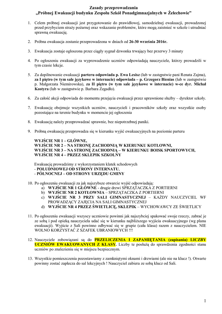Zasady ewakuacji szkoly - zespół szkół ponadgimnazjalnych w