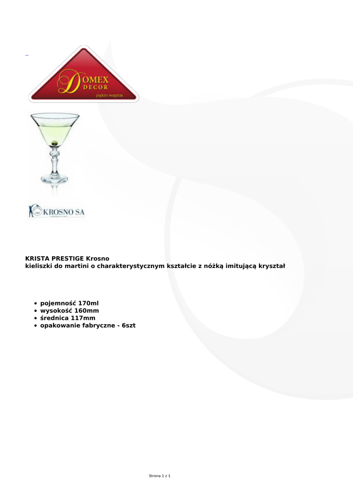 KRISTA PRESTIGE Krosno kieliszki do martini o charakterystycznym kształcie z nóżką imitującą kryształ pojemność 170ml wysokość 160mm średnica 117mm opakowanie fabryczne - 6szt Strona 1 z 1