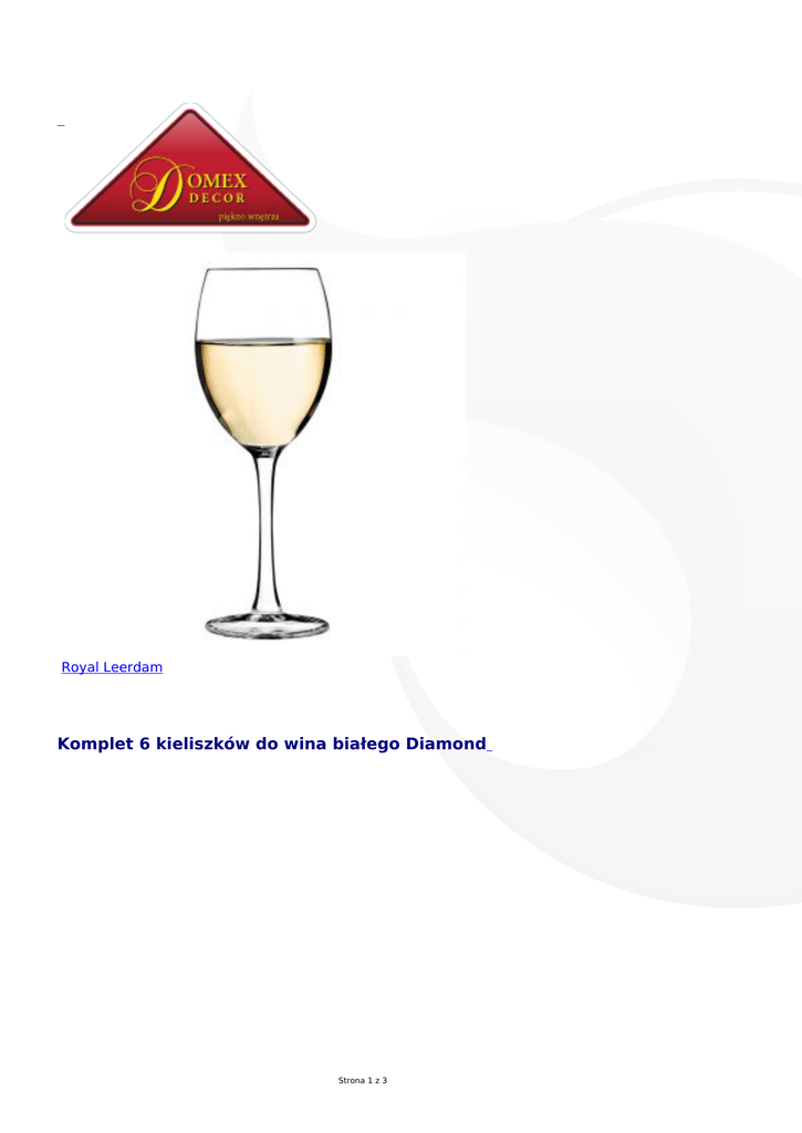 Royal Leerdam Komplet 6 kieliszków do wina białego Diamond Strona 1 z 3 Strona 2 z 3 Dodatkowe informacje: Pojemność kieliszka - 250 ml Wysokość - 19cm Średnica górnej krawędzi - 5,8cm Opakowanie fabryczne - 6szt Diament jest synonimem blasku i luksusu. O jakości kieliszka decyduje forma, wielkość, średnica krawędzi i sposób wykończenia. Wszystkie te cechy wzięto pod uwagę tworząc kolekcję kieliszków Diamond – idealne zestawienie kształtów i pojemności zaspakajające potrzeby koneserów różnych trunków. Białe wina podaje się schłodzone, dlatego kieliszek jest mniejszy, by jak najdłużej utrzymać właściwą temperaturę. Kieliszek idealnie nadaje się do win o bogatym kwiecisto-owocowym aromacie. Strona 3 z 3