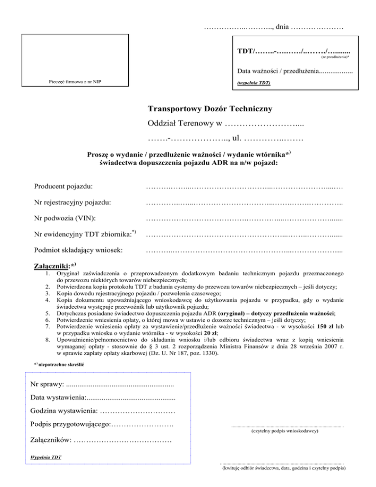……………..……….., dnia ………………… TDT/……..-….……/..……./…........ (nr przedłuŜenia)* Data waŜności / przedłuŜenia.................. Pieczęć firmowa z nr NIP (wypełnia TDT) Transportowy Dozór Techniczny Oddział Terenowy w …………………….... …….-……………….., ul. …………..……. Proszę o wydanie / przedłuŜenie waŜności / wydanie wtórnika*) świadectwa dopuszczenia pojazdu ADR na n/w pojazd: Producent pojazdu: ……….……...…………………………...…………………....…. Nr rejestracyjny pojazdu: …………..…...…………………………...…….…….………….. Nr podwozia (VIN): ………………………………….…………....………………....... Nr ewidencyjny TDT zbiornika:*) ………………………………………………...……..………....... Podmiot składający wniosek: ………..………………………………………...………………... Załączniki:*) 1. 2. 3. 4. 5. 6. 7. 8. Oryginał zaświadczenia o przeprowadzonym dodatkowym badaniu technicznym pojazdu przeznaczonego do przewozu niektórych towarów niebezpiecznych; Potwierdzona kopia protokołu TDT z badania cysterny do przewozu towarów niebezpiecznych – jeśli dotyczy; Kopia dowodu rejestracyjnego pojazdu / pozwolenia czasowego; Kopia dokumentu upowaŜniającego wnioskodawcę do uŜytkowania pojazdu w przypadku, gdy o wydanie świadectwa występuje przewoźnik lub uŜytkownik pojazdu; Dotychczas posiadane świadectwo dopuszczenia pojazdu ADR (oryginał) – dotyczy przedłuŜenia waŜności; Potwierdzenie wniesienia opłaty, o której mowa w ustawie o dozorze technicznym – jeśli dotyczy; Potwierdzenie wniesienia opłaty za wystawienie/przedłuŜenie waŜności świadectwa - w wysokości 150 zł lub w przypadku wniosku o wydanie wtórnika - w wysokości 20 zł; UpowaŜnienie/pełnomocnictwo do składania wniosku i/lub odbioru świadectwa wraz z kopią wniesienia wymaganej opłaty - stosownie do § 3 ust. 2 rozporządzenia Ministra Finansów z dnia 28 września 2007 r. w sprawie zapłaty opłaty skarbowej (Dz. U. Nr 187, poz. 1330). *) niepotrzebne skreślić *) niepotrzebne skreślić Nr sprawy: ......................................................... Data wystawienia:............................................... Godzina wystawienia: ………………………… Podpis przygotowującego:……………………. ......................................................................................... (czytelny podpis wnioskodawcy) Załączników: ………………………………… Wypełnia TDT .................................................................................................. (kwituję odbiór świadectwa, data, godzina i czytelny podpis)