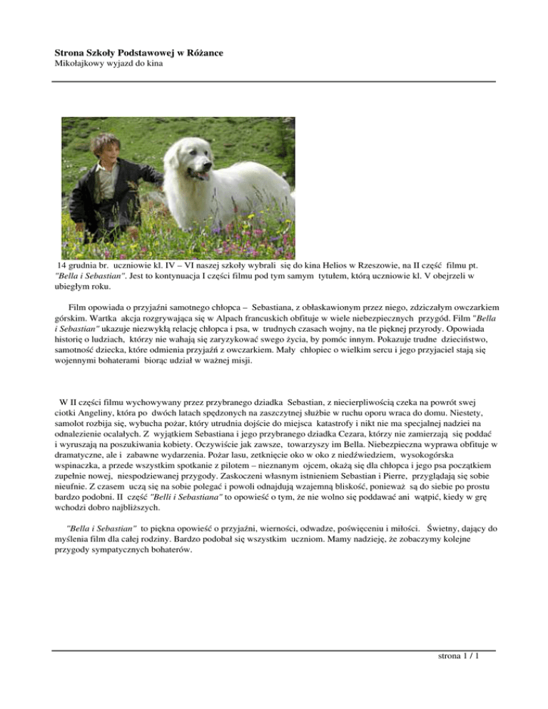 Strona Szkoły Podstawowej w Różance Mikołajkowy wyjazd do kina 14 grudnia br. uczniowie kl. IV – VI naszej szkoły wybrali się do kina Helios w Rzeszowie, na II część filmu pt. "Bella i Sebastian". Jest to kontynuacja I części filmu pod tym samym tytułem, którą uczniowie kl. V obejrzeli w ubiegłym roku. Film opowiada o przyjaźni samotnego chłopca – Sebastiana, z obłaskawionym przez niego, zdziczałym owczarkiem górskim. Wartka akcja rozgrywająca się w Alpach francuskich obfituje w wiele niebezpiecznych przygód. Film "Bella i Sebastian" ukazuje niezwykłą relację chłopca i psa, w trudnych czasach wojny, na tle pięknej przyrody. Opowiada historię o ludziach, którzy nie wahają się zaryzykować swego życia, by pomóc innym. Pokazuje trudne dzieciństwo, samotność dziecka, które odmienia przyjaźń z owczarkiem. Mały chłopiec o wielkim sercu i jego przyjaciel stają się wojennymi bohaterami biorąc udział w ważnej misji. W II części filmu wychowywany przez przybranego dziadka Sebastian, z niecierpliwością czeka na powrót swej ciotki Angeliny, która po dwóch latach spędzonych na zaszczytnej służbie w ruchu oporu wraca do domu. Niestety, samolot rozbija się, wybucha pożar, który utrudnia dojście do miejsca katastrofy i nikt nie ma specjalnej nadziei na odnalezienie ocalałych. Z wyjątkiem Sebastiana i jego przybranego dziadka Cezara, którzy nie zamierzają się poddać i wyruszają na poszukiwania kobiety. Oczywiście jak zawsze, towarzyszy im Bella. Niebezpieczna wyprawa obfituje w dramatyczne, ale i zabawne wydarzenia. Pożar lasu, zetknięcie oko w oko z niedźwiedziem, wysokogórska wspinaczka, a przede wszystkim spotkanie z pilotem – nieznanym ojcem, okażą się dla chłopca i jego psa początkiem zupełnie nowej, niespodziewanej przygody. Zaskoczeni własnym istnieniem Sebastian i Pierre, przyglądają się sobie nieufnie. Z czasem uczą się na sobie polegać i powoli odnajdują wzajemną bliskość, ponieważ są do siebie po prostu bardzo podobni. II część "Belli i Sebastiana" to opowieść o tym, że nie wolno się poddawać ani wątpić, kiedy w grę wchodzi dobro najbliższych. "Bella i Sebastian" to piękna opowieść o przyjaźni, wierności, odwadze, poświęceniu i miłości. Świetny, dający do myślenia film dla całej rodziny. Bardzo podobał się wszystkim uczniom. Mamy nadzieję, że zobaczymy kolejne przygody sympatycznych bohaterów. strona 1 / 1