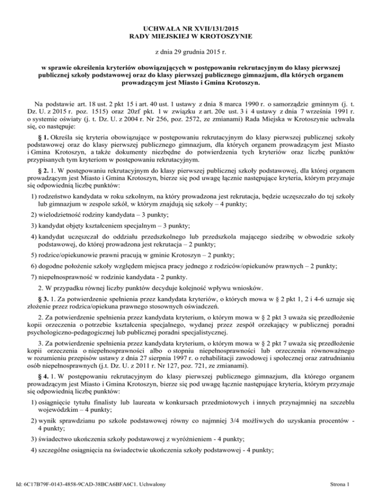 UCHWAŁA NR XVII/131/2015 RADY MIEJSKIEJ W KROTOSZYNIE z dnia 29 grudnia 2015 r. w sprawie określenia kryteriów obowiązujących w postępowaniu rekrutacyjnym do klasy pierwszej publicznej szkoły podstawowej oraz do klasy pierwszej publicznego gimnazjum, dla których organem prowadzącym jest Miasto i Gmina Krotoszyn. Na podstawie art. 18 ust. 2 pkt 15 i art. 40 ust. 1 ustawy z dnia 8 marca 1990 r. o samorządzie gminnym (j. t. Dz. U. z 2015 r. poz. 1515) oraz 20zf pkt. 1 w związku z art. 20e ust. 3 i 4 ustawy z dnia 7 września 1991 r. o systemie oświaty (j. t. Dz. U. z 2004 r. Nr 256, poz. 2572, ze zmianami) Rada Miejska w Krotoszynie uchwala się, co następuje: § 1. Określa się kryteria obowiązujące w postępowaniu rekrutacyjnym do klasy pierwszej publicznej szkoły podstawowej oraz do klasy pierwszej publicznego gimnazjum, dla których organem prowadzącym jest Miasto i Gmina Krotoszyn, a także dokumenty niezbędne do potwierdzenia tych kryteriów oraz liczbę punktów przypisanych tym kryteriom w postępowaniu rekrutacyjnym. § 2. 1. W postępowaniu rekrutacyjnym do klasy pierwszej publicznej szkoły podstawowej, dla której organem prowadzącym jest Miasto i Gmina Krotoszyn, bierze się pod uwagę łącznie następujące kryteria, którym przyznaje się odpowiednią liczbę punktów: 1) rodzeństwo kandydata w roku szkolnym, na który prowadzona jest rekrutacja, będzie uczęszczało do tej szkoły lub gimnazjum w zespole szkół, w którym znajdują się szkoły – 4 punkty; 2) wielodzietność rodziny kandydata – 3 punkty; 3) kandydat objęty kształceniem specjalnym – 3 punkty; 4) kandydat uczęszczał do oddziału przedszkolnego lub przedszkola mającego siedzibę w obwodzie szkoły podstawowej, do której prowadzona jest rekrutacja – 2 punkty; 5) rodzice/opiekunowie prawni pracują w gminie Krotoszyn – 2 punkty; 6) dogodne położenie szkoły względem miejsca pracy jednego z rodziców/opiekunów prawnych – 2 punkty; 7) niepełnosprawność w rodzinie kandydata - 2 punkty. 2. W przypadku równej liczby punktów decyduje kolejność wpływu wniosków. § 3. 1. Za potwierdzenie spełnienia przez kandydata kryteriów, o których mowa w § 2 pkt 1, 2 i 4-6 uznaje się złożenie przez rodzica/opiekuna prawnego stosownych oświadczeń. 2. Za potwierdzenie spełnienia przez kandydata kryterium, o którym mowa w § 2 pkt 3 uważa się przedłożenie kopii orzeczenia o potrzebie kształcenia specjalnego, wydanej przez zespół orzekający w publicznej poradni psychologiczno-pedagogicznej lub publicznej poradni specjalistycznej. 3. Za potwierdzenie spełnienia przez kandydata kryterium, o którym mowa w § 2 pkt 7 uważa się przedłożenie kopii orzeczenia o niepełnosprawności albo o stopniu niepełnosprawności lub orzeczenia równoważnego w rozumieniu przepisów ustawy z dnia 27 sierpnia 1997 r. o rehabilitacji zawodowej i społecznej oraz zatrudnianiu osób niepełnosprawnych (j.t. Dz. U. z 2011 r. Nr 127, poz. 721, ze zmianami). § 4. 1. W postępowaniu rekrutacyjnym do klasy pierwszej publicznego gimnazjum, dla którego organem prowadzącym jest Miasto i Gmina Krotoszyn, bierze się pod uwagę łącznie następujące kryteria, którym przyznaje się odpowiednią liczbę punktów: 1) osiągnięcie tytułu finalisty lub laureata w konkursach przedmiotowych i innych przynajmniej na szczeblu wojewódzkim – 4 punkty; 2) wynik sprawdzianu po szkole podstawowej równy co najmniej 3/4 możliwych do uzyskania procentów 4 punkty; 3) świadectwo ukończenia szkoły podstawowej z wyróżnieniem - 4 punkty; 4) szczególne osiągnięcia na świadectwie ukończenia szkoły podstawowej - 4 punkty; Id: 6C17B79F-0143-4858-9CAD-38BCA6BFA6C1. Uchwalony Strona 1 5) rodzeństwo kandydata w roku szkolnym, na który prowadzona jest rekrutacja, będzie uczęszczało do tej szkoły lub gimnazjum w zespole szkół, w którym znajdują się szkoły – 4 punkty; 6) wielodzietność rodziny kandydata – 3 punkty; 7) kandydat objęty kształceniem specjalnym – 3 punkty; 8) kandydat uczęszczał do szkoły podstawowej w zespole szkół, w którym działa gimnazjum, lub mającej siedzibę na terenie gminy Krotoszyn – 2 punkty; 9) rodzice/opiekunowie prawni pracują w gminie Krotoszyn – 2 punkty; 10) dogodne położenie szkoły względem miejsca pracy jednego z rodziców/opiekunów prawnych – 2 punkty; 11) niepełnosprawność w rodzinie kandydata - 2 punkty. 2. W przypadku równej liczby punktów decyduje kolejność wpływu wniosków. § 5. 1. Potwierdzenia spełnienia kryteriów, o których mowa w § 4 pkt 1 - 4 dokonuje rodzic/opiekun prawny, przedkładając kopie stosownych dokumentów. 2. Za potwierdzenie spełnienia przez kandydata kryteriów, o których mowa w § 4 pkt 5, 6, 8 – 10 uznaje się złożenie przez rodzica/opiekuna prawnego stosownych oświadczeń. 3. Za potwierdzenie spełnienia przez kandydata kryterium, o którym mowa w § 4 pkt 7 uważa się przedłożenie kopii orzeczenia o potrzebie kształcenia specjalnego wydanej przez zespół orzekający w publicznej poradni psychologiczno-pedagogicznej lub publicznej poradni specjalistycznej. 4. Za potwierdzenie spełnienia przez kandydata kryterium, o którym mowa w § 4 pkt 11 uważa się przedłożenie kopii orzeczenia o niepełnosprawności albo o stopniu niepełnosprawności lub orzeczenia równoważnego w rozumieniu przepisów ustawy o rehabilitacji zawodowej i społecznej oraz zatrudnianiu osób niepełnosprawnych. § 6. Rekrutacja do klasy pierwszej oddziału integracyjnego w publicznej szkole podstawowej ogólnodostępnej lub publicznym gimnazjum ogólnodostępnym, prowadzonych przez Miasto i Gminę Krotoszyn, odbywa się zgodnie z zasadami określonymi w ustawie o systemie oświaty oraz niniejszej uchwale. § 7. Rekrutacja do klasy pierwszej oddziału sportowego w publicznej szkole podstawowej ogólnodostępnej lub wyższej niż pierwsza oraz do klasy pierwszej oddziału sportowego w publicznym gimn