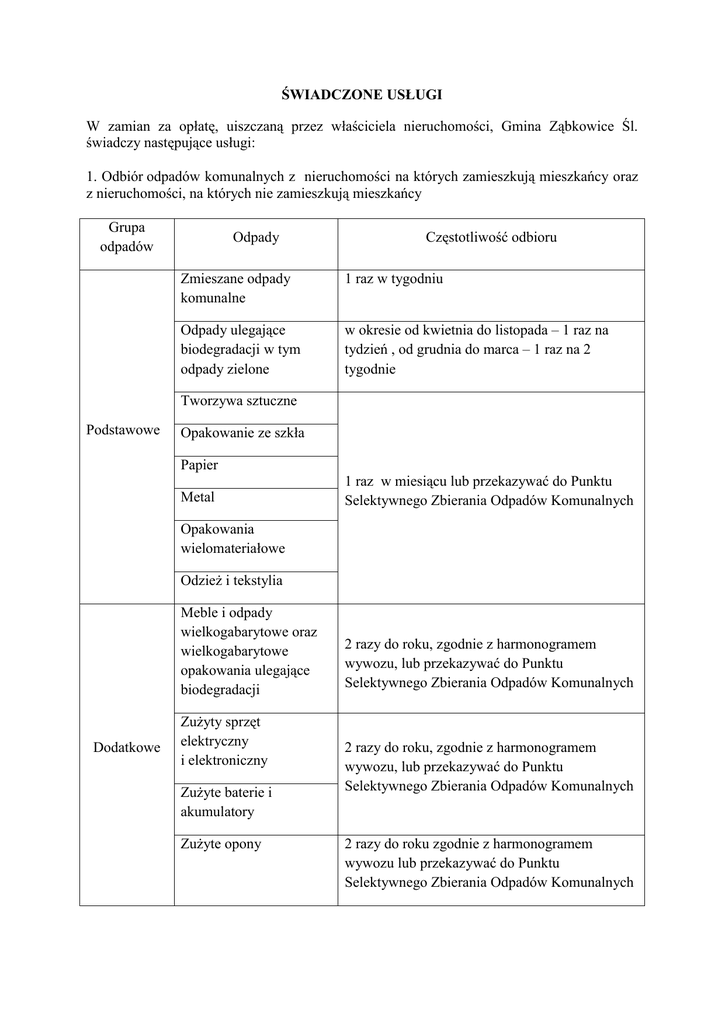 ŚWIADCZONE USŁUGI W zamian za opłatę, uiszczaną przez właściciela nieruchomości, Gmina Ząbkowice Śl. świadczy następujące usługi: 1. Odbiór odpadów komunalnych z nieruchomości na których zamieszkują mieszkańcy oraz z nieruchomości, na których nie zamieszkują mieszkańcy Grupa odpadów Odpady Częstotliwość odbioru Zmieszane odpady komunalne 1 raz w tygodniu Odpady ulegające biodegradacji w tym odpady zielone w okresie od kwietnia do listopada – 1 raz na tydzień , od grudnia do marca – 1 raz na 2 tygodnie Tworzywa sztuczne Podstawowe Opakowanie ze szkła Papier Metal 1 raz w miesiącu lub przekazywać do Punktu Selektywnego Zbierania Odpadów Komunalnych Opakowania wielomateriałowe Odzież i tekstylia Meble i odpady wielkogabarytowe oraz wielkogabarytowe opakowania ulegające biodegradacji Dodatkowe Zużyty sprzęt elektryczny i elektroniczny Zużyte baterie i akumulatory Zużyte opony 2 razy do roku, zgodnie z harmonogramem wywozu, lub przekazywać do Punktu Selektywnego Zbierania Odpadów Komunalnych 2 razy do roku, zgodnie z harmonogramem wywozu, lub przekazywać do Punktu Selektywnego Zbierania Odpadów Komunalnych 2 razy do roku zgodnie z harmonogramem wywozu lub przekazywać do Punktu Selektywnego Zbierania Odpadów Komunalnych 2. Punkty Selektywnego Zbierania Odpadów Komunalnych Punkt I znajduje się przy ul. Dalekiej 2 w Ząbkowicach Śląskich na terenie Zakładu Gospodarki Komunalnej Sp. z o.o. Do PSZOK-u właściciele nieruchomości mogą bezpłatnie przekazywać następujące odpady komunalne: - zużyty sprzęt elektryczny i elektroniczny oraz zużyte baterie i akumulatory; - meble i inne odpady wielkogabarytowe; - przeterminowane leki i chemikalia z gospodarstw domowych; Punkt II znajduje się przy ul. Legnickiej 26 w Ząbkowicach Śląskich - teren w głębi podwórza bazy PKS. Do PSZOK-u właściciele nieruchomości mogą bezpłatnie przekazywać następujące odpady komunalne: - zużyte opony; - odpady biodegradowalne w tym odpady zielone oraz odpady kuchenne; - drewno i opakowanie z drewna; - papier i tekturę, duże opakowania z papieru; - metal, tworzywa sztuczne, opakowania wielomateriałowe oraz odzież i tekstylia; - opakowania ze szkła. Koszty transportu odpadów do PSZOKU ponosi mieszkaniec. PSZOK jest czynny od poniedziałku do piątku w godzinach od 10.00 do 18.00 oraz w każdą sobotę w godzinach od 10.00 do 14.00 oprócz dni świątecznych. UWAGA! meble i inne odpady wielkogabarytowe, zużyte opony, przeterminowane leki oraz chemikalia, zużyty sprzęt elektryczny i elektroniczny, zużyte baterie i akumulatory – będziemy wystawiać 2 razy w roku w wyznaczonych terminach w systemie tzw. „wystawki chodnikowej”. Nie należy wyżej wymienionych odpadów wrzucać do pojemników na odpady zmieszane oraz wystawiać poza wyznaczonymi terminami wywozu.