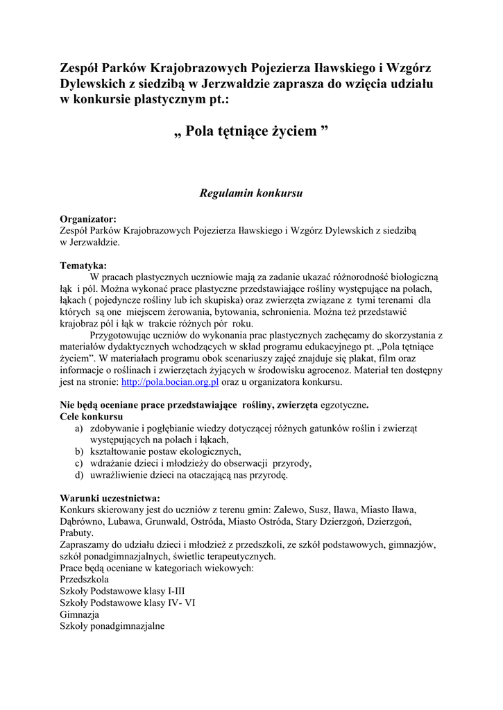 Zespół Parków Krajobrazowych Pojezierza Iławskiego i Wzgórz Dylewskich z siedzibą w Jerzwałdzie zaprasza do wzięcia udziału w konkursie plastycznym pt.: „ Pola tętniące życiem ” Regulamin konkursu Organizator: Zespół Parków Krajobrazowych Pojezierza Iławskiego i Wzgórz Dylewskich z siedzibą w Jerzwałdzie. Tematyka: W pracach plastycznych uczniowie mają za zadanie ukazać różnorodność biologiczną łąk i pól. Można wykonać prace plastyczne przedstawiające rośliny występujące na polach, łąkach ( pojedyncze rośliny lub ich skupiska) oraz zwierzęta związane z tymi terenami dla których są one miejscem żerowania, bytowania, schronienia. Można też przedstawić krajobraz pól i łąk w trakcie różnych pór roku. Przygotowując uczniów do wykonania prac plastycznych zachęcamy do skorzystania z materiałów dydaktycznych wchodzących w skład programu edukacyjnego pt. „Pola tętniące życiem”. W materiałach programu obok scenariuszy zajęć znajduje się plakat, film oraz informacje o roślinach i zwierzętach żyjących w środowisku agrocenoz. Materiał ten dostępny jest na stronie: http://pola.bocian.org.pl oraz u organizatora konkursu. Nie będą oceniane prace przedstawiające rośliny, zwierzęta egzotyczne. Cele konkursu a) zdobywanie i pogłębianie wiedzy dotyczącej różnych gatunków roślin i zwierząt występujących na polach i łąkach, b) kształtowanie postaw ekologicznych, c) wdrażanie dzieci i młodzieży do obserwacji przyrody, d) uwrażliwienie dzieci na otaczającą nas przyrodę. Warunki uczestnictwa: Konkurs skierowany jest do uczniów z terenu gmin: Zalewo, Susz, Iława, Miasto Iława, Dąbrówno, Lubawa, Grunwald, Ostróda, Miasto Ostróda, Stary Dzierzgoń, Dzierzgoń, Prabuty. Zapraszamy do udziału dzieci i młodzież z przedszkoli, ze szkół podstawowych, gimnazjów, szkół ponadgimnazjalnych, świetlic terapeutycznych. Prace będą oceniane w kategoriach wiekowych: Przedszkola Szkoły Podstawowe klasy I-III Szkoły Podstawowe klasy IV- VI Gimnazja Szkoły ponadgimnazjalne Wymagania dotyczące prac plastycznych: a) format A3 lub A4, b) prace mogą być wykonane dowolną techniką – prosimy o niewykonywanie prac odznaczających się wypukłą fakturą, oraz prac z materiałów nietrwałych mogących ulec uszkodzeniu (plastelina, nasiona, trawy, patyki, kasze ), c) na odwrocie pracy należy umieścić imię i nazwisko, wiek, klasę, adres szkoły autora pracy, numer telefonu, imię i nazwisko opiekuna, d) jedna osoba może nadesłać tylko jedną pracę, e) prace zbiorowe nie będą oceniane, f) prace nie podpisane nie będą oceniane. Ocena prac będzie przebiegać pod kątem: a) wartości merytorycznych zgłoszonej pracy, b) oryginalności w przedstawieniu tematu, c) zastosowania ciekawych technik plastycznych, d) estetyki i jakości wykonanych prac. Termin nadesłania prac: 15 kwietnia 2016r. Rozstrzygnięcie konkursu: 16 maja 2016 r. Nagrody: Jury konkursu będzie przyznawało nagrody dla każdej kategorii wiekowej. Uwagi końcowe: a) nadesłane prace niezgodne z regulaminem, nieprawidłowo opisane nie będą oceniane, b) wyniki konkursu będą zamieszczone na stronie internetowej Zespołu Parków Krajobrazowych w Jerzwałdzie www.pkwim.pl , c) nadesłane prace nie będą zwracane, d) organizator zastrzega sobie prawo do publicznej prezentacji nadesłanych prac na wystawie pokonkursowej, oraz do publikacji tychże prac. Prace należy nadesłać na adres; Zespół Parków Krajobrazowych Pojezierza Iławskiego i Wzgórz Dylewskich, 14-230 Jerzwałd 62, tel/fax. 89 758 85 27 do 15 kwietnia 2016 r. Osoba koordynująca zadanie – Danuta Sokołowska Dyrektor Zespołu Parków Krajobrazowych Pojezierza Iławskiego i Wzgórz Dylewskich w Jerzwałdzie Krzysztof Słowiński