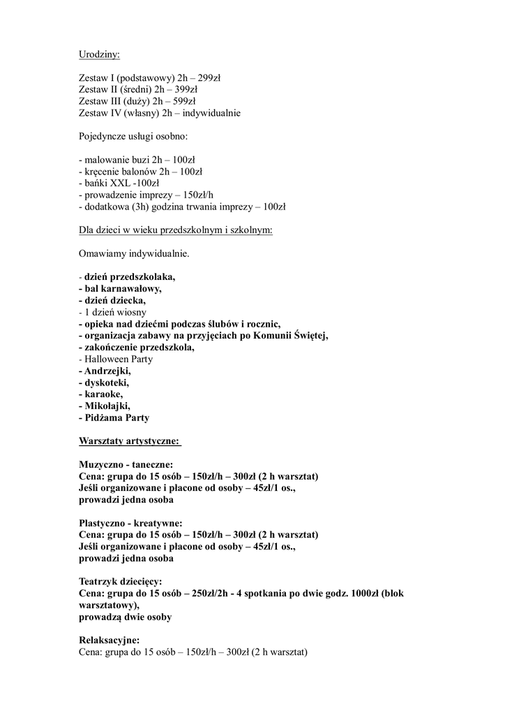 Urodziny: Zestaw I (podstawowy) 2h – 299zł Zestaw II (średni) 2h – 399zł Zestaw III (duży) 2h – 599zł Zestaw IV (własny) 2h – indywidualnie Pojedyncze usługi osobno: - malowanie buzi 2h – 100zł - kręcenie balonów 2h – 100zł - bańki XXL -100zł - prowadzenie imprezy – 150zł/h - dodatkowa (3h) godzina trwania imprezy – 100zł Dla dzieci w wieku przedszkolnym i szkolnym: Omawiamy indywidualnie. - dzień przedszkolaka, - bal karnawałowy, - dzień dziecka, - 1 dzień wiosny - opieka nad dziećmi podczas ślubów i rocznic, - organizacja zabawy na przyjęciach po Komunii Świętej, - zakończenie przedszkola, - Halloween Party - Andrzejki, - dyskoteki, - karaoke, - Mikołajki, - Pidżama Party Warsztaty artystyczne: Muzyczno - taneczne: Cena: grupa do 15 osób – 150zł/h – 300zł (2 h warsztat) Jeśli organizowane i płacone od osoby – 45zł/1 os., prowadzi jedna osoba Plastyczno - kreatywne: Cena: grupa do 15 osób – 150zł/h – 300zł (2 h warsztat) Jeśli organizowane i płacone od osoby – 45zł/1 os., prowadzi jedna osoba Teatrzyk dziecięcy: Cena: grupa do 15 osób – 250zł/2h - 4 spotkania po dwie godz. 1000zł (blok warsztatowy), prowadzą dwie osoby Relaksacyjne: Cena: grupa do 15 osób – 150zł/h – 300zł (2 h warsztat) Jeśli zorganizowane i płacone od osoby – 25zł/1 os., Prowadzą dwie osoby