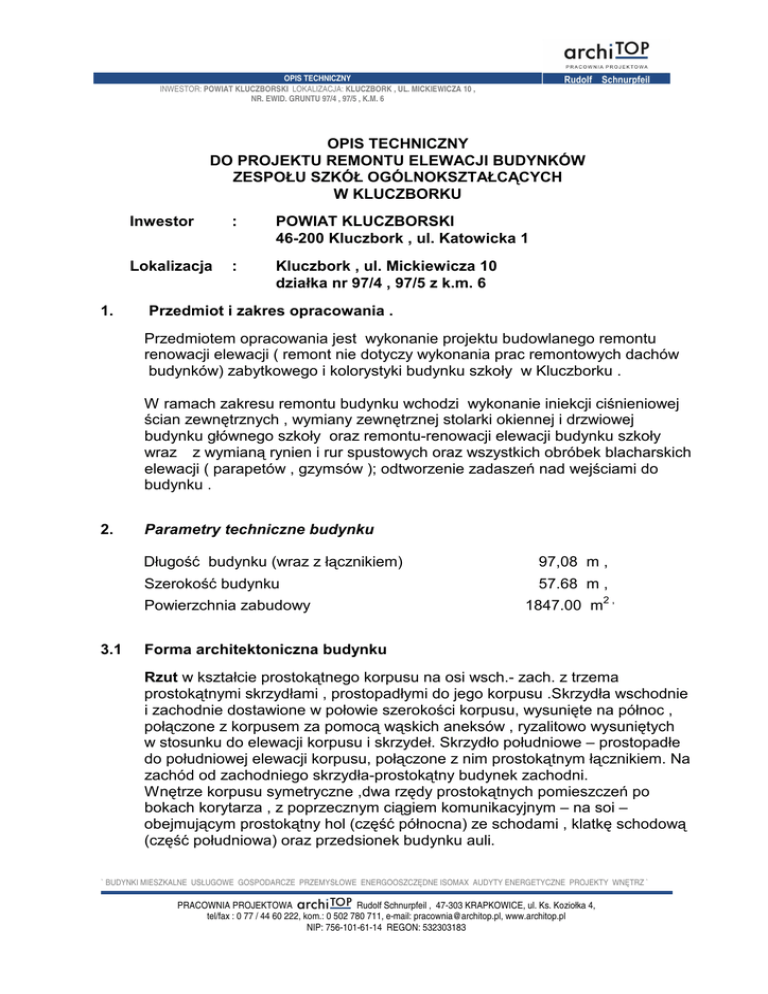 OPIS TECHNICZNY INWESTOR: POWIAT KLUCZBORSKI LOKALIZACJA: KLUCZBORK , UL. MICKIEWICZA 10 , NR. EWID. GRUNTU 97/4 , 97/5 , K.M. 6 OPIS TECHNICZNY DO PROJEKTU REMONTU ELEWACJI BUDYNKÓW ZESPOŁU SZKÓŁ OGÓLNOKSZTAŁCĄCYCH W KLUCZBORKU 1. Inwestor : POWIAT KLUCZBORSKI 46-200 Kluczbork , ul. Katowicka 1 Lokalizacja : Kluczbork , ul. Mickiewicza 10 działka nr 97/4 , 97/5 z k.m. 6 Przedmiot i zakres opracowania . Przedmiotem opracowania jest wykonanie projektu budowlanego remontu renowacji elewacji ( remont nie dotyczy wykonania prac remontowych dachów budynków) zabytkowego i kolorystyki budynku szkoły w Kluczborku . W ramach zakresu remontu budynku wchodzi wykonanie iniekcji ciśnieniowej ścian zewnętrznych , wymiany zewnętrznej stolarki okiennej i drzwiowej budynku głównego szkoły oraz remontu-renowacji elewacji budynku szkoły wraz z wymianą rynien i rur spustowych oraz wszystkich obróbek blacharskich elewacji ( parapetów , gzymsów ); odtworzenie zadaszeń nad wejściami do budynku . 2. Parametry techniczne budynku Długość budynku (wraz z łącznikiem) 97,08 m , Szerokość budynku 57.68 m , Powierzchnia zabudowy 3.1 1847.00 m2 , Forma architektoniczna budynku Rzut w kształcie prostokątnego korpusu na osi wsch.- zach. z trzema prostokątnymi skrzydłami , prostopadłymi do jego korpusu .Skrzydła wschodnie i zachodnie dostawione w połowie szerokości korpusu, wysunięte na północ , połączone z korpusem za pomocą wąskich aneksów , ryzalitowo wysuniętych w stosunku do elewacji korpusu i skrzydeł. Skrzydło południowe – prostopadłe do południowej elewacji korpusu, połączone z nim prostokątnym łącznikiem. Na zachód od zachodniego skrzydła-prostokątny budynek zachodni. Wnętrze korpusu symetryczne ,dwa rzędy prostokątnych pomieszczeń po bokach korytarza , z poprzecznym ciągiem komunikacyjnym – na soi – obejmującym prostokątny hol (część północna) ze schodami , klatkę schodową (część południowa) oraz przedsionek budynku auli. ` BUDYNKI MIESZKALNE USŁUGOWE GOSPODARCZE PRZEMYSŁOWE ENERGOOSZCZĘDNE ISOMAX AUDYTY ENERGETYCZNE PROJEKTY WNĘTRZ ` PRACOWNIA PROJEKTOWA Rudolf Schnurpfeil , 47-303 KRAPKOWICE, ul. Ks. Koziołka 4, tel/fax : 0 77 / 44 60 222, kom.: 0 502 780 711, e-mail: [email protected], www.architop.pl NIP: 756-101-61-14 REGON: 532303183 OPIS TECHNICZNY INWESTOR: POWIAT KLUCZBORSKI LOKALIZACJA: KLUCZBORK , UL. MICKIEWICZA 10, NR. EWID. GRUNTU 97/4, 97/5 , K.M. 6 Budynek auli w 1/3 długości od południa – węŜszy; w jego przyziemiu- sala gimnastyczna szkoły podstawowej , dostępna od strony południowej ; na piętrze – duŜe, jednoprzestrzenne wnętrze z częścią węŜszą zagospodarowania drewnianym podestem , zaakcentowaną w układzie stropu. Skrzydło wschodnie komunikacyjne połączone korpusem , podzielone na dwa trakty pomieszczeń , z wydzielonym dodatkowym korytarzem – w trakcie zachodnim. Skrzydło zachodnie –jednotraktowe , z osobną dwubiegową klatką schodową. Budynek zachodni – prostokątny , z prostokątnym ryzalitem pośrodku fasady, poprzedzonym podcieniowym gankiem; wnętrze dwutraktowe, z klatką schodową pośrodku części północnej. Bryła - mocno rozczłonkowany , rozłoŜysty , wieloskrzydłowy budynek, podpiwniczony (oprócz auli). Korpus trójkondygnacyjny , podpiwniczony, z dwuosiowym ryzalitem pośrodku fasady. Dach dwuspadowy ; część środkowa ściany północnej , odpowiadająca ośmiu środkowym osiom okiennym (łącznie z dwuosiowym ryzalitem) , podwyŜszona ok. 0,5 m nad poziom dachu , nakryta osobnym daszkiem trójpołaciowym. Ryzalit zwieńczony murkiem attykowym. Skrzydła boczne dwukondygnacyjne , ustawione prostopadle do osi korpusu , nakryte dwuspadowymi dachowymi. Łączniki między korpusem a skrzydłami zróŜnicowane w wysokości : od strony północnej – dwukondygnacyjne , od strony południowej – trójkondygnacyjne , nakryte płaskimi dachami , wysunięte ryzalitowo w stosunku do bocznych elewacji korpusu oraz – do elewacji skrzydeł. Budynek auli – o wysokości równej wysokości korpusu, dwukondygnacyjny , nakryty dwuspadowym dachem , w 1/3 długości od południa – nieco niŜszy i węŜszy. Między nim a korpusem przebiega niski, dwukondygnacyjny łącznik , nakryty kolebkowym stropodachem. Budynek zachodni – dwukondygnacyjny , z prostokątnym , mocno wysuniętym trójkondygnacyjnym ryzalitem pośrodku fasady. Nakryty wysokim dachem dwuspadowym , pośrodku połaci północnej przerwanym dwuspadowym daszkiem nad ryzalitem. Ryzalit poprzedzonym parterowym , prostokątnym gankiem wspartym na dwóch słupach. W elewacji południowej, odsłonięta kondygnacja piwnic. Budynek połączony ze skrzydłem zachodnim za pomocą wąskiego łącznika przebiegającego na wysokości pierwszego piętra. Elewacje – symetryczne , komponowane za pomocą gęstego rytmu otworów okiennych , zróŜnicowanych w obrębie poszczególnych kondygnacji oraz lizen artykułujących górne kondygnacje. Szary tynk fakturalny skontrastowany z jaśniejszym gładkim tynkiem podziałów; okna zaakcentowane jaśniejszym kolorem węgarów. Partia cokołowa – ceglana , przepruta oknami piwnic . Parter – bez podziałów , wydzielony szerokim , płaskim gzymsem, osłoniętym okapem. W zwieńczeniu ścian – wyładowany gzyms. BUDYNKI MIESZKALNE USŁUGOWE GOSPODARCZE PRZEMYSŁOWE ENERGOOSZCZĘDNE ISOMAX AUDYTY ENERGETYCZNE PROJEKTY WNĘTRZ PRACOWNIA PROJEKTOWA Rudolf Schnurpfeil , 47-303 KRAPKOWICE, ul. Ks. Koziołka 4, tel/fax : 0 77 / 44 60 222, kom.: 0 502 780 711, e-mail: [email protected], www.architop.pl NIP: 756-101-61-14 REGON: 532303183 OPIS TECHNICZNY INWESTOR: POWIAT KLUCZBORSKI LOKALIZACJA: KLUCZBORK , UL. MICKIEWICZA 10, NR. EWID. GRUNTU 97/4, 97/5 , K.M. 6 Fasada korpusu : czternastoosiowa łącznie z dwuosiowym ryzalitem pośrodku. okna parteru – szerokie , trójdzielne, wykrojone w łuk odcinkowy, podobnie jak dwudzielne okna pięter ( w trzeciej kondygnacji