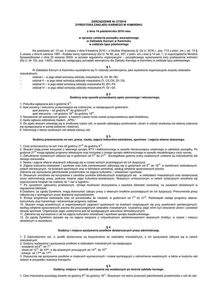 ZARZĄDZENIE Nr 27/2016 DYREKTORA ZAKŁADU KARNEGO W KAMIŃSKU z dnia 14 października 2016 roku w sprawie ustalenia porządku wewnętrznego w Zakładzie Karnym w Kamińsku w oddziale typu półotwartego Na podstawie art. 13 ust. 3 ustawy z dnia 9 kwietnia 2010 r. o Służbie Więziennej (tj. Dz.U. 2016 r., poz. 713 z późn. zm.), art. 73 § 2 ustawy z dnia 6 czerwca 1997 - Kodeks karny wykonawczy (Dz.U. Nr 90, poz. 557, z późn. zm.) oraz § 14 ust. 1 i 2 rozporządzenia Ministra Sprawiedliwości z dnia 25 sierpnia 2003r. w sprawie regulaminu organizacyjno – porządkowego wykonywania kary pozbawienia wolności (Dz.U. Nr 152, poz. 1493), ustala się następujący porządek wewnętrzny dla Zakładu Karnego w Kamińsku w oddziale typu półotwartego: § 1. W Zakładzie Karnym w Kamińsku wyodrębnia się IV oddziały penitencjarne, jako wydzielone organizacyjnie zespoły oddziałów mieszkalnych: – oddział I – w jego skład wchodzą oddziały mieszkalne AI, AII, BI i BII, – oddział II – w jego skład wchodzą oddziały mieszkalne CI, CII,CIII, DI i DII, – oddział III – w jego skład wchodzą oddziały mieszkalne EI, EII i FII, – oddział IV – w jego skład wchodzą oddziały mieszkalne FI, GI i GII. § 2. Godziny oraz sposób prowadzenia apelu porannego i wieczornego. 1. Pobudka ogłaszana jest o godzinie 610. 2. Apel poranny i wieczorny przeprowadza się codziennie, w następujących godzinach: apel poranny – od godziny 620 do godziny 645, apel wieczorny – od godziny 1820 do godziny 1845, 3. Niezależnie od wskazanych godzin, w każdym czasie może zostać przeprowadzony apel dodatkowy. 4. Apele ogłasza oddziałowy hasłem ,,APEL”. 5. Do apelu skazani ustawiają się w środkowej części celi, w sposób ułatwiający przeliczenie, ubrani w odzież skarbową lub własną (zabrania się występowania w samej pidżamie i bieliźnie). 6. Informację o stanie osobowym celi składa starszy celi. § 3. Godziny przeznaczone na sen, pracę, naukę, zajęcia kulturalno-oświatowe, sportowe i zajęcia własne skazanego. 1. Czas przeznaczony na sen trwa od godziny 2100 do godziny 610. 2. Skazani mają prawo korzystać z własnego sprzętu RTV i elektronicznego w sposób nienaruszajacy ustalonego w zakładzie porządku. Po godzinie 2100 mogą oglądać programy telewizyjne oraz korzystać z innego sprzętu elektronicznego w sposób niezakłócający ciszy nocnej. 3. Zatrudnienie osadzonych odbywa się w godzinach od 515 do 2100 . Szczegółowe godziny pracy osadzonych ustalane są indywidualnie dla danego stanowiska. 4. Nauka i zajęcia własne skazanych odbywają się w czasie wolnym pozostającym do ich dyspozycji. 5. Zajęcia kulturalno-oświatowe i sportowe oraz koła zainteresowań odbywają się w godzinach od 800 do 1800 w świetlicach oddziałowych, salach rekreacyjnych, na boiskach sportowych oraz w bibliotece centralnej, według odrębnie opracowanych planów. Zabrania się wynoszenia jakichkolwiek przedmiotów na zajęcia kulturalno – oświatowe i sportowe. 6. Skazanym umożliwia się korzystanie z zasobów punktów bibliotecznych znajdujących się w oddziałach mieszkalnych oraz dostarczanej przez administrację prasy, podczas trwania zajęć kulturalno-oświatowych. Skazanym umieszczonym w celach izolacyjnych umożliwia się wypożyczanie książek nie rzadziej niż 1 raz w tygodniu. 7. Po uprzednim zgłoszeniu przełożonym, istnieje możliwość skorzystania z zasobów biblioteki centralnej, na zasadach określonych w regulaminie biblioteki. 8.Osadzeni, za zgodą Dyrektora, mogą dokonywać zakupu prasy z własnych środków pozostających do ich dyspozycji. Prenumerata prasy odbywa się z wymaganym przez dostawcę wyprzedzeniem. 9. Emisja programów radiowęzła trwa od poniedziałku do niedzieli, w godzinach od 730 do 2100. Radiowęzeł nadaje programy własne, komunikaty oraz transmituje i retransmituje programy radiowe. 10. Skazani mogą uczestniczyć w organizowanych zajęciach sportowych na boiskach znajdujących się przy pawilonach penitencjarnych, według odrębnie opracowanych planów dla poszczególnych oddziałów mieszkalnych. Uczestnicy zajęć winni być stosownie ubrani i posiadać obuwie sportowe. Organizacja zajęć uzależniona jest od występujących warunków atmosferycznych. 11. Zabrania się wynoszenia z cel na zajęcia kulturalno–oświatowe i sportowe sprzętu kwaterunkowego. 12. Za zgodą Dyrektora zezwala się na zajęcia związane z indywidualnymi zainteresowaniami skazanych (hobby), w czasie i miejscu określonym w zezwoleniu. § 4. Godziny i miejsce spożywania posiłków dostarczanych przez administrację. 1. Z Zastrzeżeniem ust. 3, posiłki dostarczane są bezpośrednio do oddziałów mieszkalnych, a ich spożywanie odbywa się w celach mieszkalnych. 2. Godziny wydawania i spożywania posiłków w oddziałach mieszkalnych są następujące: - śniadanie od 650 do 715 - obiad od 1215 do 13ºº, a dla skazanych pracujących od 1445 do 1520 - kolacja od 17ºº do 17³º. 3. Dopuszcza się spożywanie posiłków w miejscach wyznaczonych i czasie wynikającym z zatrudnienia osadzonych, a także w budynku sali widzeń w przypadku realizacji transportu. § 5. Godziny, miejsce i sposób poruszania się osadzonych po terenie zakładu karnego. 1. Cele mieszkalne pozostają otwarte od godziny 645 do godziny 1810. Skazanym nie wolno przenosić jakichkolwiek przedmiotów z celi do celi. 2. Skazani zobowiązani są do przebywania w celach mieszkalnych, zgodnie z ich rozmieszczeniem, w czasie: - apeli, - kąpieli, - kontroli, - wydania posiłków, - na polecenie przełożonych. 3. Ruch osadzonych po terenie zakładu karnego odbywa się przez całą dobę, w sposób zorganizowany i pod dozorem. 4. Skazani w czasie poruszania się po terenie jednostki występują w odzieży skarbowej, tj. odzież wierzchnia: kurtka zimowa skarbowa, bluza skarbowa, spodnie skarbowe i obuwiu stosownym do pory roku. Z zastrzeżeniem ust. 5. 5. Skazani mog