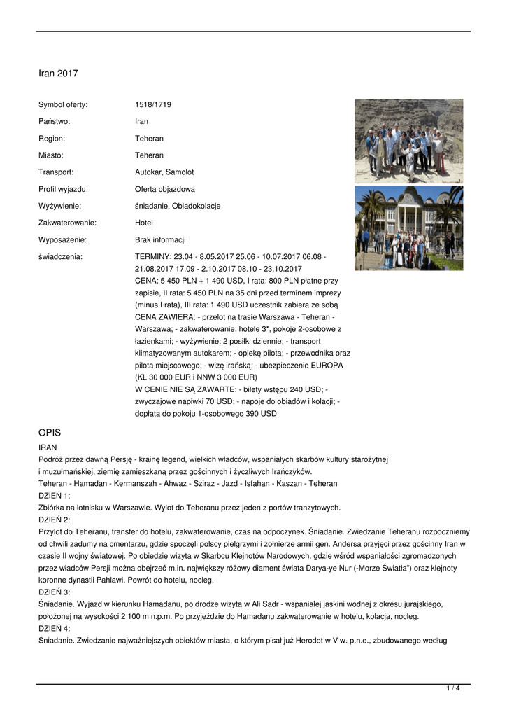 Iran 2017 Symbol oferty: 1518/1719 Państwo: Iran Region: Teheran Miasto: Teheran Transport: Autokar, Samolot Profil wyjazdu: Oferta objazdowa Wyżywienie: śniadanie, Obiadokolacje Zakwaterowanie: Hotel Wyposażenie: Brak informacji świadczenia: TERMINY: 23.04 - 8.05.2017 25.06 - 10.07.2017 06.08 21.08.2017 17.09 - 2.10.2017 08.10 - 23.10.2017 CENA: 5 450 PLN + 1 490 USD, I rata: 800 PLN płatne przy zapisie, II rata: 5 450 PLN na 35 dni przed terminem imprezy (minus I rata), III rata: 1 490 USD uczestnik zabiera ze sobą CENA ZAWIERA: - przelot na trasie Warszawa - Teheran - Warszawa; - zakwaterowanie: hotele 3*, pokoje 2-osobowe z łazienkami; - wyżywienie: 2 posiłki dziennie; - transport klimatyzowanym autokarem; - opiekę pilota; - przewodnika oraz pilota miejscowego; - wizę irańską; - ubezpieczenie EUROPA (KL 30 000 EUR i NNW 3 000 EUR) W CENIE NIE SĄ ZAWARTE: - bilety wstępu 240 USD; - zwyczajowe napiwki 70 USD; - napoje do obiadów i kolacji; dopłata do pokoju 1-osobowego 390 USD OPIS IRAN Podróż przez dawną Persję - krainę legend, wielkich władców, wspaniałych skarbów kultury starożytnej i muzułmańskiej, ziemię zamieszkaną przez gościnnych i życzliwych Irańczyków. Teheran - Hamadan - Kermanszah - Ahwaz - Sziraz - Jazd - Isfahan - Kaszan - Teheran DZIEŃ 1: Zbiórka na lotnisku w Warszawie. Wylot do Teheranu przez jeden z portów tranzytowych. DZIEŃ 2: Przylot do Teheranu, transfer do hotelu, zakwaterowanie, czas na odpoczynek. Śniadanie. Zwiedzanie Teheranu rozpoczniemy od chwili zadumy na cmentarzu, gdzie spoczęli polscy pielgrzymi i żołnierze armii gen. Andersa przyjęci przez gościnny Iran w czasie II wojny światowej. Po obiedzie wizyta w Skarbcu Klejnotów Narodowych, gdzie wśród wspaniałości zgromadzonych przez władców Persji można obejrzeć m.in. największy różowy diament świata Darya-ye Nur (-Morze Światła”) oraz klejnoty koronne dynastii Pahlawi. Powrót do hotelu, nocleg. DZIEŃ 3: Śniadanie. Wyjazd w kierunku Hamadanu, po drodze wizyta w Ali Sadr - wspaniałej jaskini wodnej z okresu jurajskiego, położonej na wysokości 2 100 m n.p.m. Po przyjeździe do Hamadanu zakwaterowanie w hotelu, kolacja, nocleg. DZIEŃ 4: Śniadanie. Zwiedzanie najważniejszych obiektów miasta, o którym pisał już Herodot w V w. p.n.e., zbudowanego według 1/4 dawnych założeń z czasów Medów, zwanego Hegmatane - mauzoleum -Księcia Uczonych” z X/XI w. - Awicenny, który wywarł wielki wpływ na naukę europejską, szczególnie medycynę, świętego dla żydów miejsca - mauzoleum Estery i Mordechaja, których historię związaną z historią Persji opowiada biblijna Księga Estery. Chwila oddechu pod wodospadem w pięknej dolinie Abbas Abad, gdzie po raz pierwszy spotkamy się z pismem klinowym starożytnej Persji, inskrypcjami królów z VI/V w p.n.e., umieszczonymi w miejscu zwanym Gandż Nameh (-Księga Skarbów”). Po drodze do miasta Kermanszah wizyta na terenie dawnej świątyni bogini słodkich wód - Anahity w Kangavar, przystanek przy skale Behistun, ważnym miejscu z historii Persji, gdzie obejrzymy Heraklesa Partyjskiego (II w.) oraz wyrytą w skale autobiografię największego króla starożytnej Persji - Dariusza. Zwiedzanie Tak-e Bustan, reliefów wykonanych w skalnych grotach za panowania dynastii Sasanidów (III-VI w.). Zakwaterowanie w hotelu, kolacja, nocleg. DZIEŃ 5: Po wczesnym śniadaniu wyjazd w kierunku Ahwazu, podziwianie różnorodnych krajobrazów, od pokrytych roślinnością wzgórz poprzez wspaniałą dolinę rzeki Karche oraz księżycowy krajobraz pocięty kanionami po wjeździe do prowincji Chuzestan. Obiad. Zwiedzanie miasta Szusz, znanego w starożytności jako Suza, stolica Elamu, a następnie dynastii Achemenidów. Oglądanie pozostałości Apadany, sali tronowej króla Dariusza, a następnie dla chętnych spacer wkoło zamku z pilotem, który pokaże miejsce znalezienia tzw. Kodeksu Hammurabiego oraz wbudowane w mury z XIX w. cegły z napisami klinowymi pochodzące ze starożytnej Suzy. Wizyta na dziedzińcu mauzoleum biblijnego proroka Daniela (wejście do środka w zależności od udostępnienia). Przejazd do Czogha Zambil, zwiedzanie największej atrakcji w regionie - elamickiego zigguratu z XIII w. p.n.e. Przyjazd do Ahwazu, miasta położonego nad największą rzeką Iranu - Karunem, zakwaterowanie w hotelu, nocleg. DZIEŃ 6: Wczesna pobudka, śniadanie i wyjazd do Szirazu. Przejazd wzdłuż pól naftowych, gdzie zobaczymy płonące -świeczki” (zakaz fotografowania instalacji naftowych). Obiad. Następnie zatrzymamy się w Biszapur, gdzie po zwycięstwie nad Rzymianami król Szapur I wybudował miasto (III w.) i więził tam cesarza Waleriana oraz utrwalił swoje sukcesy na skalnych reliefach wzdłuż brzegu rzeki. Przejazd przez wspaniałe góry Zagros, przystanek przy znaczącym w historii Persji miejscu zwanym Abu’l-Hayat. Zakwaterowanie w hotelu w Szirazie, nocleg. DZIEŃ 7: Śniadanie. Całodzienna wycieczka do jednej z największych atrakcji Iranu - Persepolis, do którego Europejczycy dotarli już w XVII w. Zwiedzanie pozostałości dawnej stolicy ceremonialnej największego imperium świata starożytnego, m.in. Bramy Wszystkich Narodów, Sali 100 Kolumn, Apadany, pałaców Dariusza i Kserksesa. Zwiedzanie reliefów skalnych w Naksz-e Radżab oraz przejazd do perskiej Doliny Królów - Naksz-e Rustam, gdzie znajdują się groby skalne wielkich władców starożytnej Persji, a także wspaniałe reliefy z okresu Sasanidów. Obiad. Przejazd do Pasargade, pierwszej stolicy Achemenidów, założonej przez Cyrusa II Wielkiego, twórcę potęgi perskiej, gdzie zobaczymy grobowiec władcy oraz pozostałości pałaców i świątyń. Powrót do Szirazu na nocleg.. DZIEŃ 8: Po śniadaniu oglądanie Bramy Koranu, pod którą przejdziemy, aby sprzyjało nam szczęście jak dawnym podróżnym. Następnie wizyta w Ogrodzie Eram, spacer alejkami i podziwianie oryginalnych roślin pochodzących 