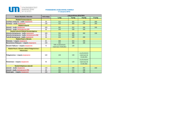 POSIEDZENIE UCZELNIANEJ KOMISJI 17 sierpnia 2015r. Nazwa Wydziału i Kierunku Wydział Farmaceutyczny Analityka medyczna – studia stacjonarne Farmacja – studia stacjonarne Wydział Lekarski Lekarski – studia stacjonarne Lekarski – studia niestacjonarne (W) Wydział Lekarski Oddział Stomatologiczny Lekarsko-dentystyczny - studia stacjonarne Lekarsko-dentystyczny - studia niestacjonarne (W) Techniki dentystyczne - studia stacjonarne Wydział Nauk o Zdrowiu Dietetyka - I stopnia stacjonarne Ratownictwo Medyczne - I stopnia stacjonarne Zdrowie Publiczne - I stopnia stacjonarne limit miejsc I próg próg punktowy 2015/2016 II próg III próg IV próg 50 128 312 312 282 300 278 296 268 290 340 60 362 336 352 330 348 328 346 108 36 48 354 312 254 346 308 249 340 338 85 150 368 252 130; uruchomienie rejestracji 14.08.2015 353 200 348 160 75 240 130 Wydział Nauk o Zdrowiu oddział Pielęgniarstwa i Położnictwa Pielęgniarstwo - I stopnia stacjonarne 160 140 130 uruchomienie rejestracji do 31.08.2015 Położnictwo - I stopnia stacjonarne 96 140 120 uruchomienie rejestracji do 31.08.2016 Wydział Wojskowo-Lekarski Lekarski - studia stacjonarne Lekarski - studia niestacjonarne (W) Fizjoterapia - I stopnia stacjonarne 120 60 150 356 322 192 348 312 174 342 308 152 340