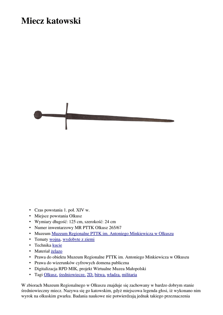 Miecz katowski • • • • • • • • • • • • Czas powstania 1. poł. XIV w. Miejsce powstania Olkusz Wymiary długość: 125 cm, szerokość: 24 cm Numer inwentarzowy MR PTTK Olkusz 265/67 Muzeum Muzeum Regionalne PTTK im. Antoniego Minkiewicza w Olkuszu Tematy wojna, wydobyte z ziemi Technika kucie Materiał żelazo Prawa do obiektu Muzeum Regionalne PTTK im. Antoniego Minkiewicza w Olkuszu Prawa do wizerunków cyfrowych domena publiczna Digitalizacja RPD MIK, projekt Wirtualne Muzea Małopolski Tagi Olkusz, średniowiecze, 2D, bitwa, władza, militaria W zbiorach Muzeum Regionalnego w Olkuszu znajduje się zachowany w bardzo dobrym stanie średniowieczny miecz. Nazywa się go katowskim, gdyż miejscowa legenda głosi, iż wykonano nim wyrok na olkuskim gwarku. Badania naukowe nie potwierdzają jednak takiego przeznaczenia prezentowanego eksponatu. Zgodnie z nimi miecz ten jest okazem broni bojowej, o lekkiej głowni służącej przede wszystkim do kłucia. Wykonanie nim dekapitacji (ścięcia głowy) jednym ciosem byłoby niezmiernie trudne. Miecze katowskie miały bowiem dwuręczną rękojeść, ciężką i niezbyt długą, ostrzoną na całej długości głownię o jednakowej szerokości oraz tępo zakończony sztych. Nawet tak ukształtowane specjalnie do „oddzielania głowy od ciała” narzędzie nie zapewniało pełnej skuteczności wykonania wyroku, którą dało dopiero wynalezienie gilotyny. Miecz olkuski nie mógł więc być narzędziem ścięcia nieszczęśnika na olkuskim rynku. Służył na polach bitwy, nie zaś w miejscach wykonywania wyroków. Według typologii średniowiecznych mieczy Ewarta Oakeshotta określany jest jako typ XVIa. Ma głownię zwężającą się ku sztychowi z obustronnym zbroczem do 1/3 długości. Na niej umieszczono znaki z żółtego metalu, a na rękojeści (półtoraręcznej z prostym jelcem i kolistą głowicą) — stempel miecznika. Jest dobrze wyważony, co pozwalało na dłuższą walkę, i na tyle długi, by skutecznie dosięgnąć przeciwnika. Opracowanie: Jacek Wilk (Muzeum Regionalne PTTK im. A. Minkiewicza w Olkuszu), Redakcja WMM, © wszystkie prawa zastrzeżone Miecz katowski — legenda czy artefakt? Choć w ocenie specjalistów określenie „katowski” nie odzwierciedla rzeczywistego przeznaczenia broni, według legendy wymierzono nim karę dwóm gwarkom, którzy chcąc okraść kościół Najświętszej Panny (wchodzący w skład rozebranego częściowo w XIX wieku opactwa Augustianów), naruszyli stabilność budowli. Według przekazów wisiał on w sali nieistniejącego ratusza, którego ślady odkryli niedawno archeolodzy podczas prac wykopaliskowych prowadzonych na olkuskim rynku (wciąż nie odnaleziono śladów Wielkiej Wagi, na której miejscowi gwarcy ważyli kruszce wydobyte w pobliskich wyrobiskach (zobacz odważnik górniczy, który znajduje się w zbiorach Wirtualnych Muzeów Małopolski). Po zburzeniu ratusza w XIX wieku miecz stał się dekoracją sali obrad magistratu. Opracowanie: Redakcja WMM, CCBY 3.0 PL Tagi: Muzeum Regionalne PTTK im. Antoniego Minkiewicza w Olkuszu, militaria, historia