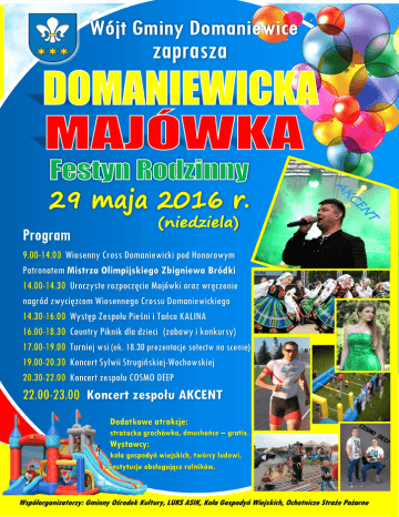 9.00-14.00 Wiosenny Cross Domaniewicki pod Honorowym Patronatem Mistrza Olimpijskiego Zbigniewa Bródki 14.00-14.30 Uroczyste rozpoczęcie Majówki oraz wręczenie nagród zwycięzcom Wiosennego Crossu Domaniewickiego 14.30-16.00 Występ Zespołu Pieśni i Tańca KALINA 16.00-18.30 Country Piknik dla dzieci (zabawy i konkursy) 17.00-19.00 Turniej wsi (ok. 18.30 prezentacje sołectw na scenie) 19.00-20.30 Koncert Sylwii Strugińskiej-Wochowskiej 20.30-22.00 Koncert zespołu COSMO DEEP 22.00-23.00 Koncert zespołu AKCENT Dodatkowe atrakcje: strażacka grochówka, dmuchańce – gratis. Wystawcy: koła gospodyń wiejskich, twórcy ludowi, instytucje obsługujące rolników. Współorganizatorzy: Gminny Ośrodek Kultury, LUKS ASIK, Koła Gospodyń Wiejskich, Ochotnicze Straże Pożarne