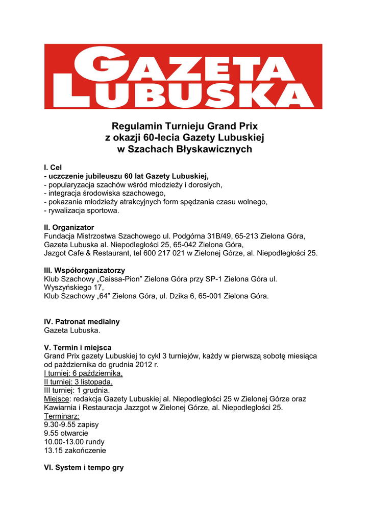 Regulamin Turnieju Grand Prix Gazety Lubuskiej w - Caissa-Pion